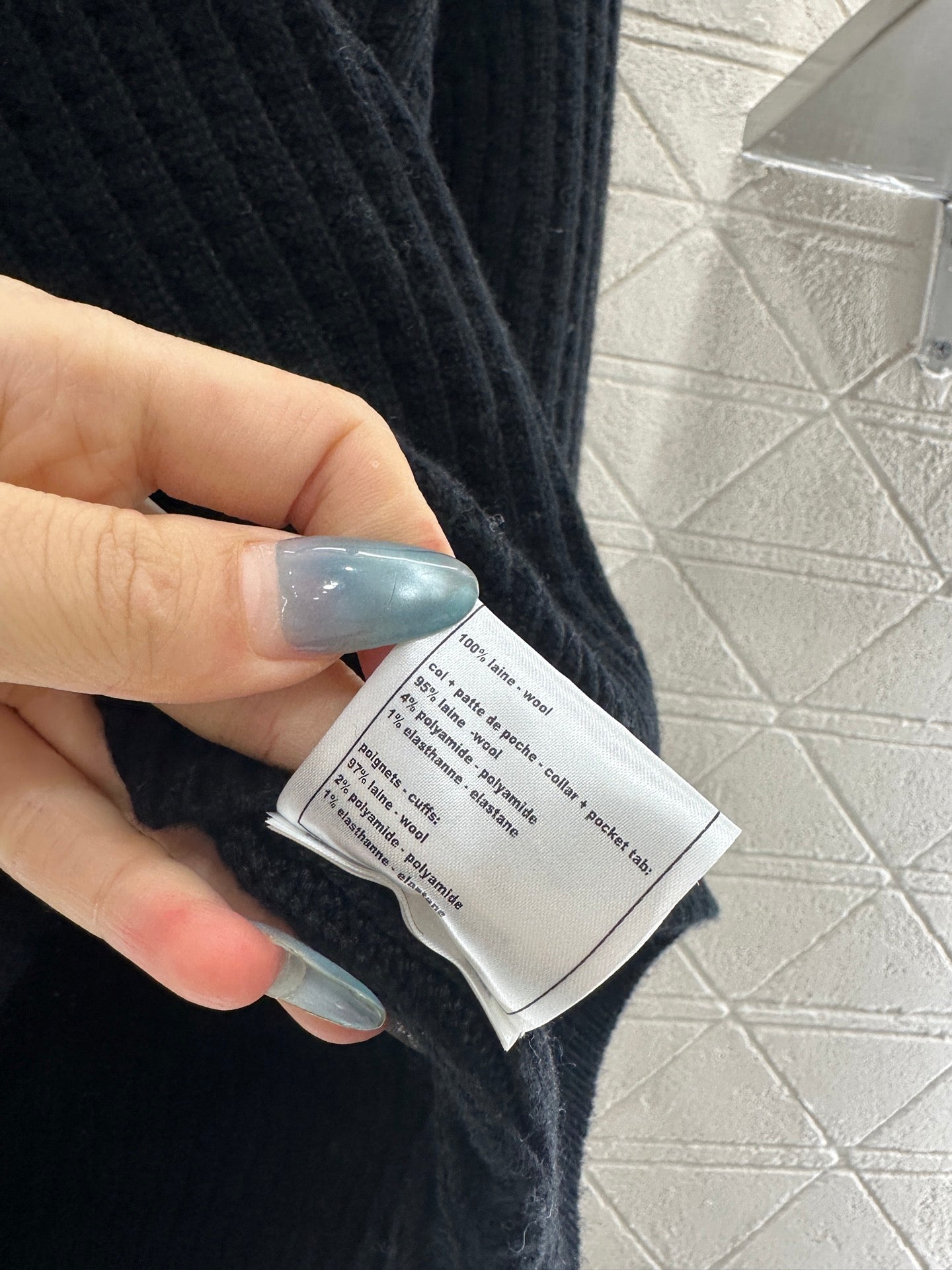 Woolen yarn weaving, delicate texture, comfortable to wear, V-neck off shoulder knitted sweater cut, vertical groove knitting texture throughout the body, forming a striped and visible feeling. The collar edge is matched with the cuffs and black and white stripes are interlaced and spliced. The back collar is embellished with embroidered letters and double C pattern logos, full of elasticity, rich color matching, clear hierarchy, and a shape that accommodates the body. It is fashionable to wear and reduce age