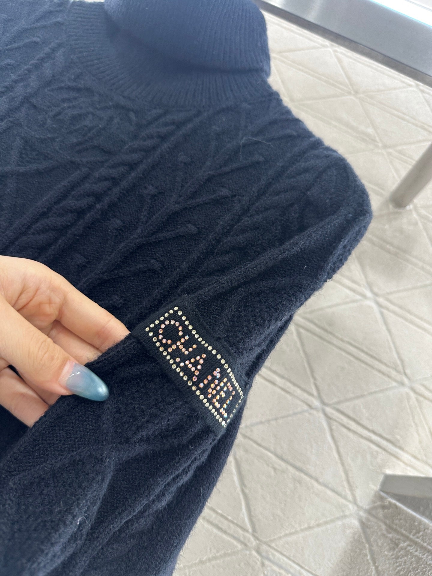 Weaved with cashmere and wool yarn, it is soft, delicate and comfortable in texture. High neck knitted bottoming top, vertically distributed Fried Dough Twists diamond pattern and other styles of crochet texture, create double C decoration in the middle, rich in design levels, and more slim with thread elastic binding. The letter logo of hot drilling process adorns the outside of the arm, showing the brand tonality, low-key texture, elastic fabric, fit the body, keep the upper body warm and thin