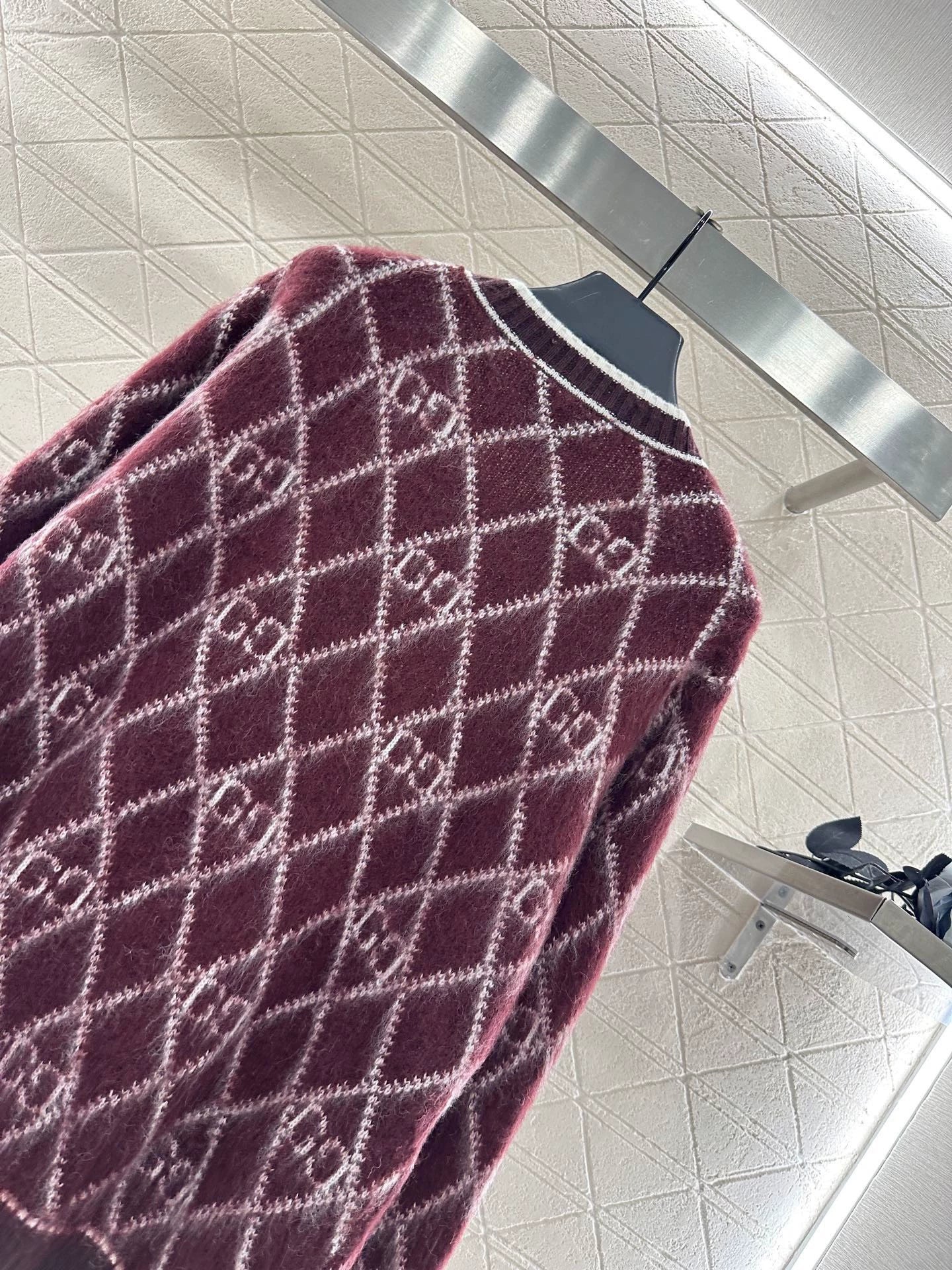 Woolen yarn weaving, delicate texture, comfortable and easy to wear, round neck oversized knitted cardigan cut, diamond grid pattern distribution throughout the body, combined with double G letter jacquard interweaving, edging to highlight in light color, collision with the body, matched with elastic fabric, accommodating the body shape and making it look slimmer. The front round buckle is decorated with engraved logos to showcase the brand's tone, versatile style does not choose age or skin color, more relaxed and vacation like, fashionable and stylish