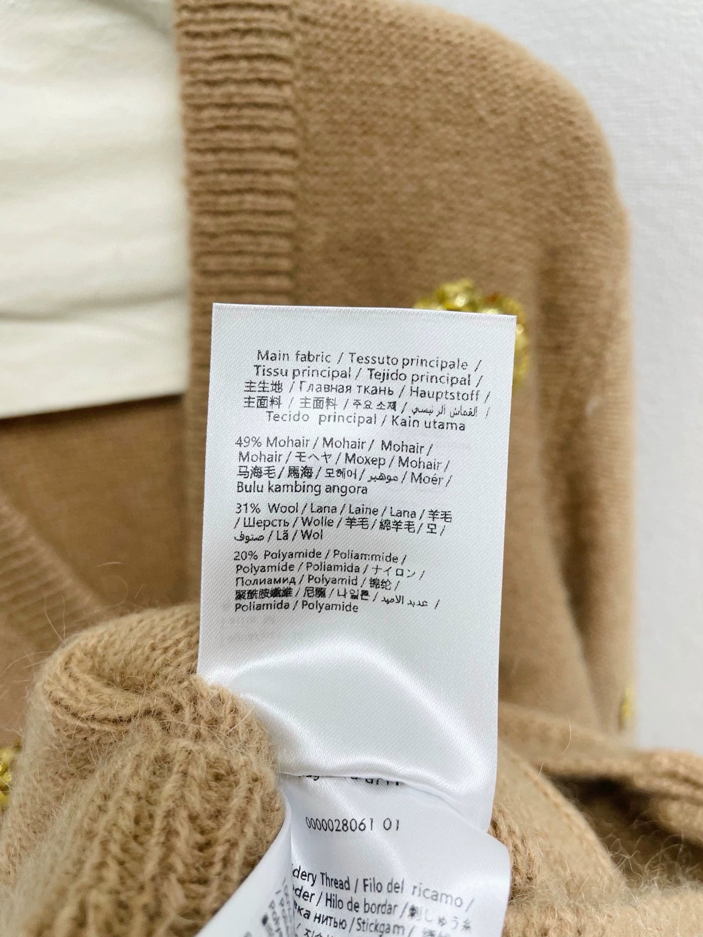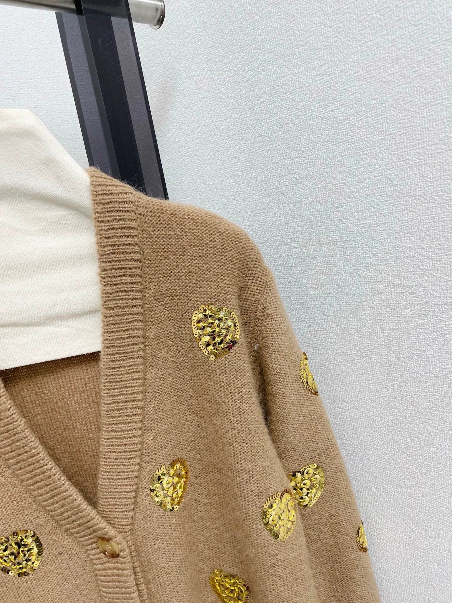 Heavy industry pearl shaped V-neck cardigan with gold heart sequin knit cardigan, vintage khaki color, exquisite heart decoration