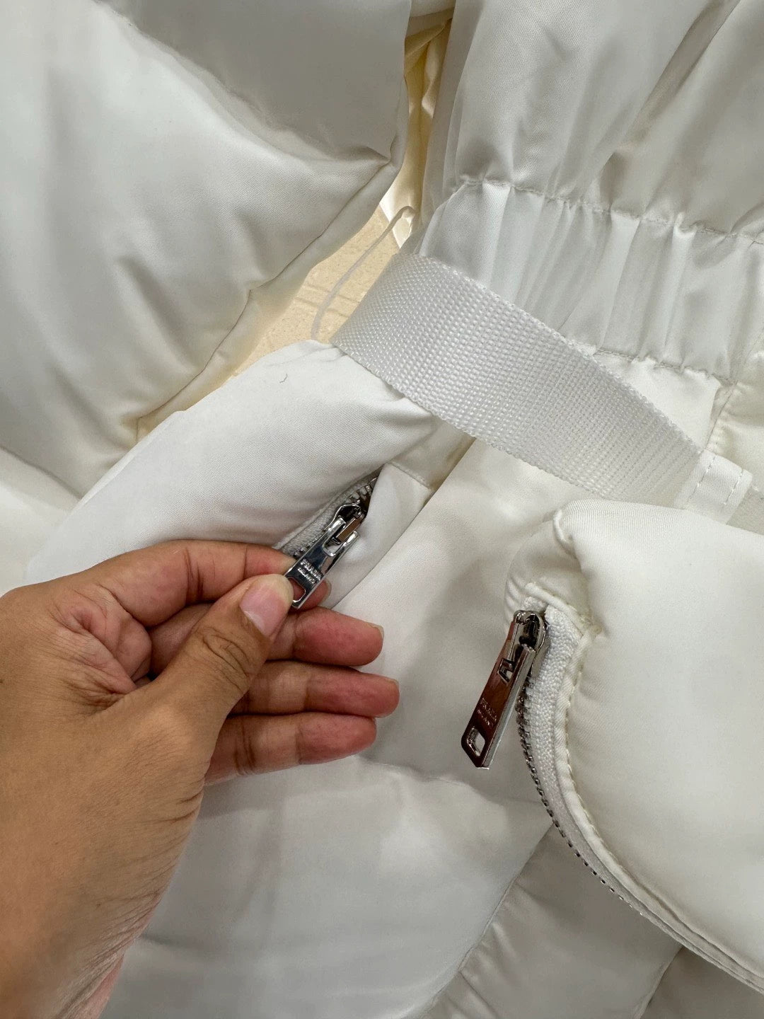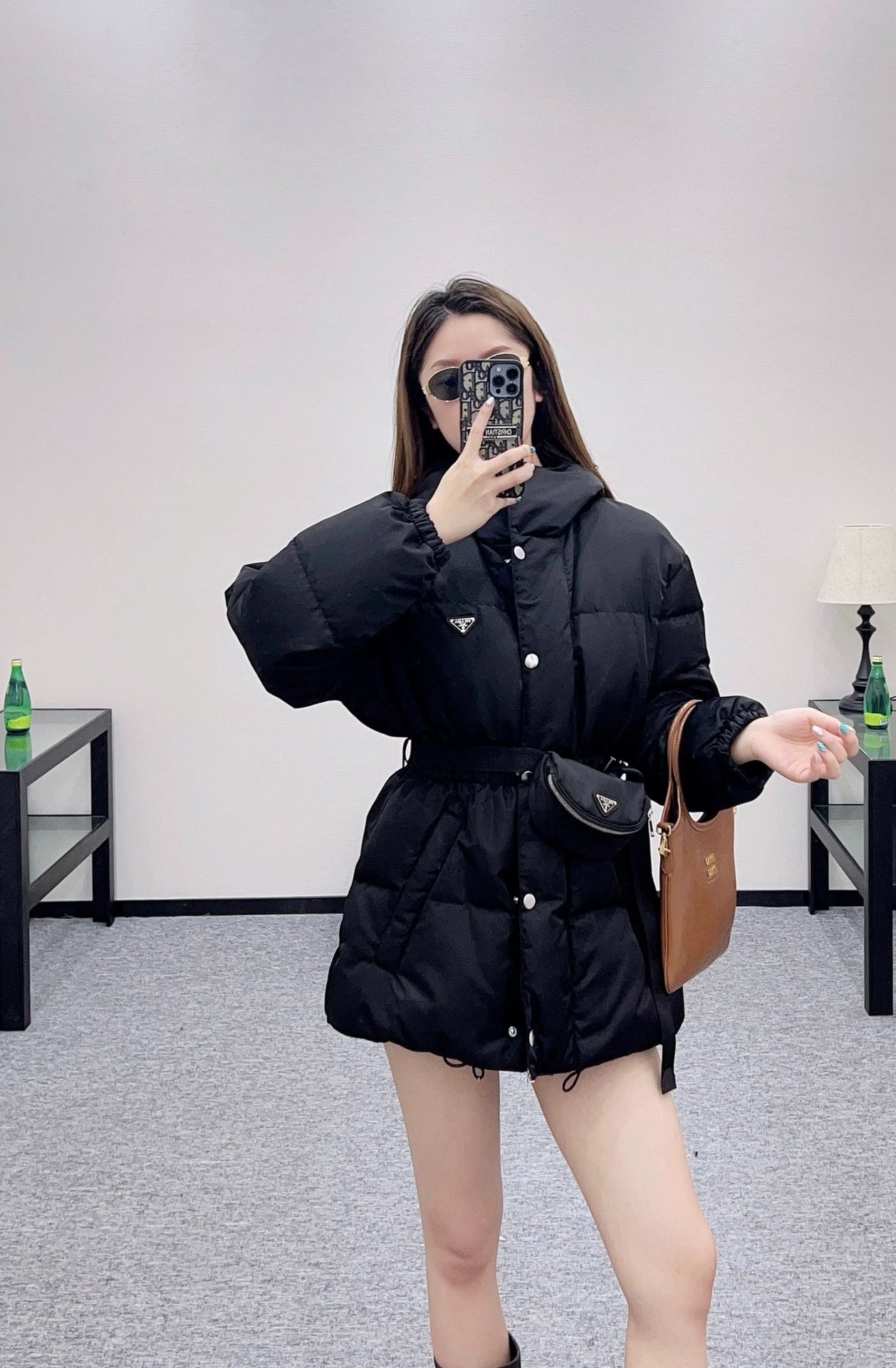 The entire lightweight and warm rectangular embossed chest is decorated with a classic metal triangle logo, showcasing the brand's low-key luxury. The hooded waist cinching cut not only keeps warm, but also successfully outlines the waistline, improves body proportions, and avoids bloating. It is paired with a series of waist bags to decorate and embellish the outfit, making it fashionable and stylish
