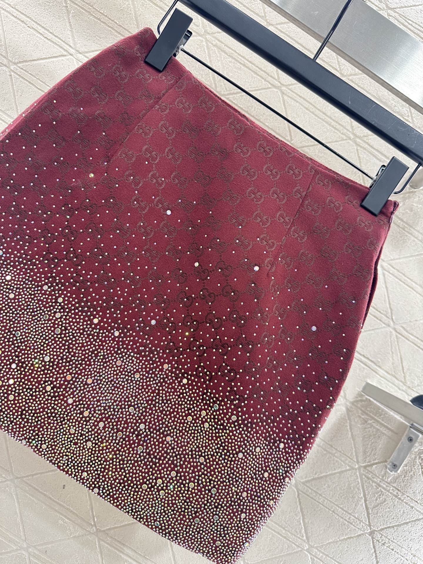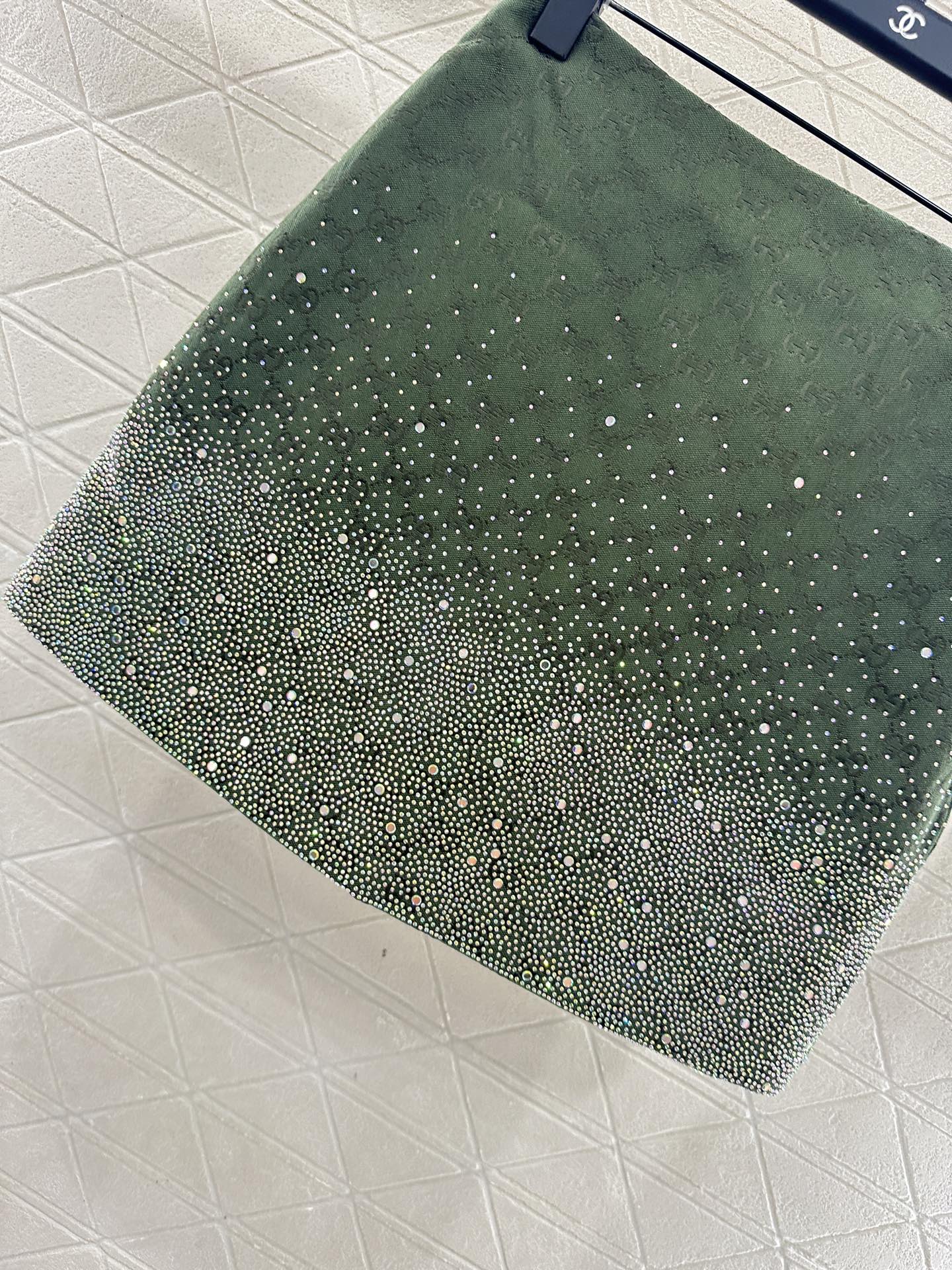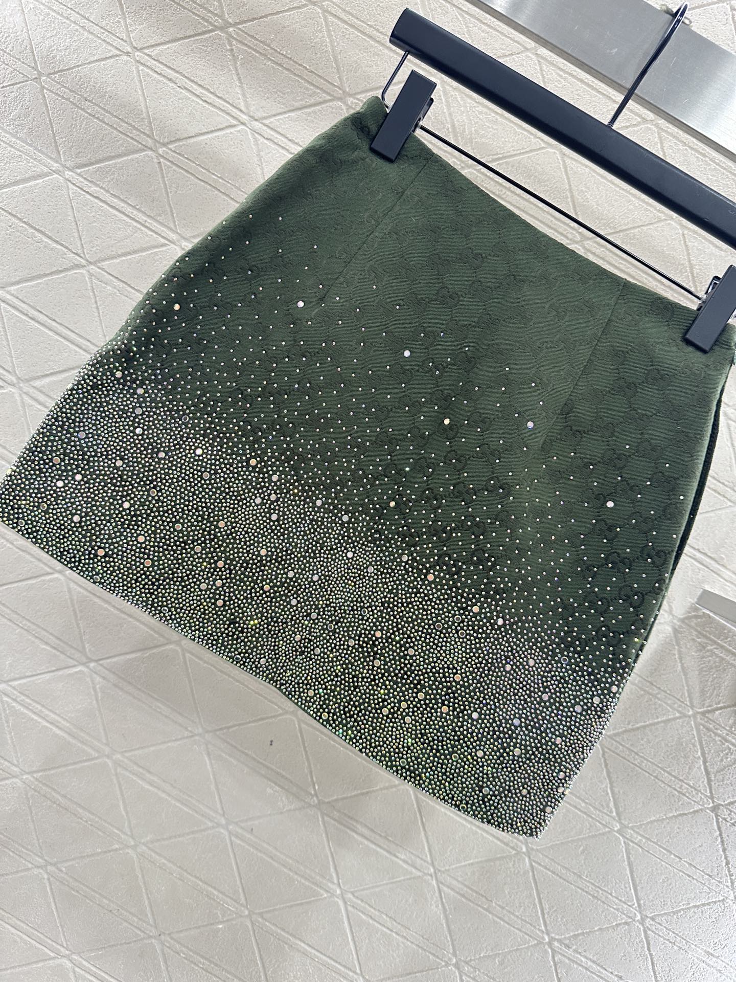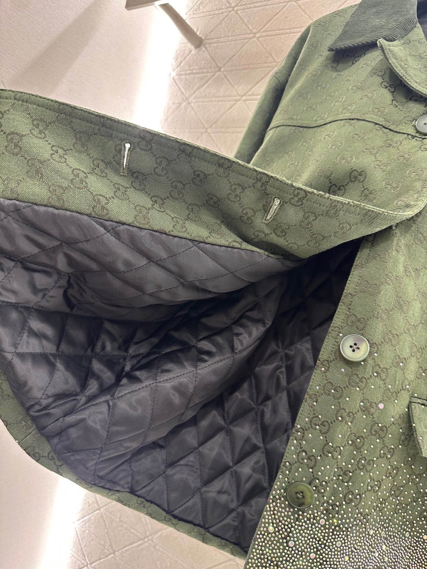Custom YB imported jacquard material, high-quality texture, crisp and stylish, lapel silhouette cotton jacket version, diamond embossed line inside, down cotton filling, warm and practical. The large body is printed with double G jacquard, with a peaked lapel and front buttons, the shape is high-end and crisp, the hem flap pockets are embellished with heavy hot diamonds, shining from close up and flashing with a gradient luster from a distance. The design is rich in layers, creating a brand-exclusive sweet and cool style. Paired with a straight-tube hip-hugging miniskirt from the same series, the details echo and enhance the aura. It is a must-have fashion item for autumn and winter.