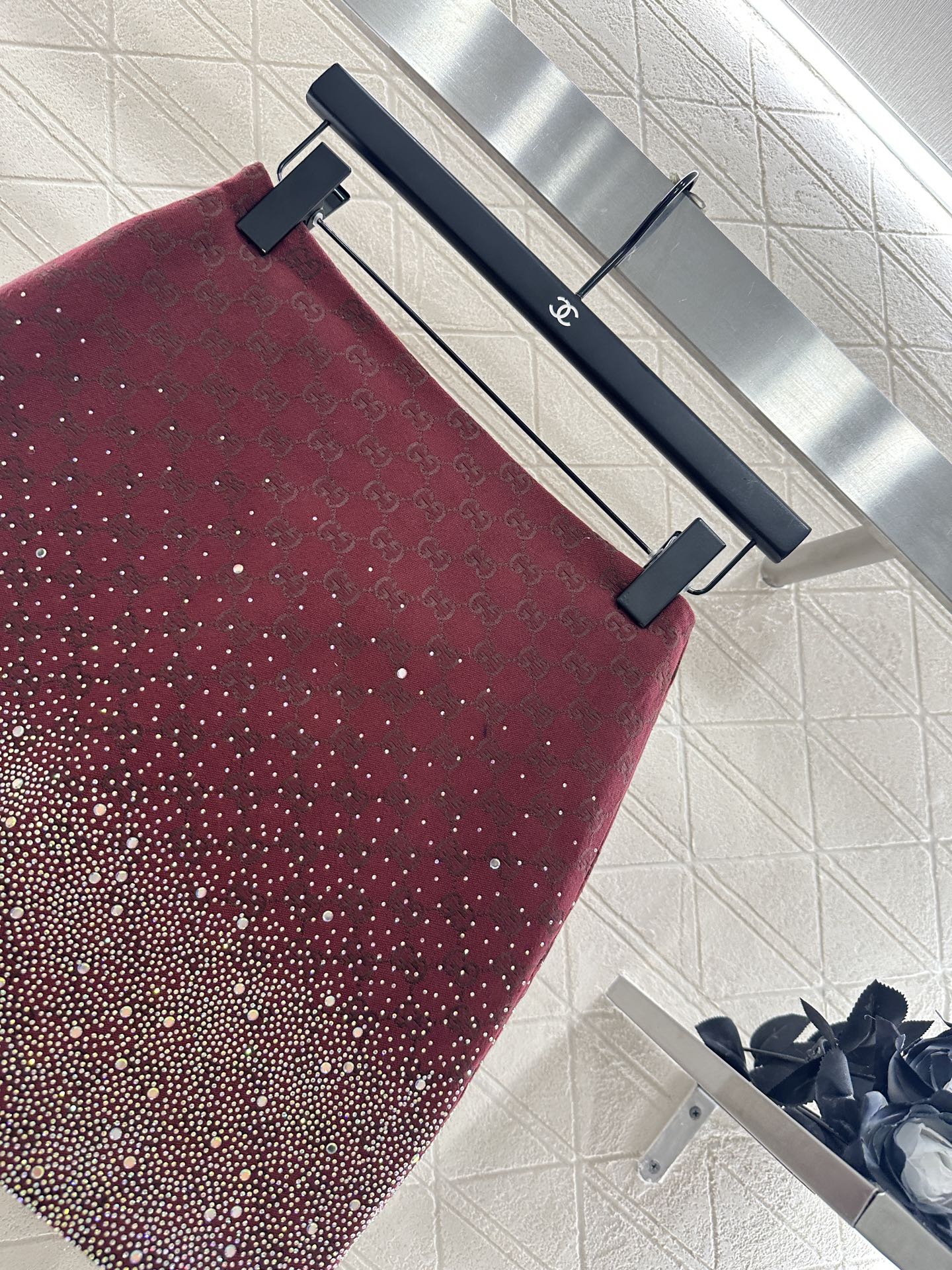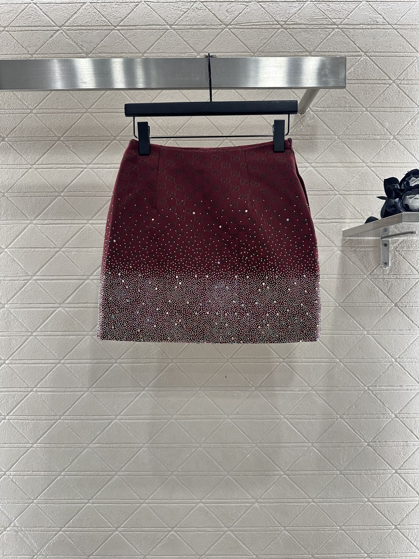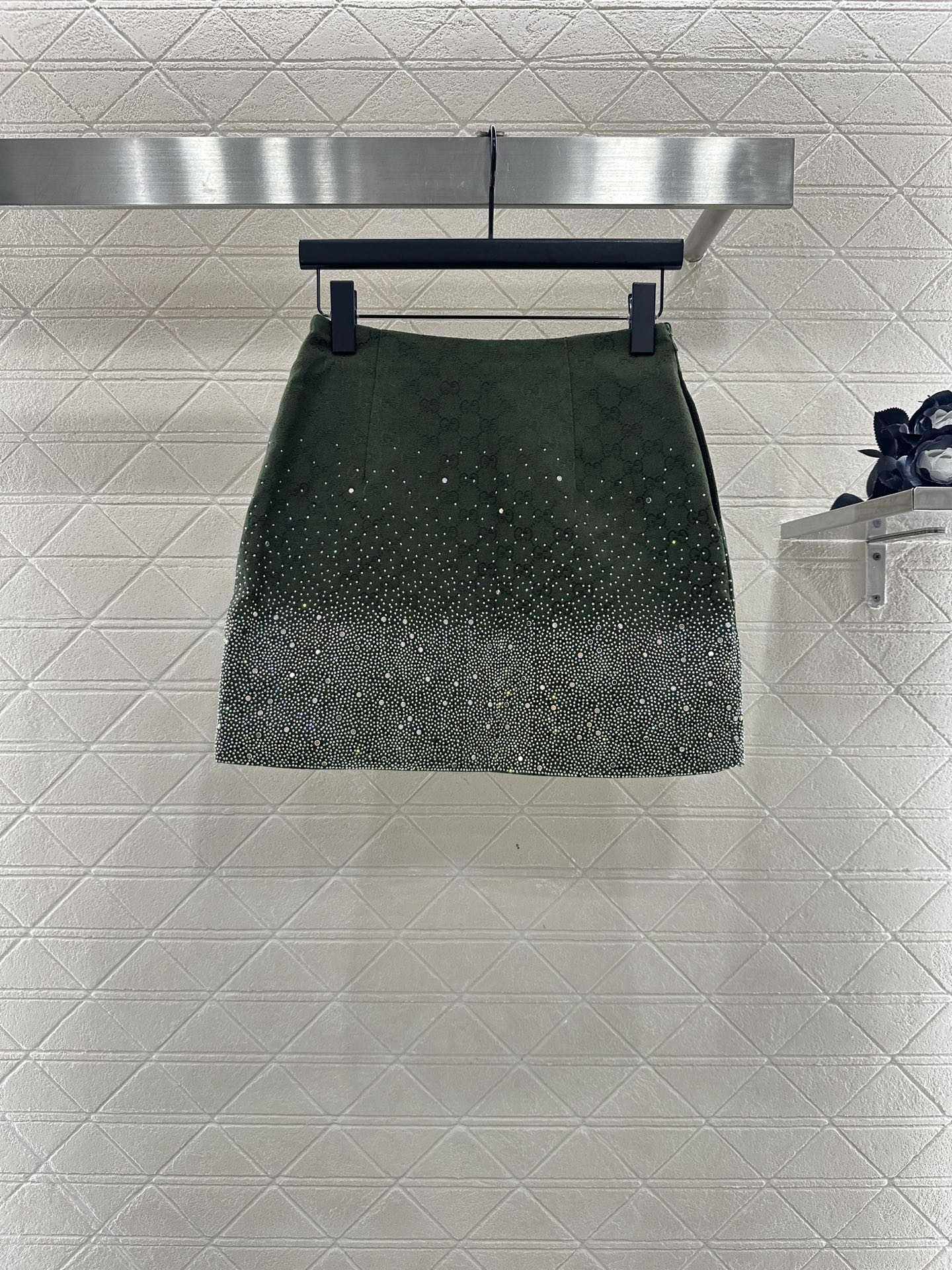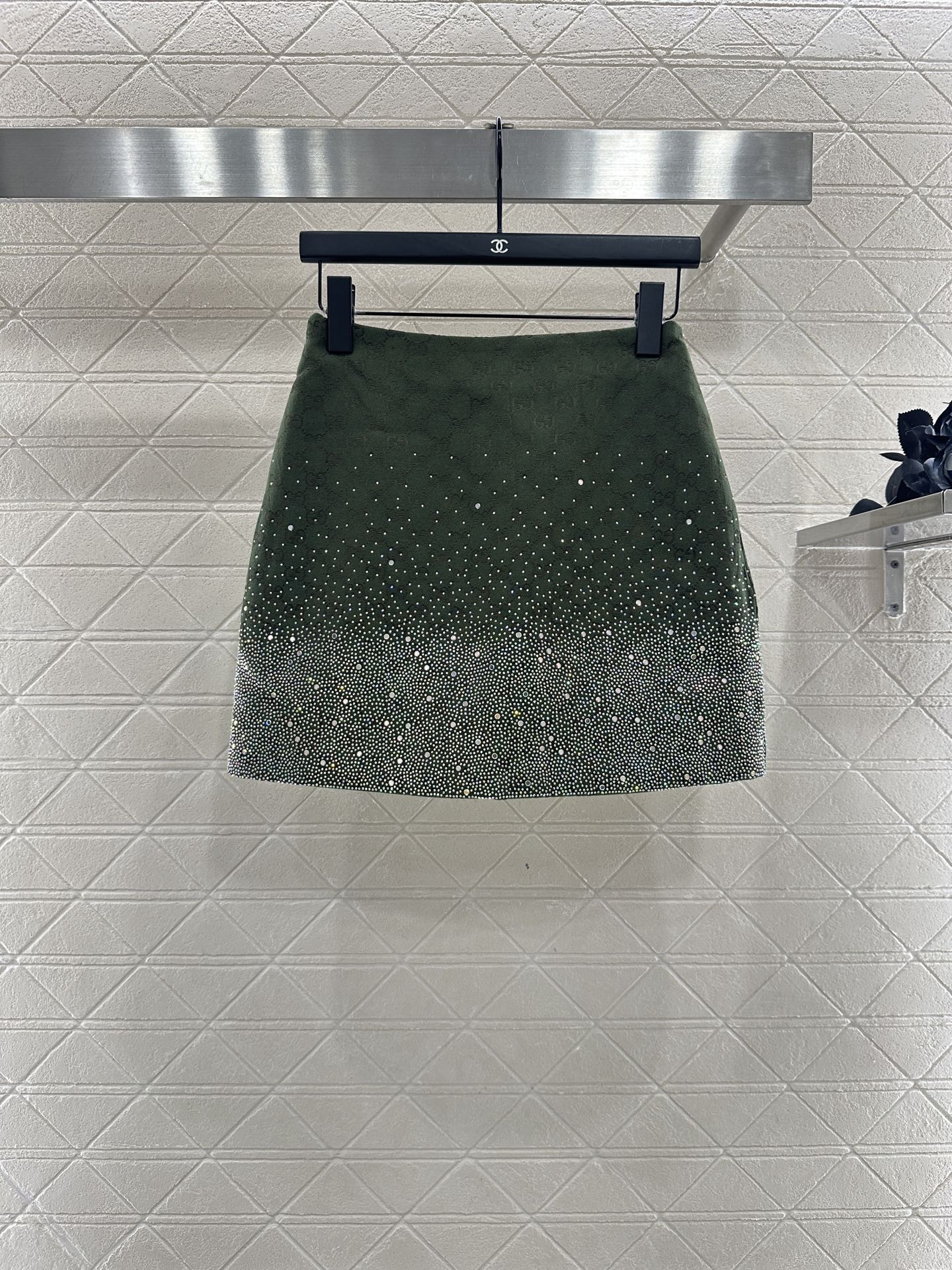Custom YB imported jacquard material, high-quality texture, crisp and stylish, lapel silhouette cotton jacket version, diamond embossed line inside, down cotton filling, warm and practical. The large body is printed with double G jacquard, with a peaked lapel and front buttons, the shape is high-end and crisp, the hem flap pockets are embellished with heavy hot diamonds, shining from close up and flashing with a gradient luster from a distance. The design is rich in layers, creating a brand-exclusive sweet and cool style. Paired with a straight-tube hip-hugging miniskirt from the same series, the details echo and enhance the aura. It is a must-have fashion item for autumn and winter.