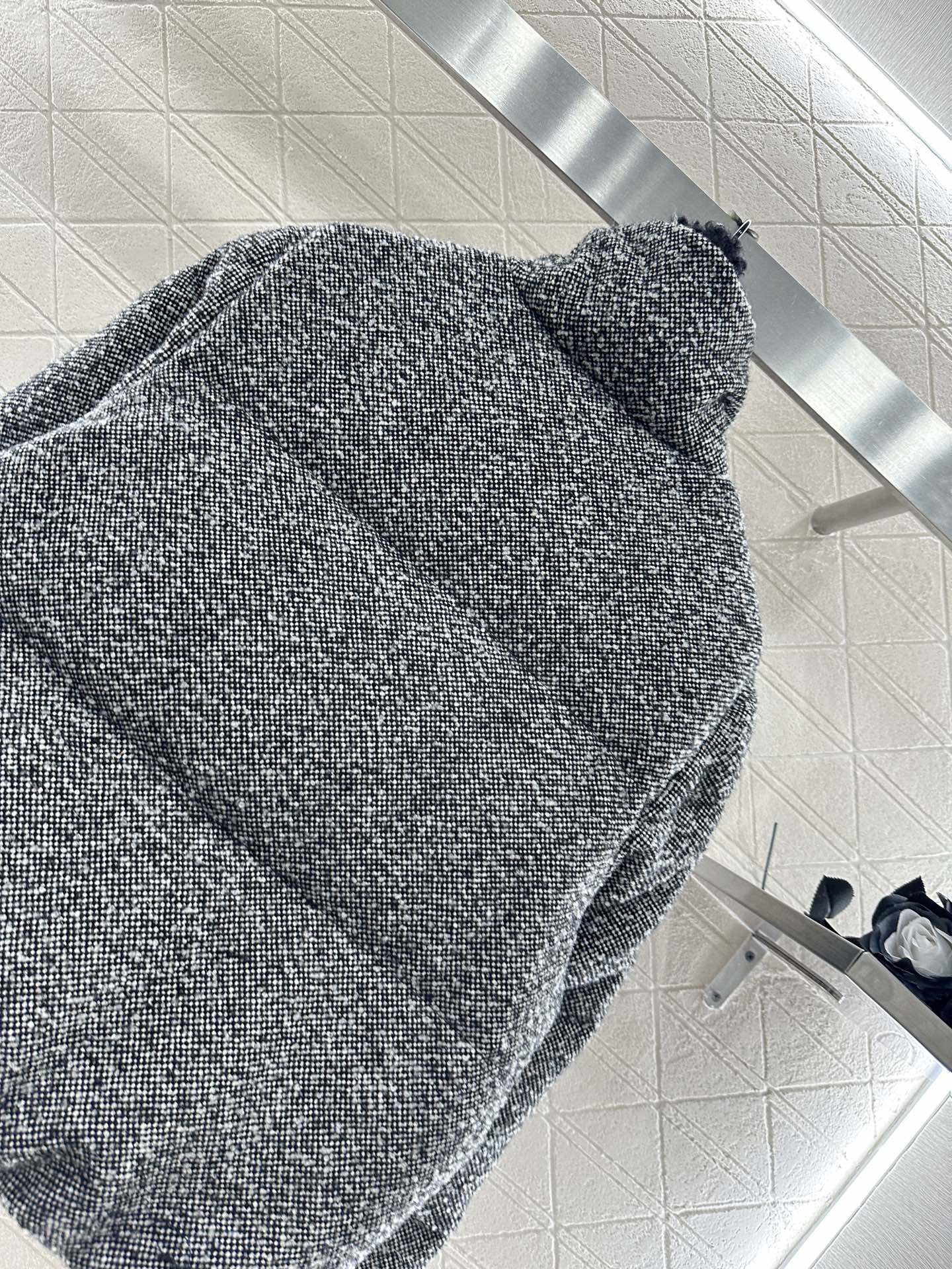 Cotton wool material, filled with white goose down lining, the whole piece is lightweight and warm. The stand up collar and lapel are paired with a down jacket, with rectangular embossed elements throughout the body. The intimate material adds autumn and winter charm, showcasing individuality and fashion charm. It is versatile in black and gray, with a zipper double slit for practical dressing. It is fashionable and stylish to match freely, with a loose silhouette and a cool and handsome upper body. Leather badge on the sleeve side, highlighting style.