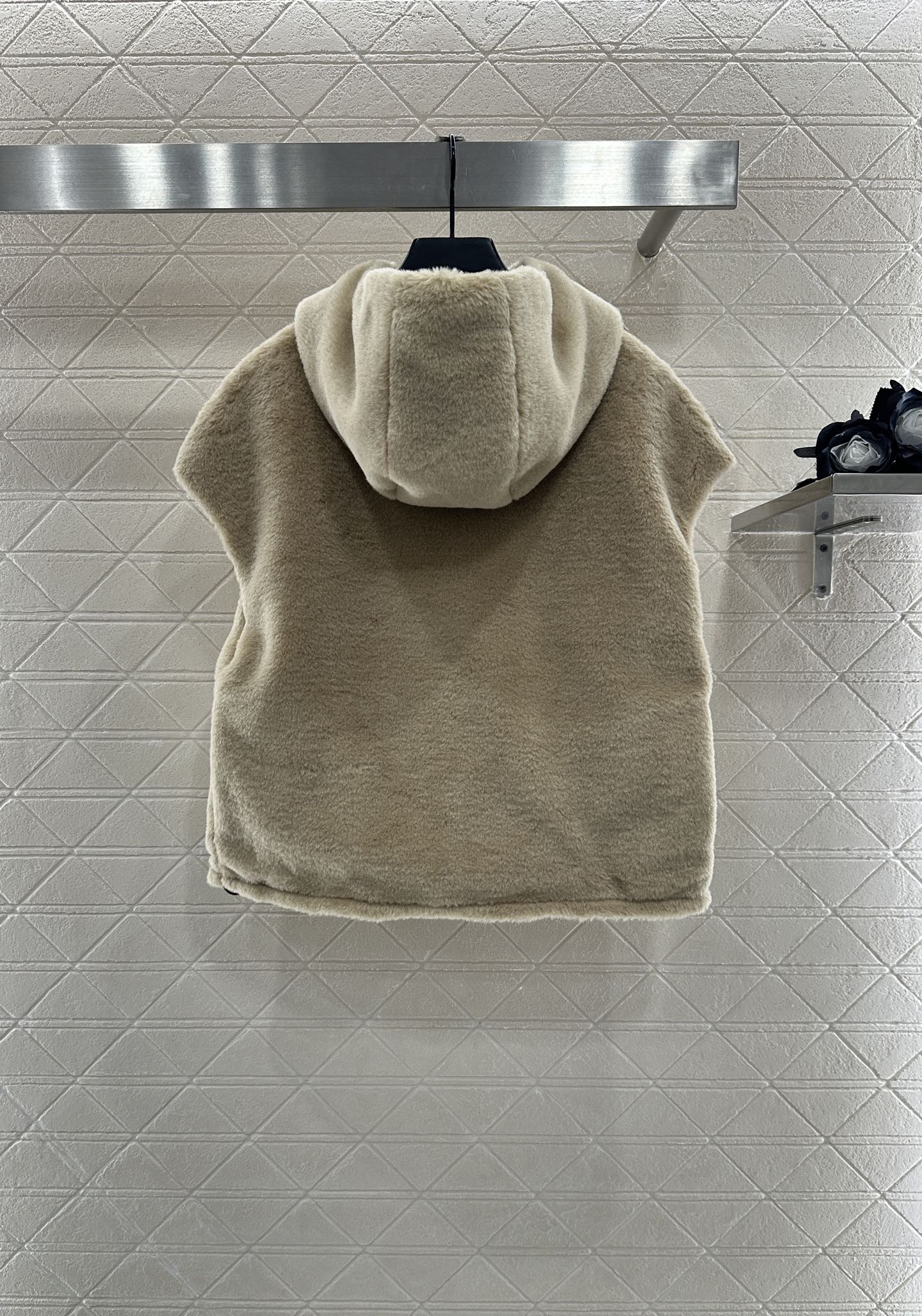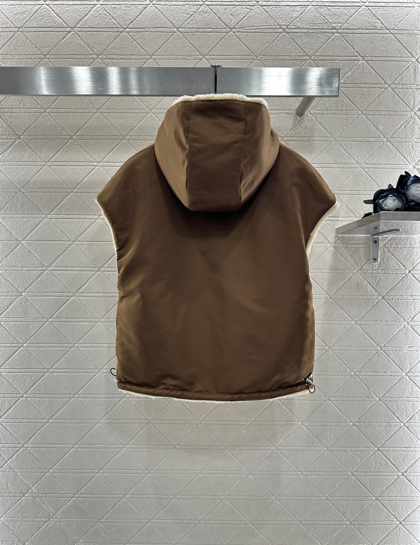 Adequate fur, windproof and warm, lightweight to wear and take off, hooded vest jacket, cut on both sides, designed with outer fur fur soft and skin friendly, fashionable and versatile to wear out a cute and charming girl's temperament. The other side is nylon smooth and dark brown, suitable for Maillard outfit. The chest letter logo highlights the brand style and adds fashionable colors. The drawstring is elastic and adjustable to fit more occasions and personal styles. The regular loose version is fashionable and inclusive, suitable for autumn and winter, with good material sense. The high-end layering creates infinite styling