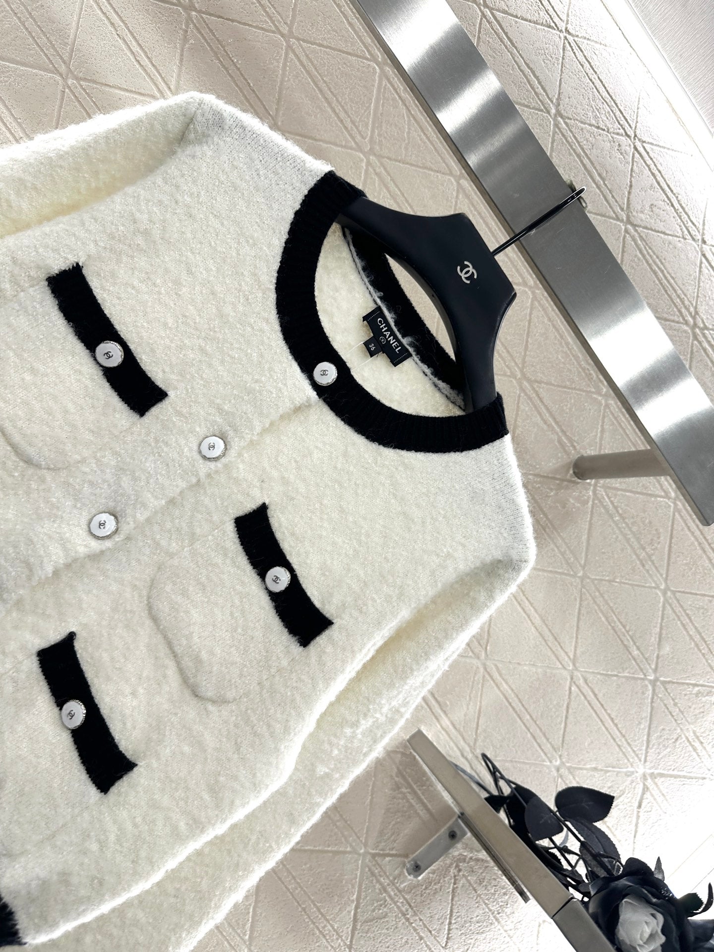 Woolen yarn weaving, glossy texture, soft and skin friendly, round neck knitted cardigan version, loose texture without losing fashion sense, whole body edge wrapped with black and white contrasting treatment, multiple pocket upper edges of the garment echo, whole body elastic thread tightened, combined with round buckle gloss and double C letter logo decoration, showing a playful and youthful style, elegant temperament, preferred for daily wear