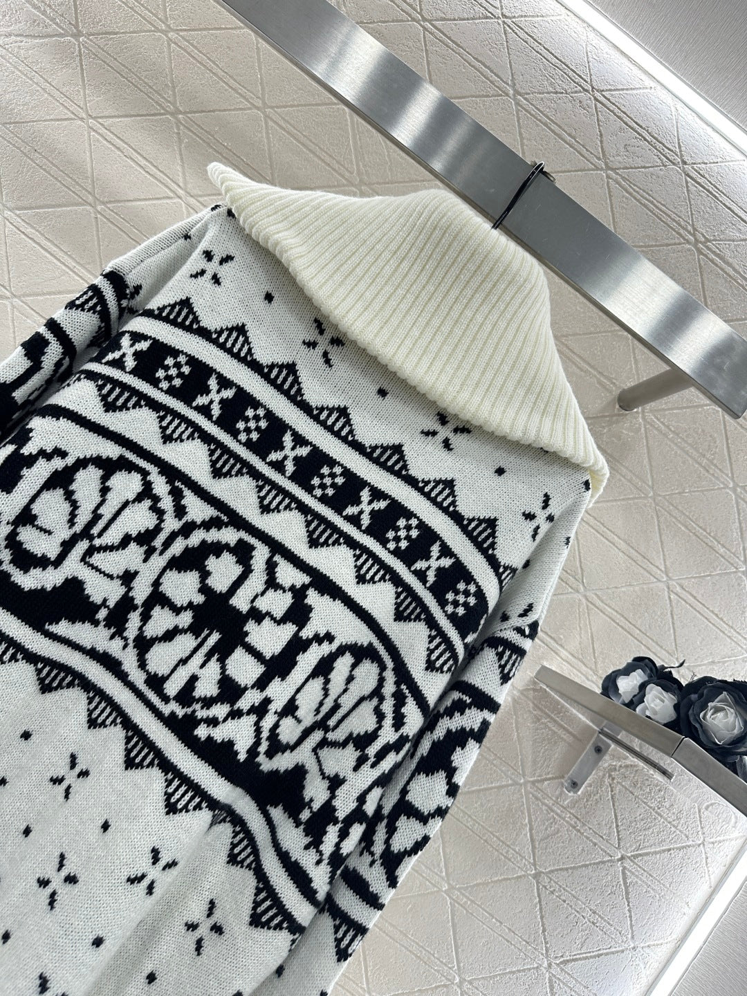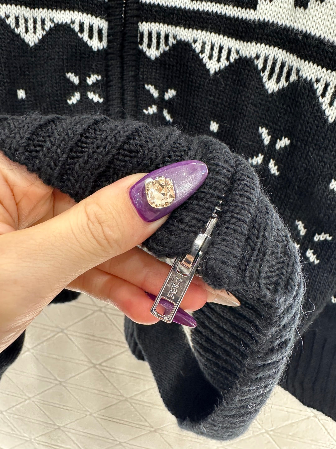 Woolen yarn weaving, premium texture, comfortable and soft, collar shaped knitted jacket cut, black and white staggered geometric contrasting color, snowflake Fel Island Nordic style pattern, highlighting warm and relaxed autumn and winter style, hem cuff threaded edging, elastic warmth, oversized shoulder boyfriend style, not picky about figure, wearing relaxed and stylish style