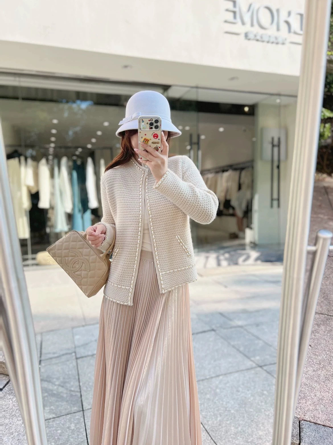 Round neck zipper is simple, elegant, and has a touch of retro style. The knitted texture is delicate, and the edges have exquisite stitching. The details are fully distributed, and the high waisted pants/skirts have a French romantic atmosphere