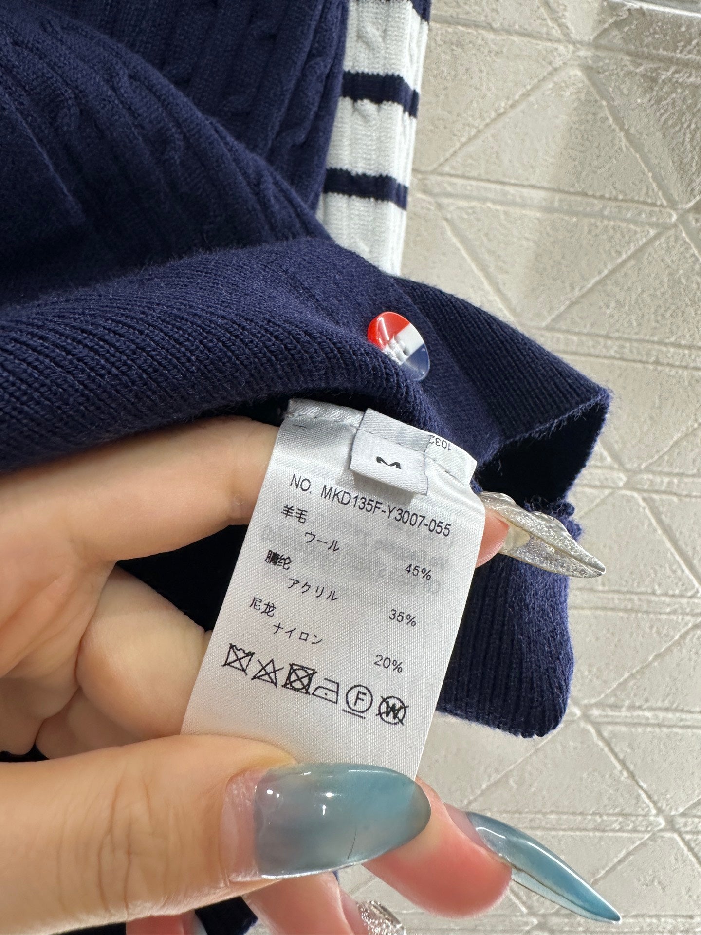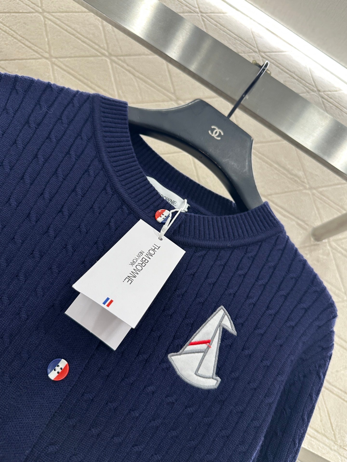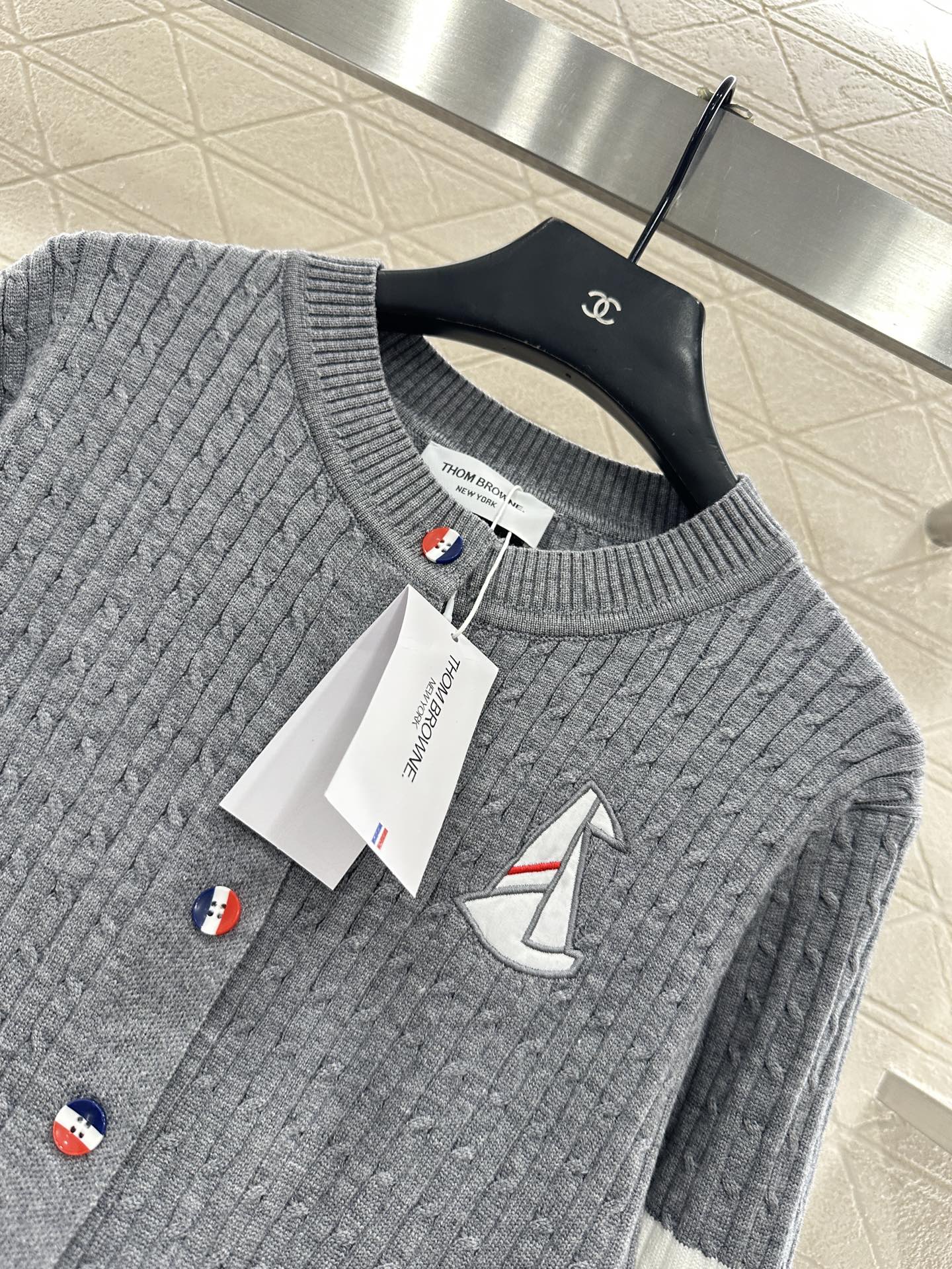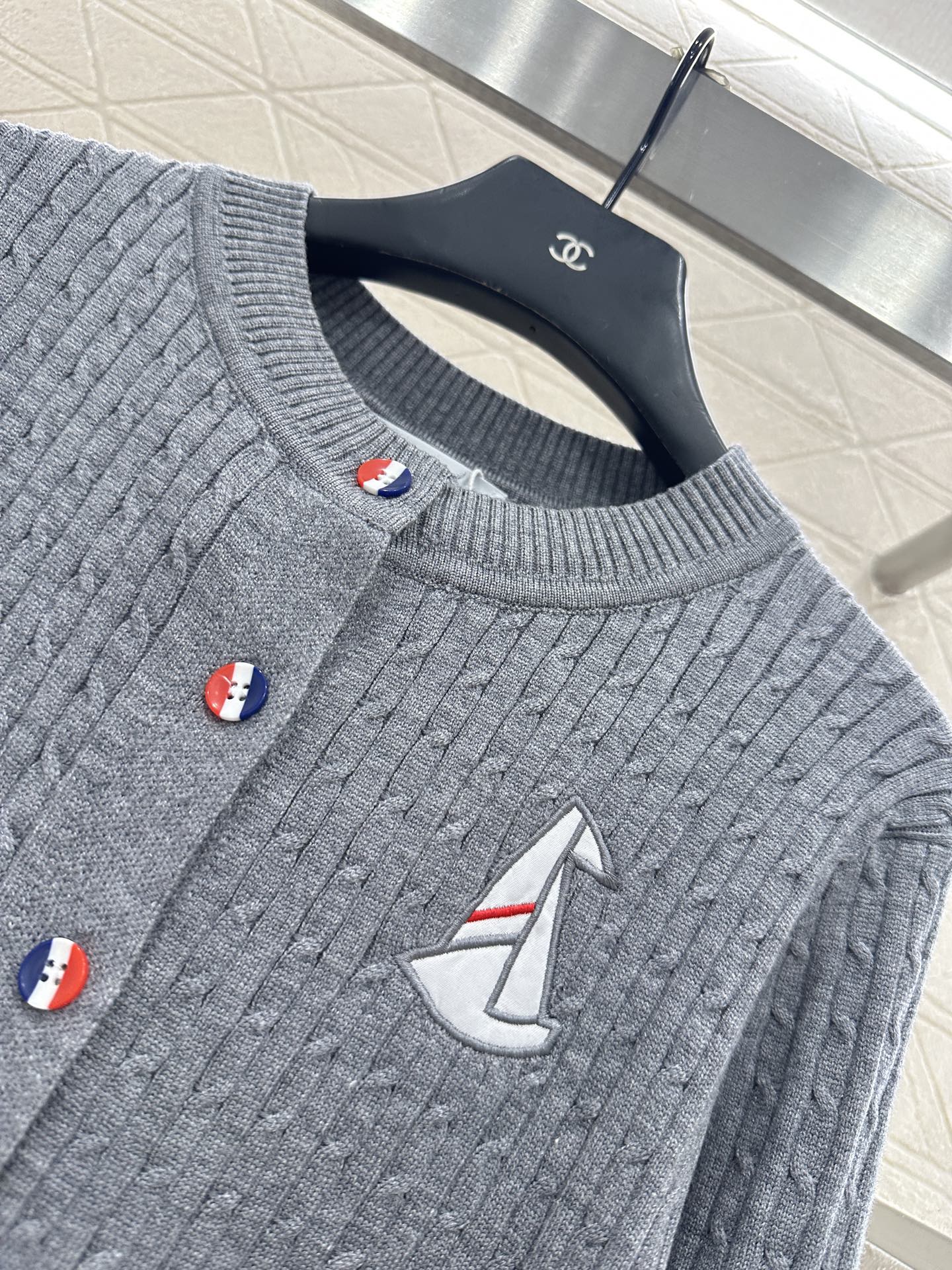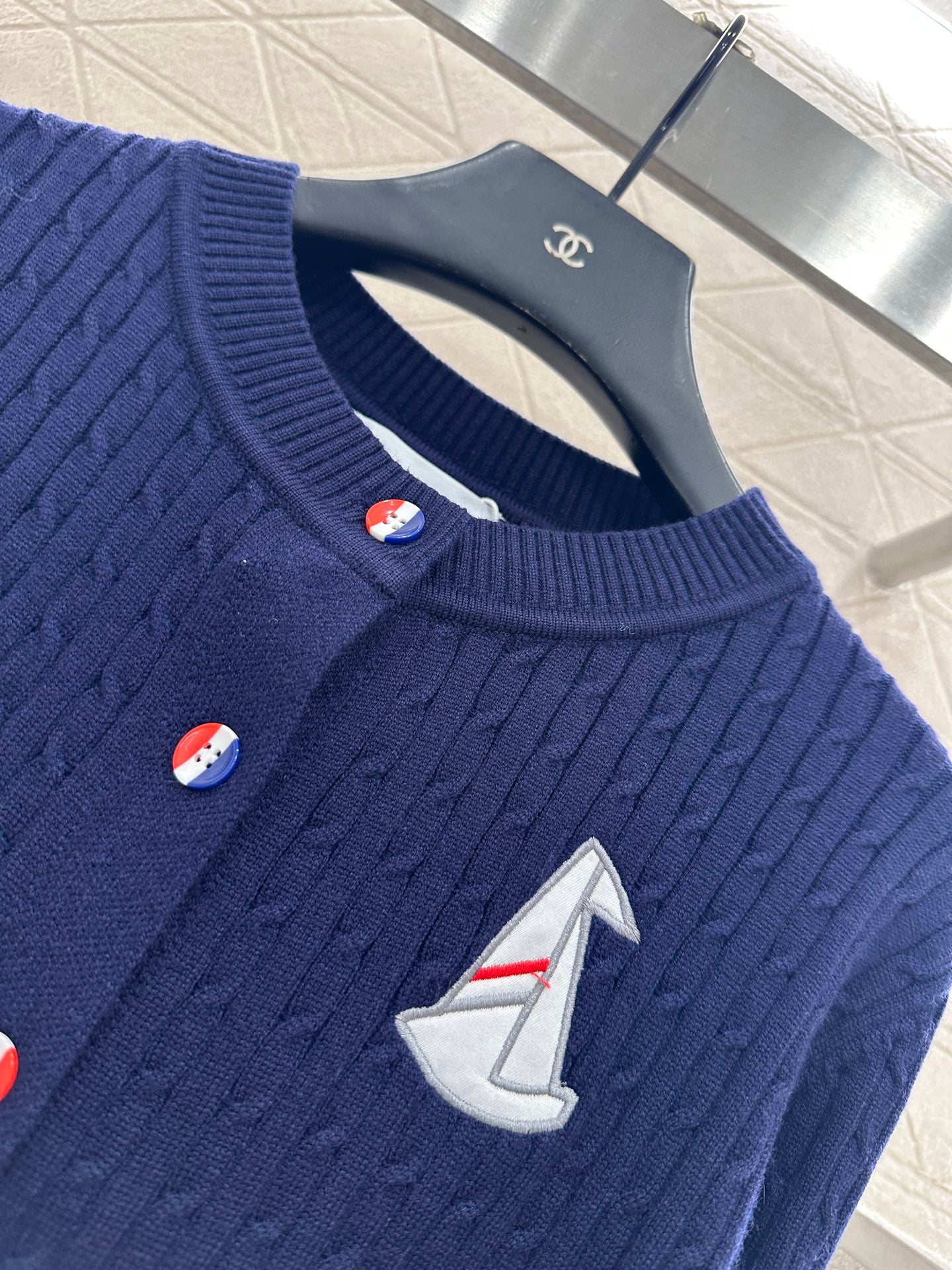 Wool knitting material, comfortable and soft, full texture, round neck cardigan cutting, vertical Fried Dough Twists crochet texture throughout the garment ➕ Embroidered sailboat pattern decoration on the chest, cute and youthful, with white striped horizontal bars embellishing the arms, echoing the style with the stripes on the back collar, adding vitality to the design. The upper body exudes a college style, suitable for commuting and dating.