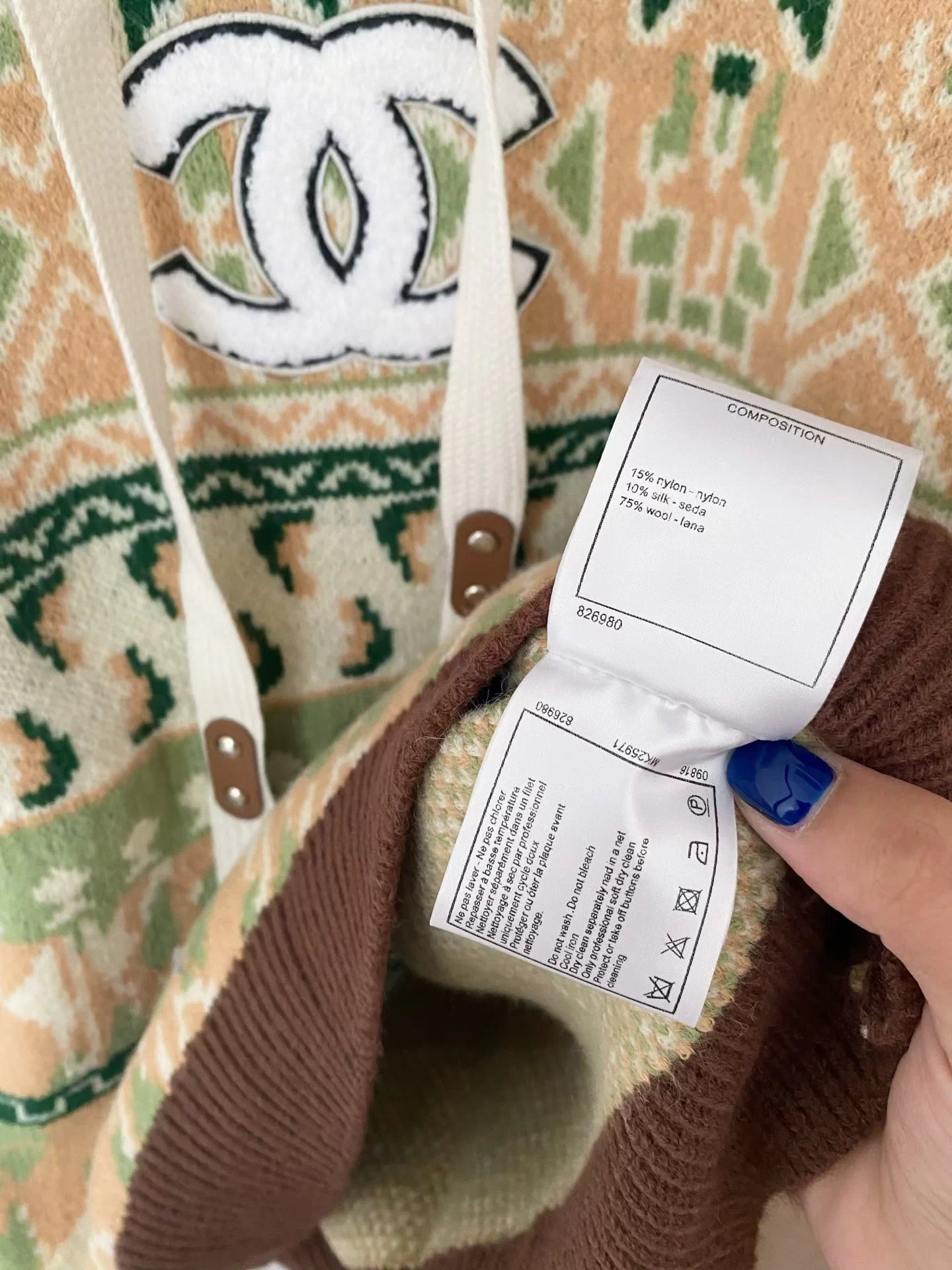 Wool knitted material with a premium and comfortable texture, soft and messy hat, long sleeved sweater with collar and cuffs, threaded edging that echoes the hem, and a Nordic style hook and flower pattern that creates a literary youth style. The double C jacquard logo in the center highlights the brand's tone. Knitted fabric is warm and comfortable, with a regular style and a simple and versatile design for autumn, winter, and daily wear