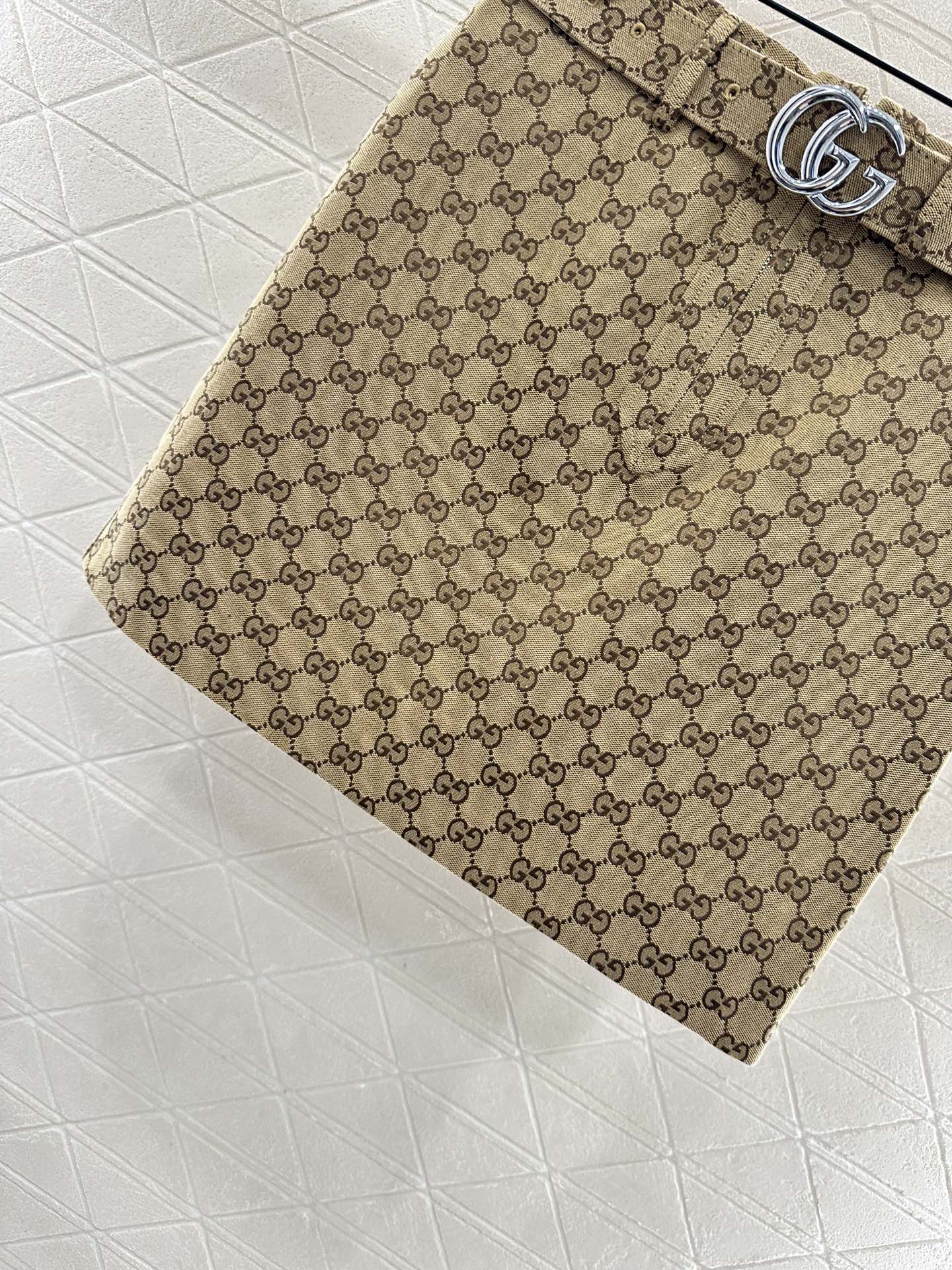 Jacquard material, high-end texture, crisp and stylish, high waisted buckle straight tube short skirt, with double G jacquard letters as highlights throughout the body. The straight tube of the skirt is cut in three dimensions to decorate the waist and hips, and the short skirt exposes the long legs to highlight the proportion. Combined with the hollow double G waist belt, it highlights the high-end style and creates a fashionable style when worn.