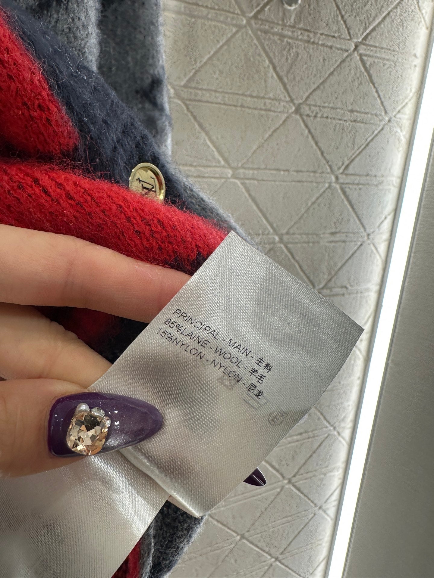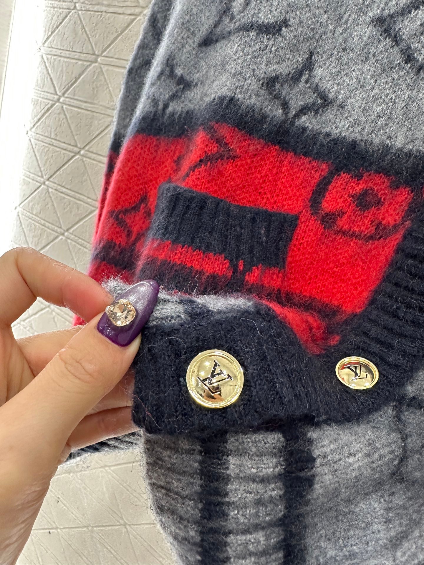 Woolen yarn weaving, premium texture, comfortable to wear without tying the body, V-neck knitted cardigan cut, oversized silhouette, visually slimming and relaxed, with gray as the main body, edging and contrasting colors to outline the contours, and red color blocks dotted on the lower and back sides, full of artistic charm. The large four leaf clover letter jacquard logo establishes the style of Lao Qian Literature and Art Academy, and is fashionable when layered.