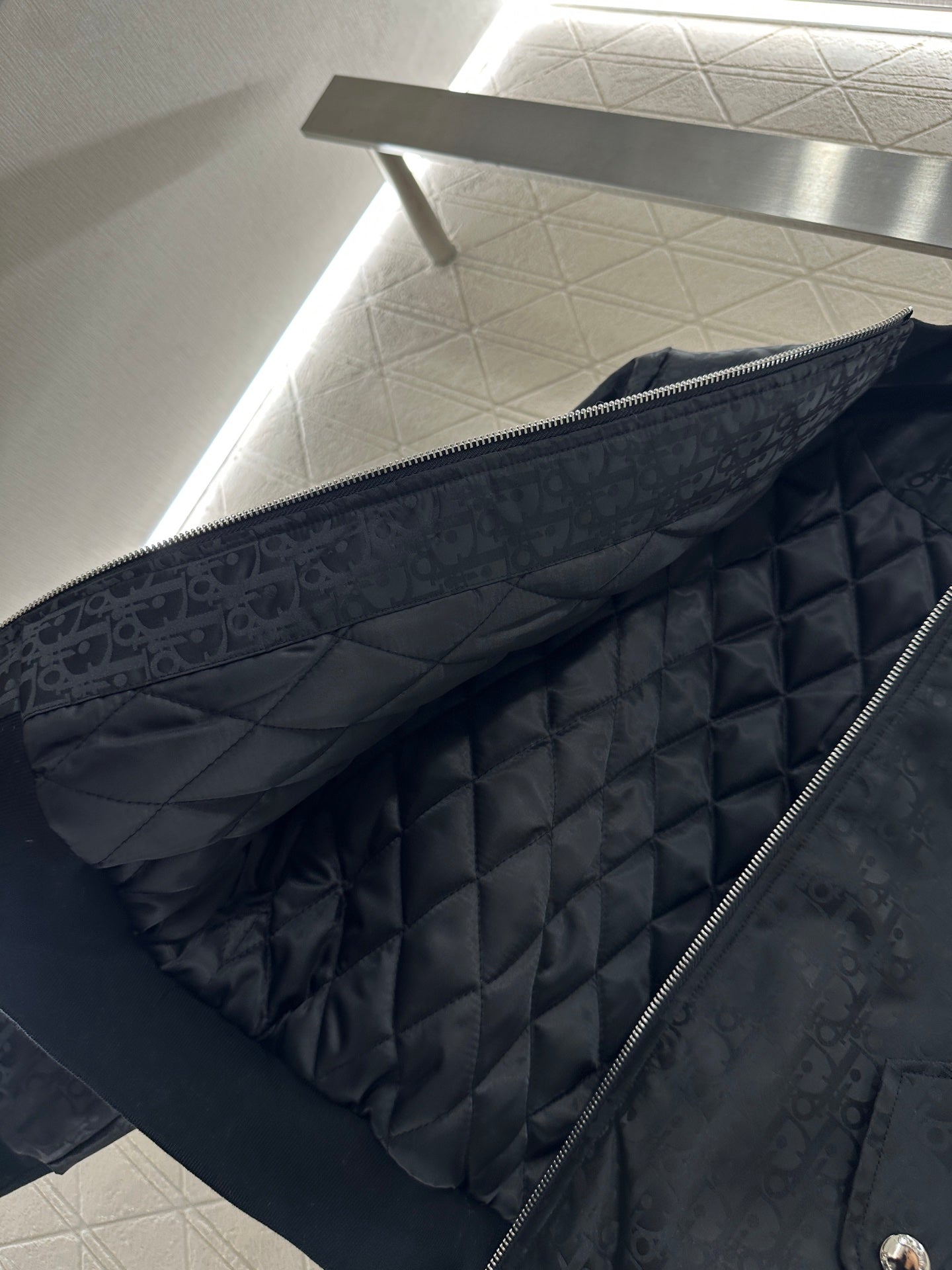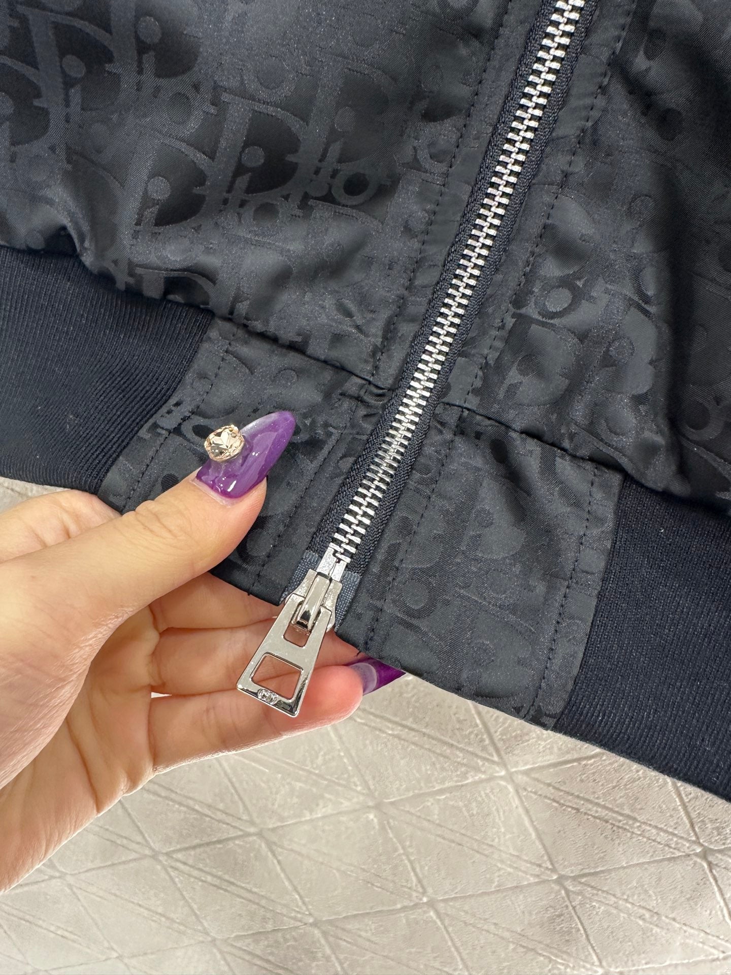 Jacquard material, glossy texture, lightweight and comfortable, full of appearance, casual baseball jacket cut, all black solid color base, letter dark pattern full coverage, low-key luxury and fashion sense full, highlighting high-end style. Combined with the elastic thread of the collar hem and cuffs, it fits snugly against the body and looks neat. The symmetrical flip pocket increases practicality, the overall tone is full, easy to match, and the inner diamond grid clip cotton plush is a must-have for warmth in autumn and winter, high-end and fashionable