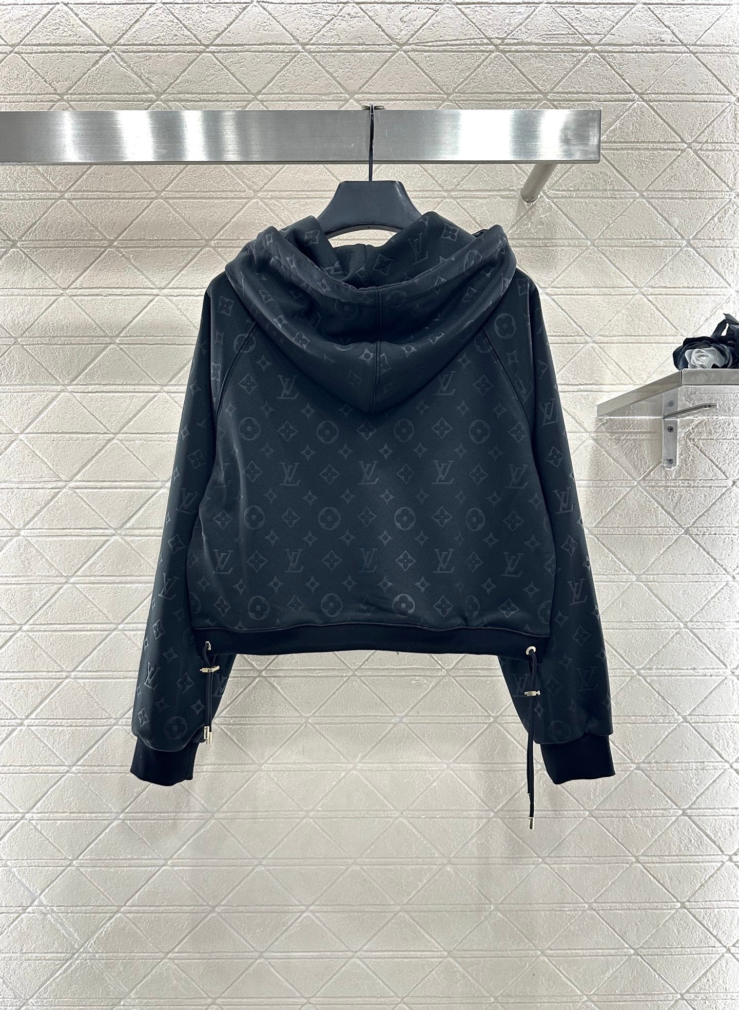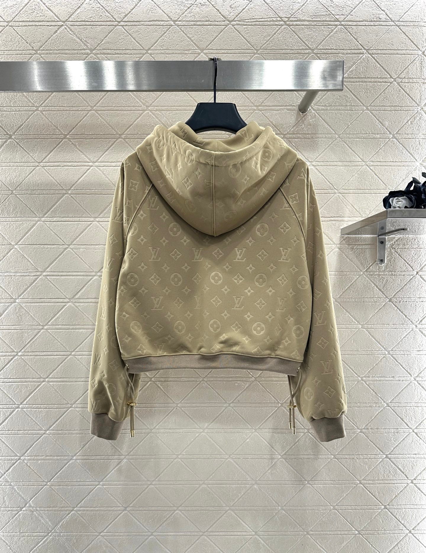Made of twill cotton material, with a premium texture and a full look, this jacket features a fitted collar and adjustable zipper for easy on and off. The hem is elastic and wrinkled ➕ Four leaf clover letter jacquard leather buckle, full of detail texture, with printed lining to create a low-key highlight, rich design layers, adding a sense of luxury to the brand. Paired with straight leg pants of the same series, the waist belt buckle jacquard echoes up and down, and the straight leg version highlights the straight and slender legs. The complete set is fashionable and stylish