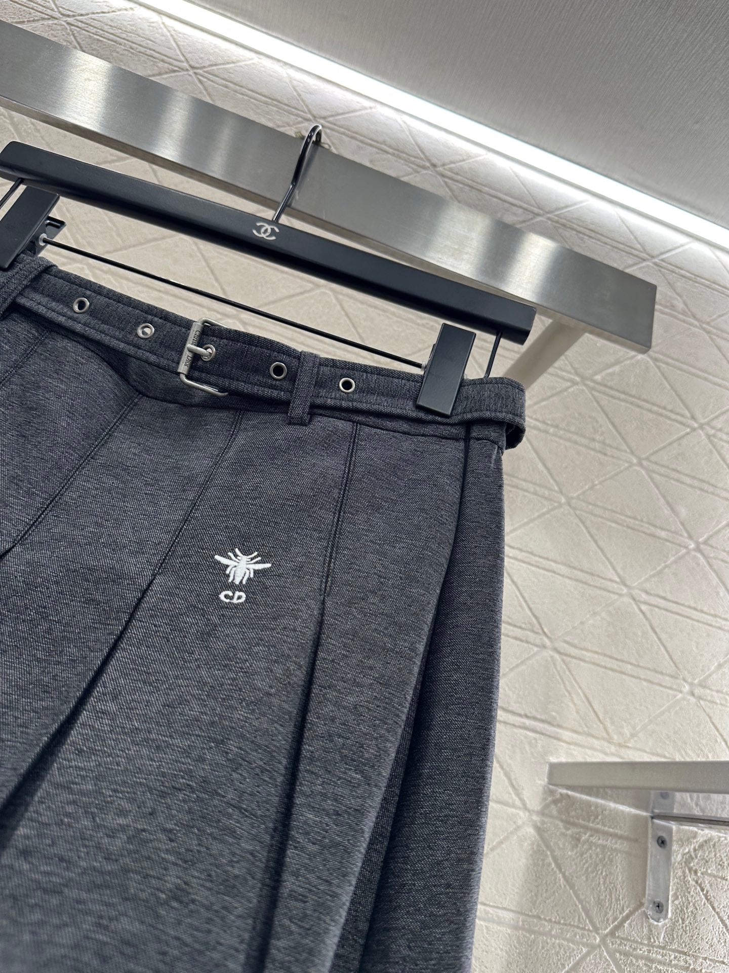Featuring a glossy texture and comfortable drape, this high waisted pleated half skirt is designed with sharp pleats that match the knee high silhouette. A perforated waistband is embellished around the waist, and the bee CD embroidered logo on the waist highlights the brand's style. The outfit is designed to reduce aging, with a thoughtful and moderate length that exposes a slim waist and ankle, showcasing the elegance and grace of the high educated