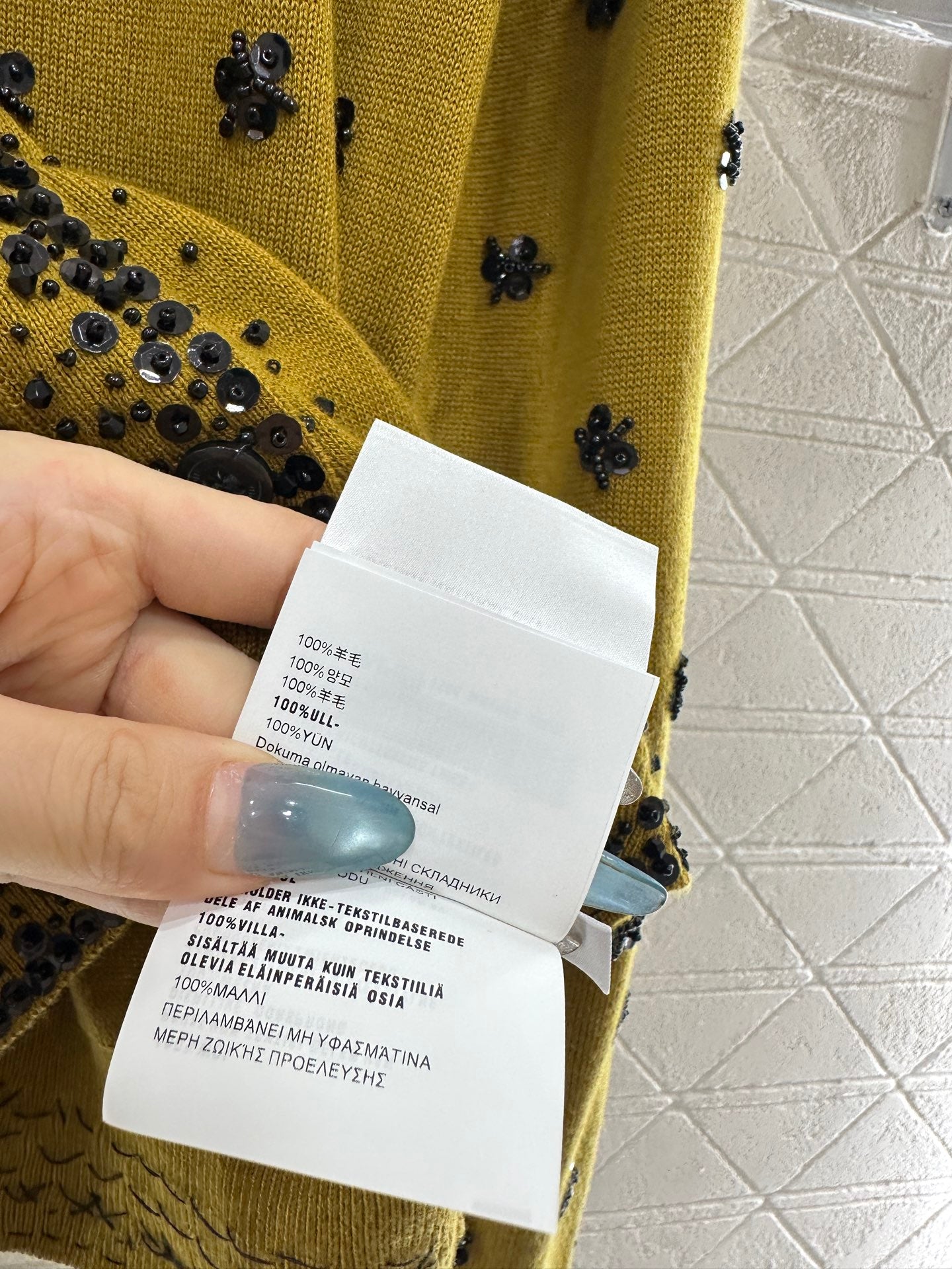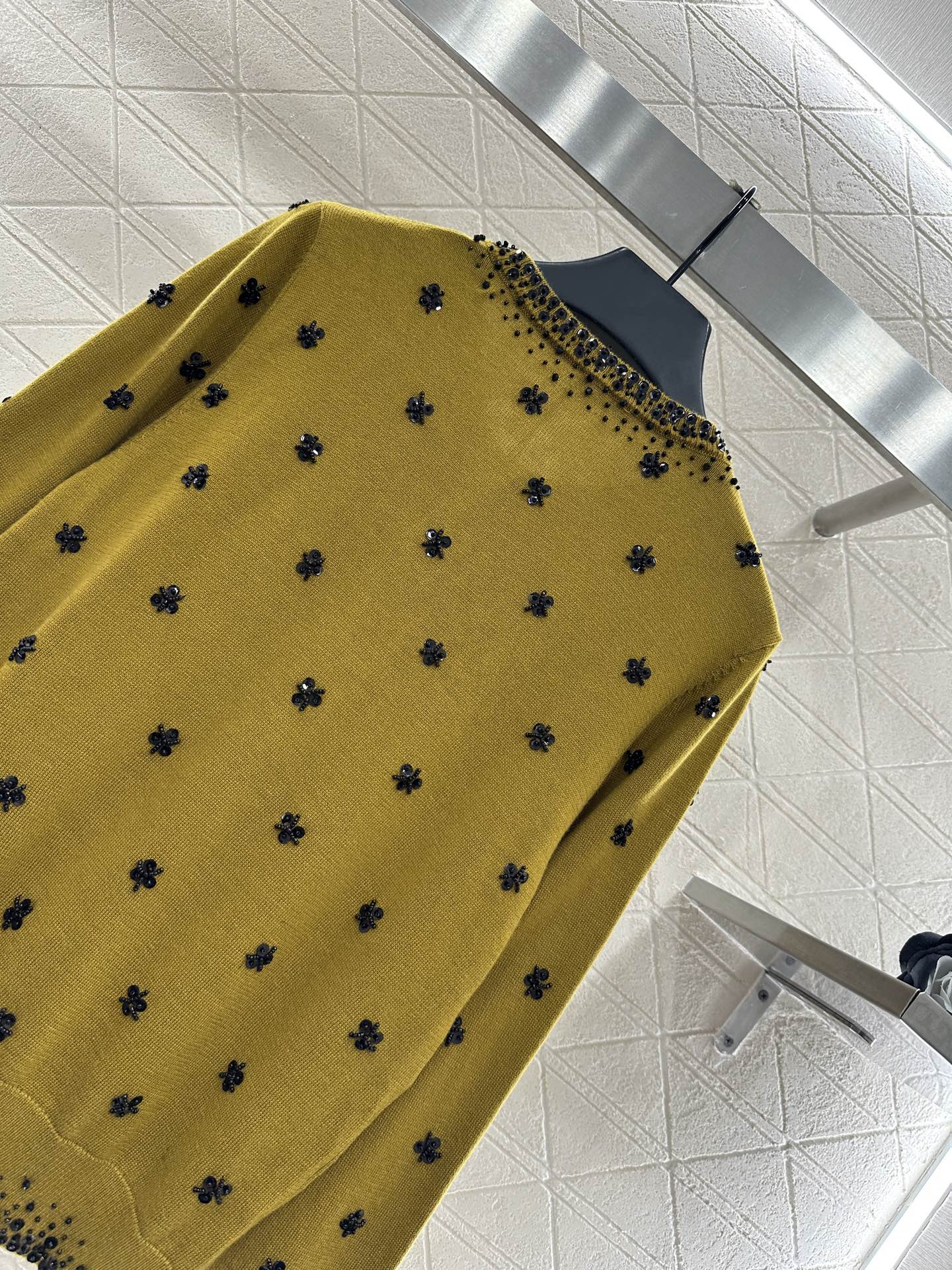 Woolen yarn weaving, density fine needle weaving, clear woolen texture, comfortable and skin friendly, round neck shoulder button cardigan cut, chest letter logo highlighting tone, collar extending to the front hem and cuffs, with dense nail beads outlining the edges. Multiple materials of sequin nail beads are distributed on both sides of the body, combined into flower patterns, reflecting gorgeous light and creating a luxurious and relaxed feeling. The leader's hem has threaded edges, full of elasticity, and rich color design layers. The pattern is inclusive of the body and fashionable for wearing to reduce age.