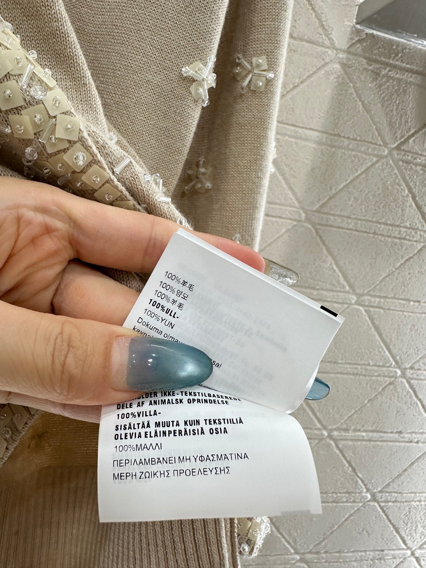 Woolen yarn weaving, density fine needle weaving, clear woolen texture, comfortable and skin friendly, round neck shoulder button cardigan cut, chest letter logo highlighting tone, collar extending to the front hem and cuffs, with dense nail beads outlining the edges. Multiple materials of sequin nail beads are distributed on both sides of the body, combined into flower patterns, reflecting gorgeous light and creating a gorgeous and relaxed feeling. The leader's hem has threaded edges, full of elasticity, and rich color design layers. The pattern is inclusive of the body and fashionable for wearing to reduce age.