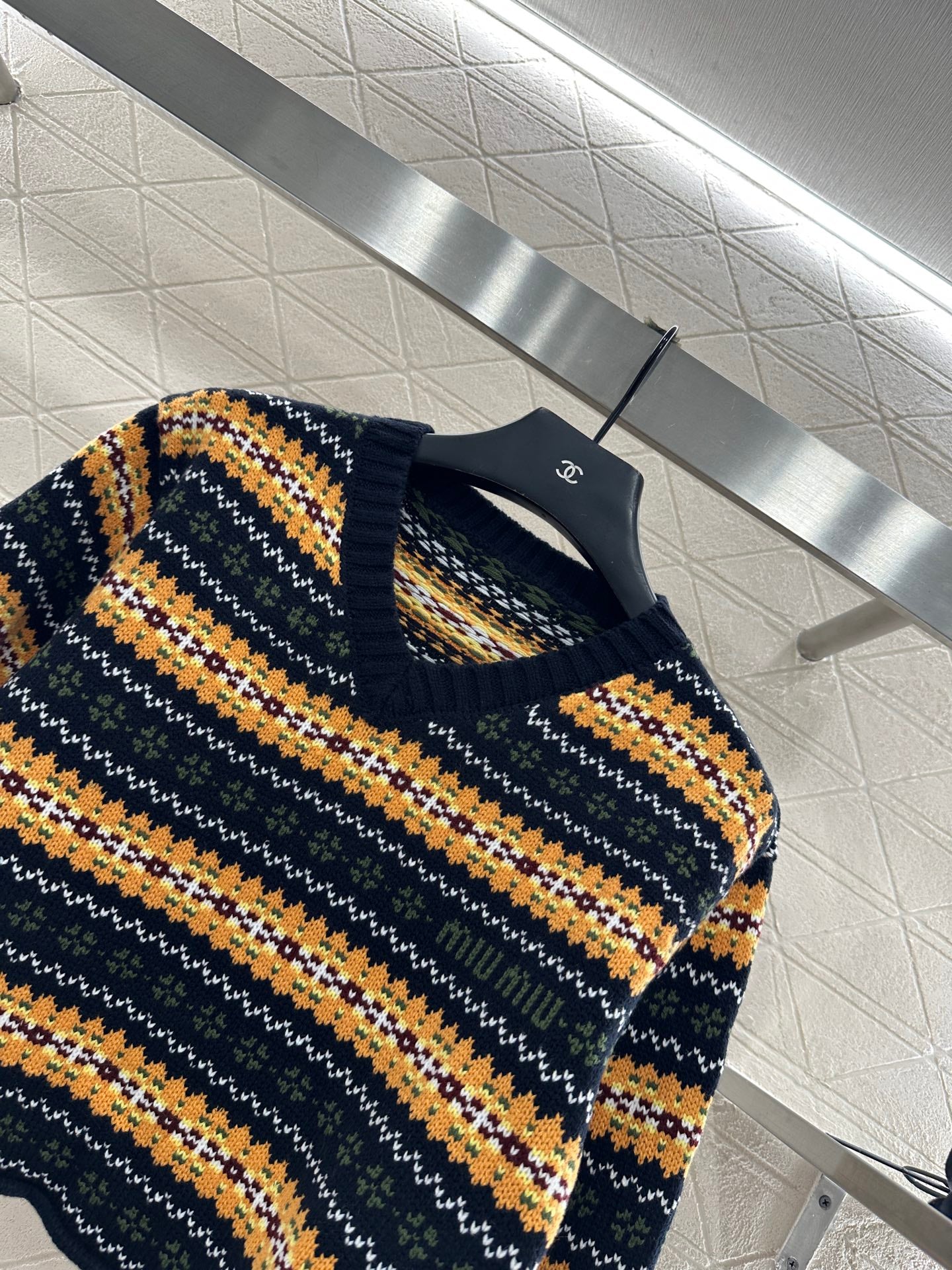 Woolen yarn weaving, glossy texture, soft and skin friendly, short V-neck pullover sweater cut, smooth needle texture, slimming without losing fashion sense. The collar and cuffs echo the hem with solid color thread edging, tightening and fitting the body shape. The large hook flower uses color arrangement to form a striped pattern decoration, showcasing the playful and youthful brand tone. The autumn atmosphere color scheme is relaxed and lazy, making it the first choice for layering.