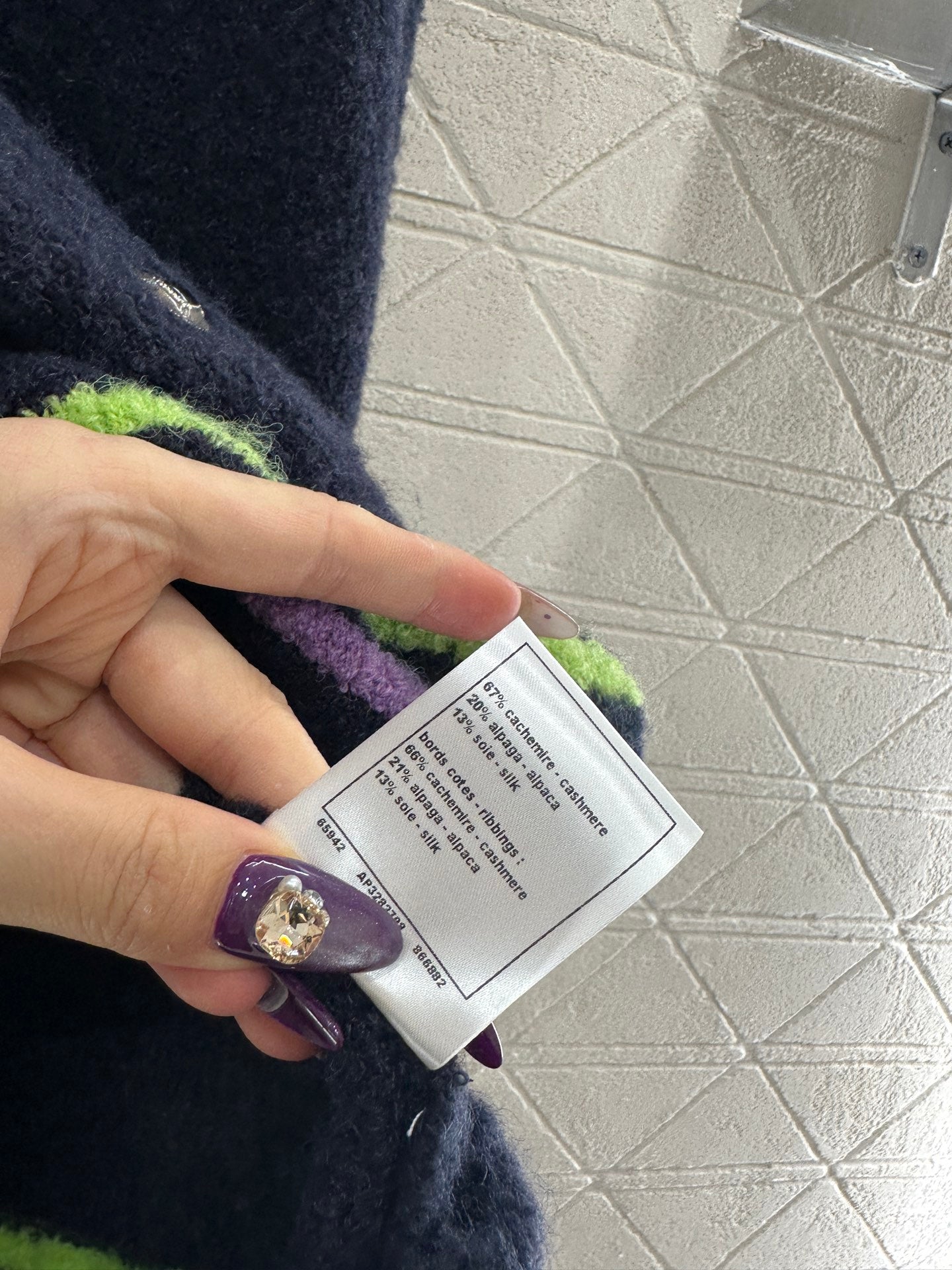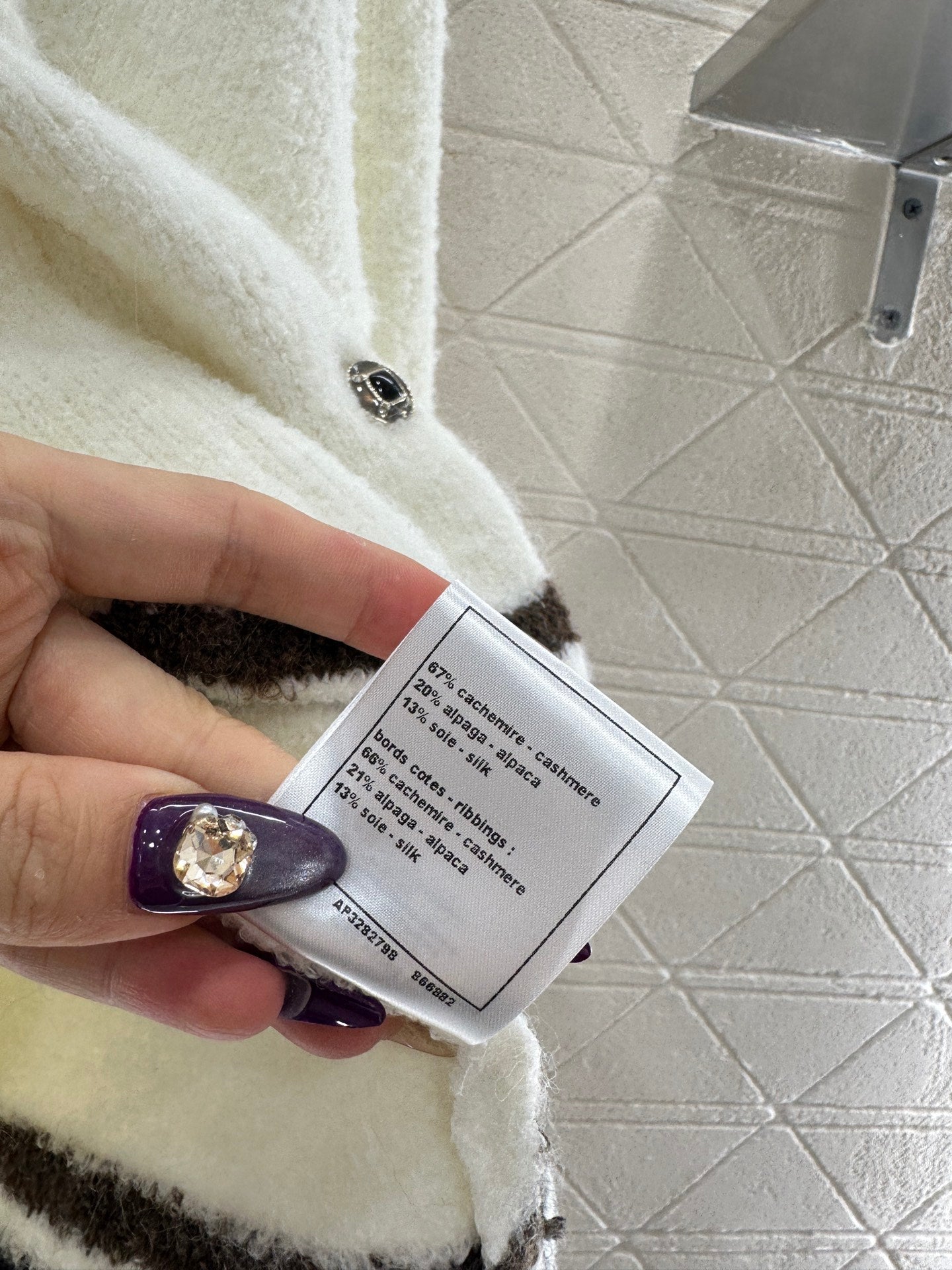 25 Coco Skiing 🎿 Series # Cashmere yarn weaving, density fine needle weaving, clear woolen texture, soft and sticky texture, comfortable and skin friendly, round neck button shoulder cardigan cut, three-dimensional rounded edging, large front placket round button contrasting diamond grid ➕ Diamond details embellish the design, reflecting reflective light and creating a luxurious and relaxed look. Paired with the contrasting stripes at the hem and cuffs, it enriches the layering of the design. The silhouette is inclusive of the body, making it fashionable and age reducing