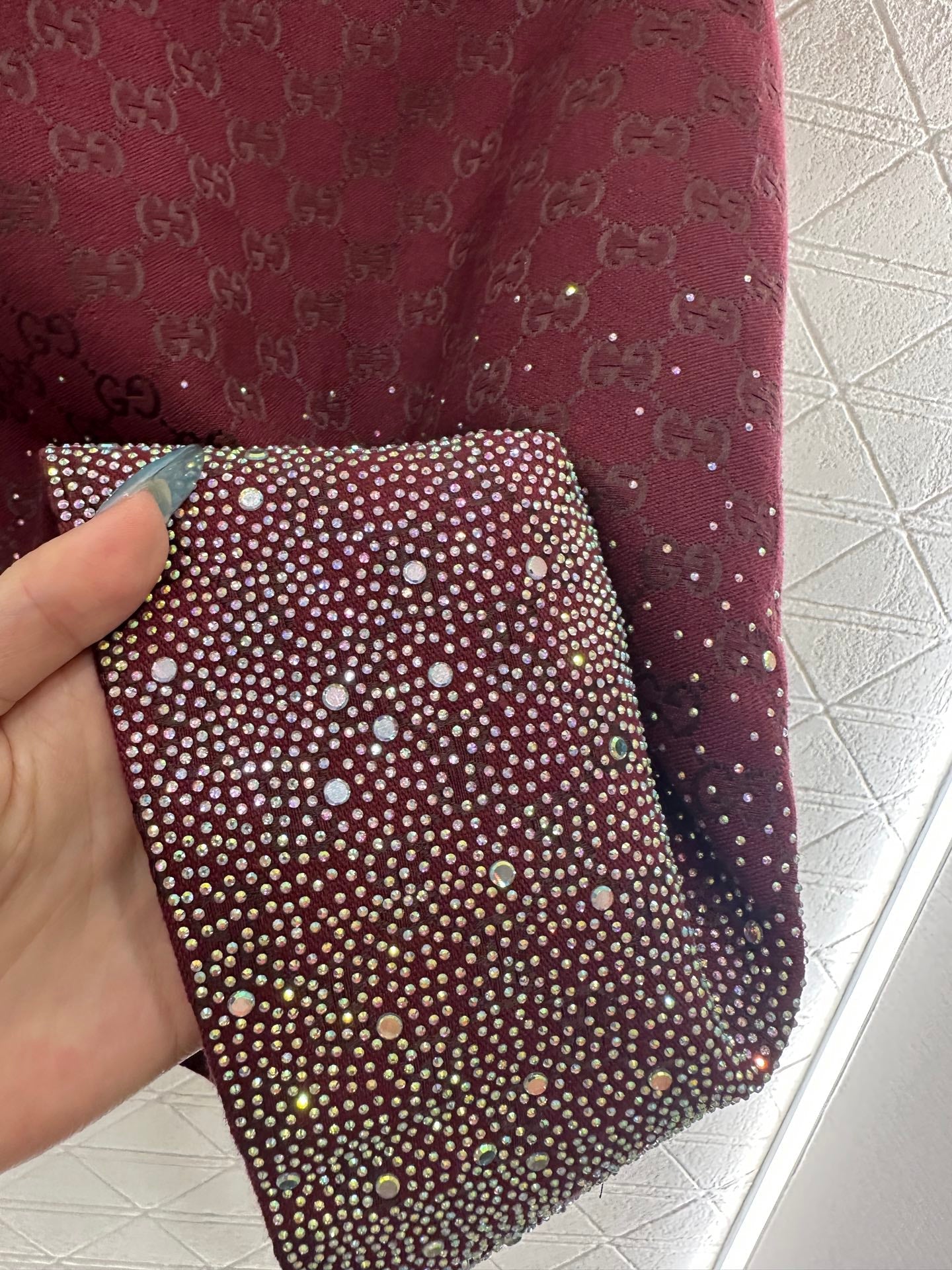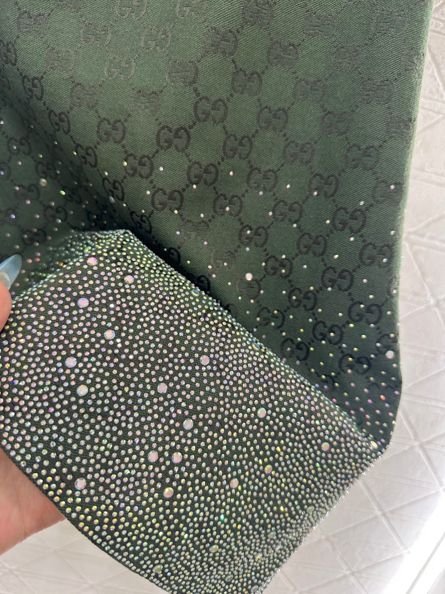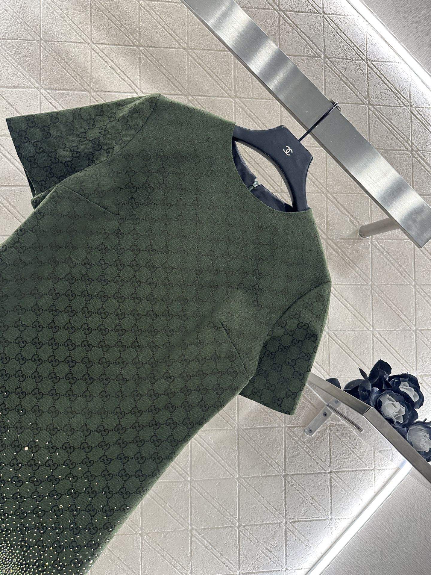 Customized YB imported jacquard material, high-quality texture, crisp and stylish, round neck short-sleeved dress version, large body full-print double G jacquard, chest pleats, visually slim, high-quality and crisp shape, the hem is embellished with heavy hot diamonds, shining when viewed up close and flashing with a gradient luster from afar, rich design layers, creating a brand-exclusive sweet and cool style, the back zipper is easy to put on and take off, and it is more aura when paired with fur, a must-have fashion item for autumn and winter