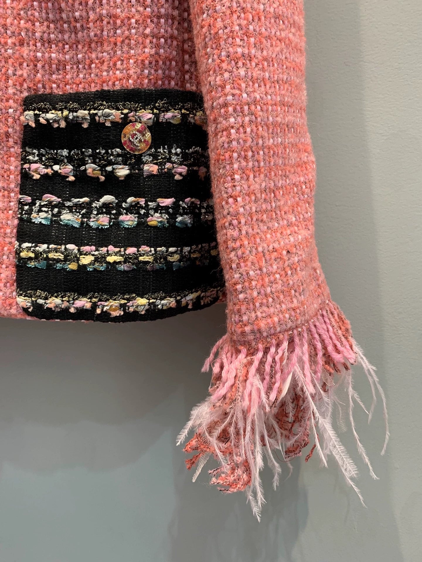 Unique coarse tweed design, real fur decoration on the cuffs, perfect for details, size S, suitable for spring and autumn seasons. Smooth lining, blended material, best for dry cleaning