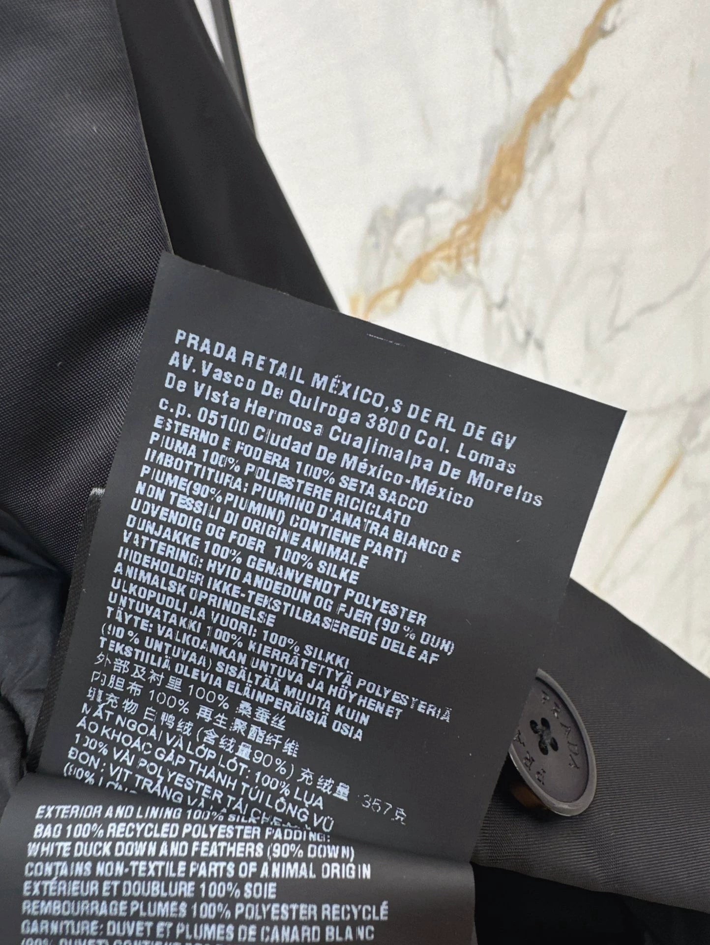 Fabric and lining: 100% recycled nylon, filling: 43% polyester, 35% recycled polyester, 22% white goose down and feathers (90% down), belt: calf leather.