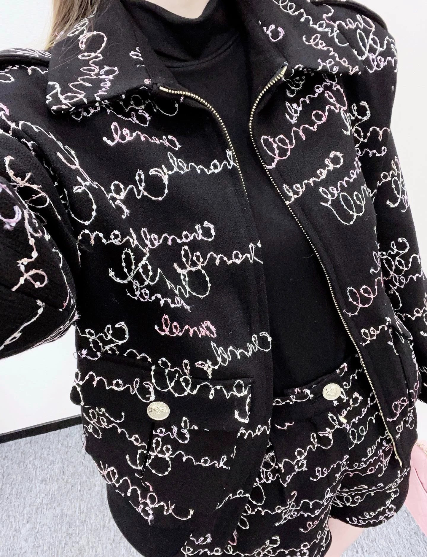 100% wool material, using embroidery ➕ The sequins present a retro jacquard letter logo design, with a full layer of jacquard echoes inside, highlighting the style. The use of cotton processing makes it comfortable and warm to wear, highlighting the brand's trendy positioning and enriching the design hierarchy. Flip collar heart-shaped zipper pocket jacket, with adjustable elastic hem, easily attracted by a slim waist, adding visual highlights. The silhouette of the upper body increases the sense of style. Paired with high waisted buckle shorts of the same series, the jacquard echoes fashion and style, making it a must-have fashionable outfit for commuting and dating