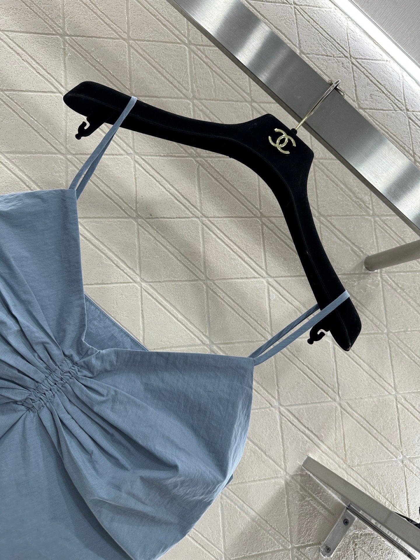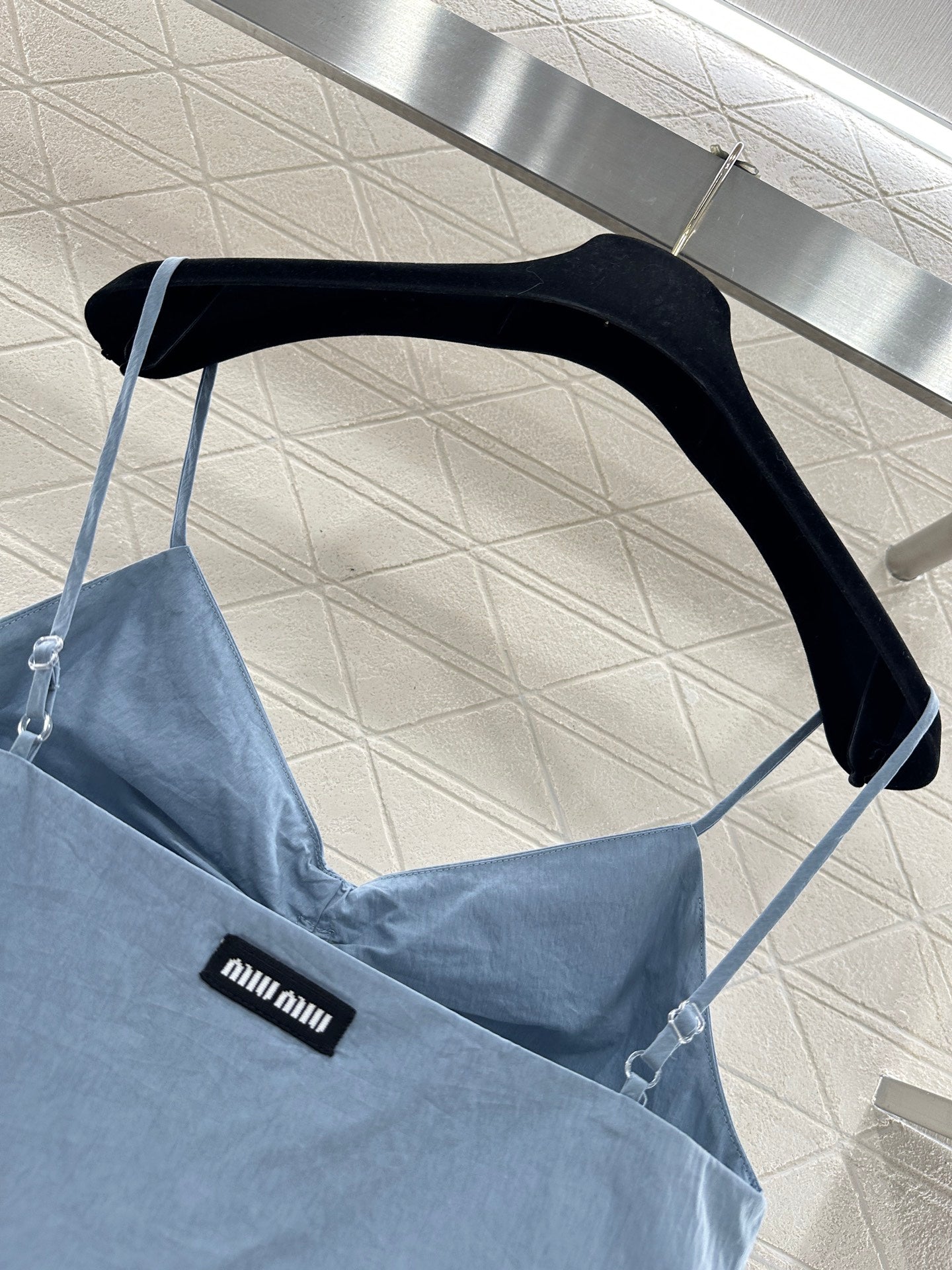 Comfortable and delicate, with a glossy texture, this short corset style camisole pleated short skirt set features a fresh and natural water blue color throughout the body. The chest pleats echo the voluminous umbrella shaped pleated skirt, outlining the waistline and accommodating the hip and hip lines. It exposes the skin and decorates the shoulder and neck lines. The brand logo is embellished on the back with the skirt, revealing both cuteness and sexiness. The detailed design echoes, making it easy to become the visual focus. The set is paired with a youthful and playful outfit, sweet and cute