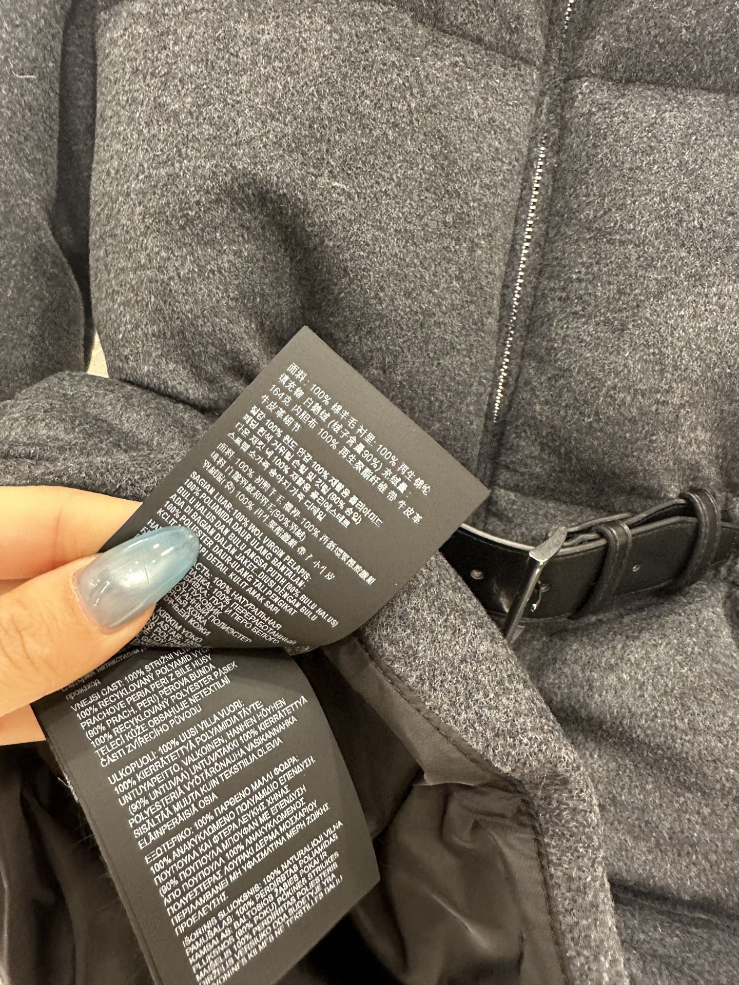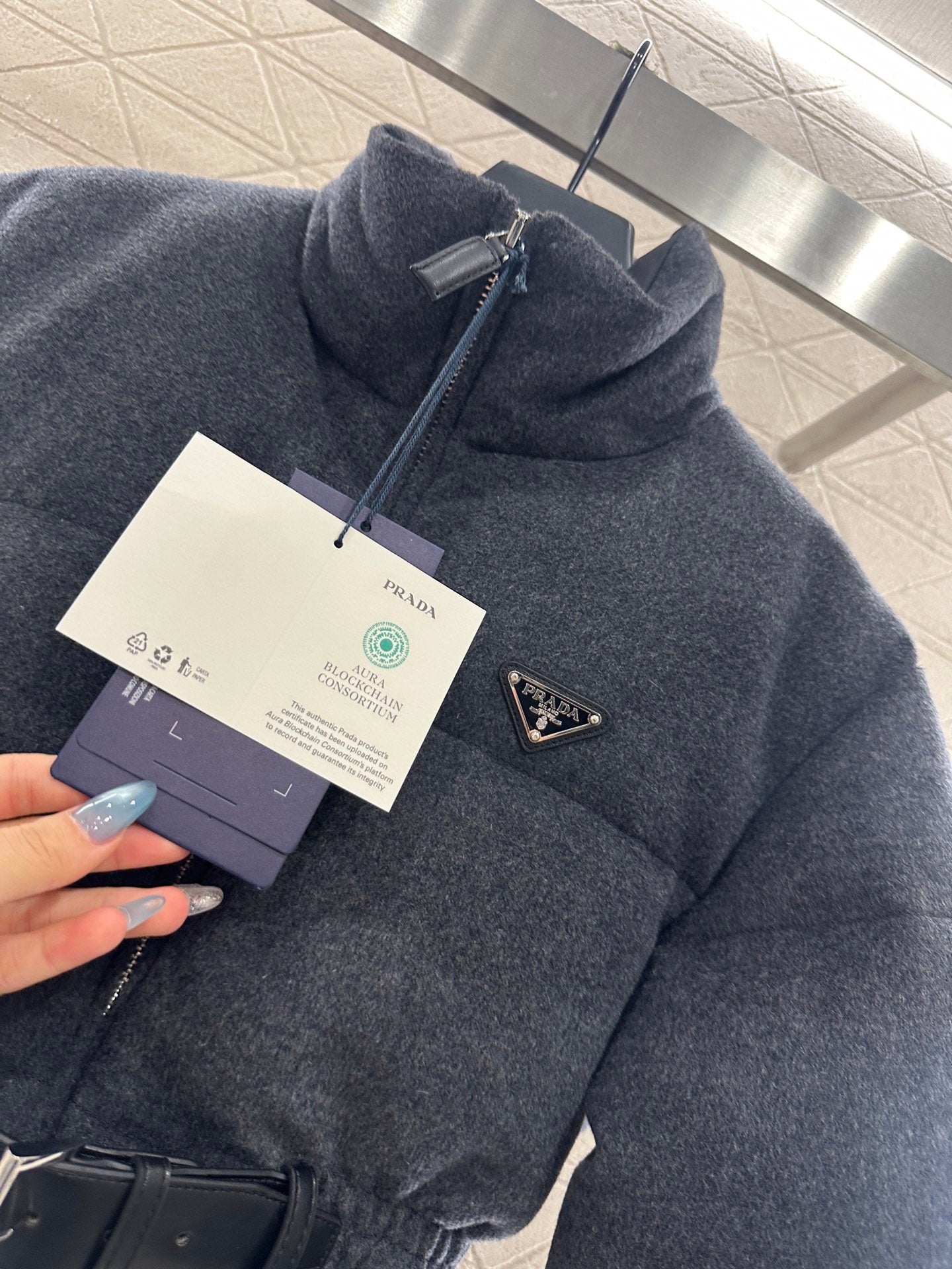 Made of all wool material, with white goose down filling inside, the whole piece is lightweight and warm. The stand up collar and lapel are paired with a slim down jacket, which is warm and not bulky, and has stronger wearability. The classic rectangular grid texture is matched with the classic triangular letter logo, presenting a high-end style and taste. The waist is wrapped with elastic splicing belt design, which is different from the large version, integrating warmth and fashion, getting rid of the traditional down bulky. It is the first choice for autumn and winter layering.