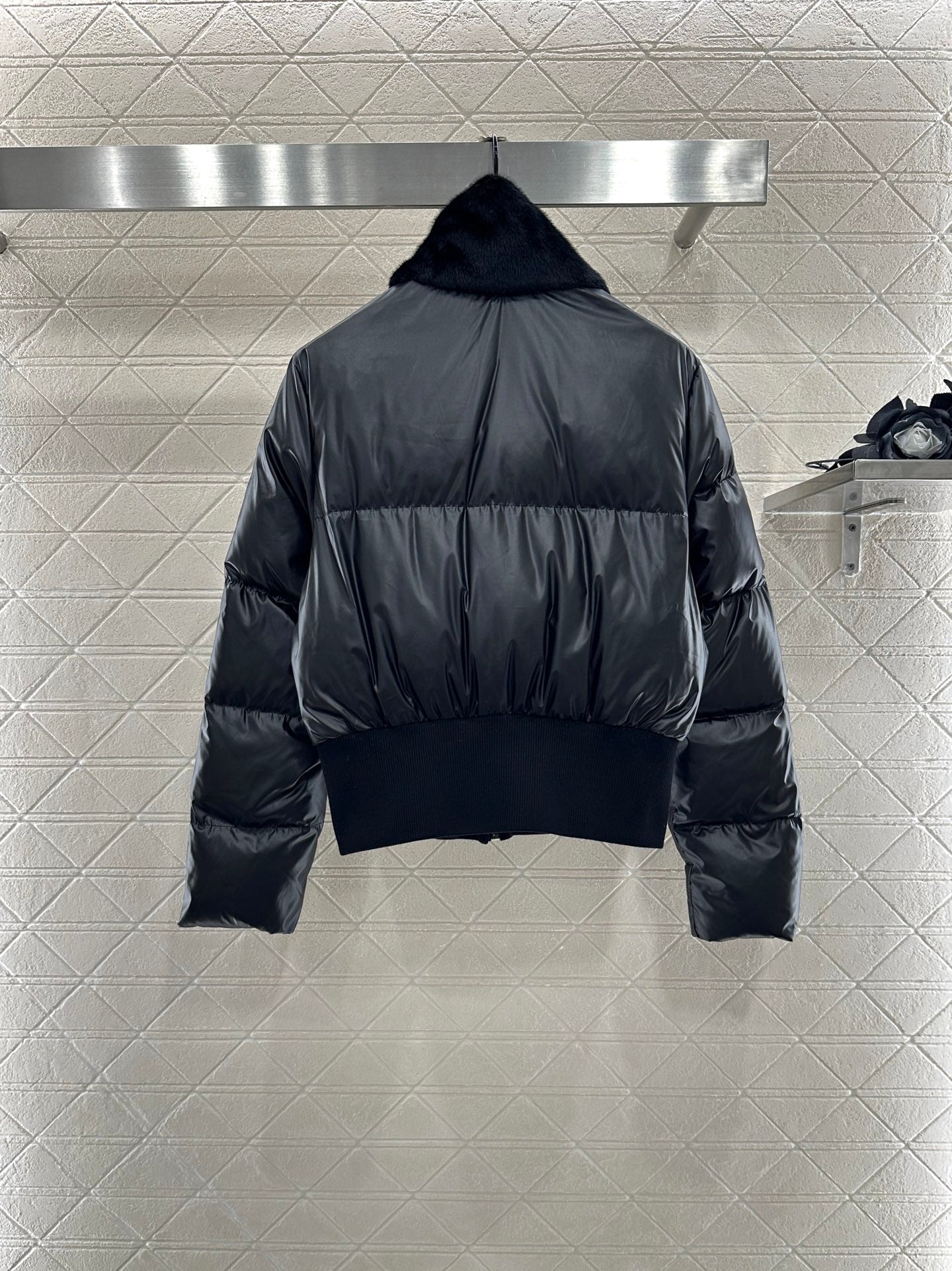Made of custom YB windproof and waterproof glossy nylon with a white goose down lining, it's lightweight and warm. The stand-up collar features mink fur for warmth and a luxurious finish. The zippered placket, accented with a satin finish, adds a playful touch, complementing the leather chest patch for a stylish look. Elastic threaded hem and cuffs provide added warmth, while the cropped silhouette offers a lighter, more stylish look, eliminating the heavy feel of autumn and winter.