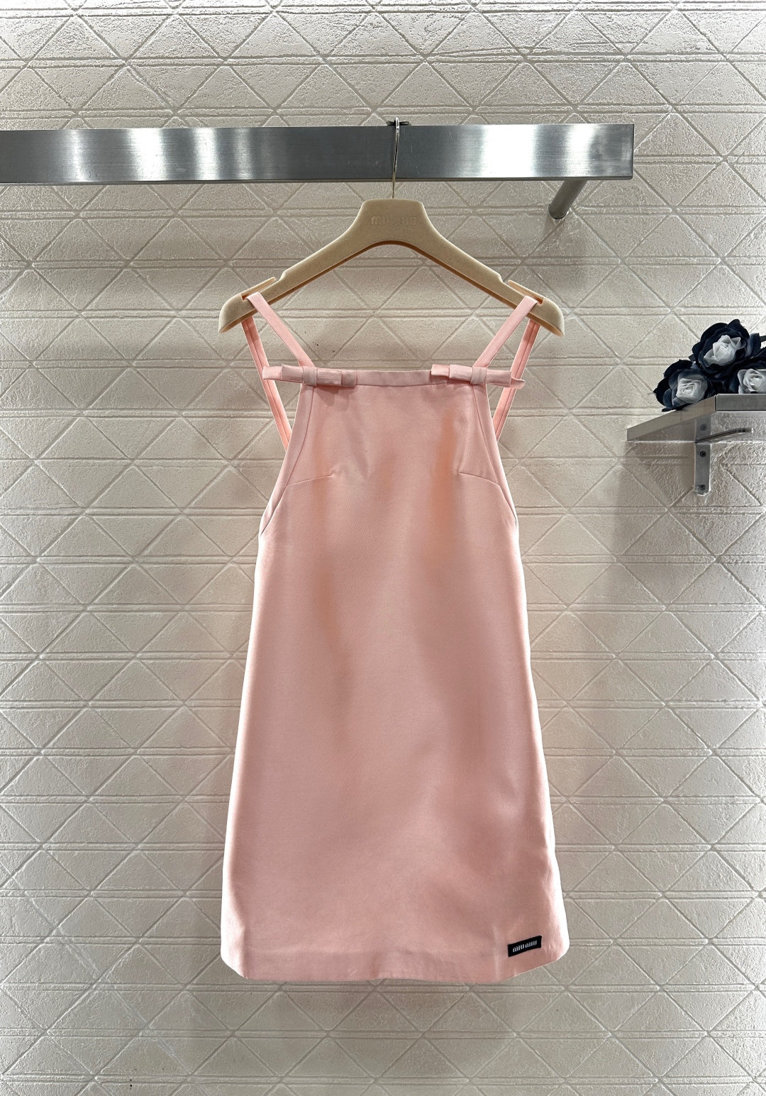 Made of silky wool, this dress boasts a lustrous sheen and a flowing, slightly structured silhouette. The backless, halter-neck design, with a parallel neckline and two shoulder straps adorned with three-dimensional bows, exudes a refined princess-like feel. The tailored bust line effectively conceals underarm fat and flatters the figure. The soft pink color adds a touch of delicate charm while maintaining elegance. The slightly A-line, flared hem with a logo detail adds visual interest and creates a flattering silhouette.