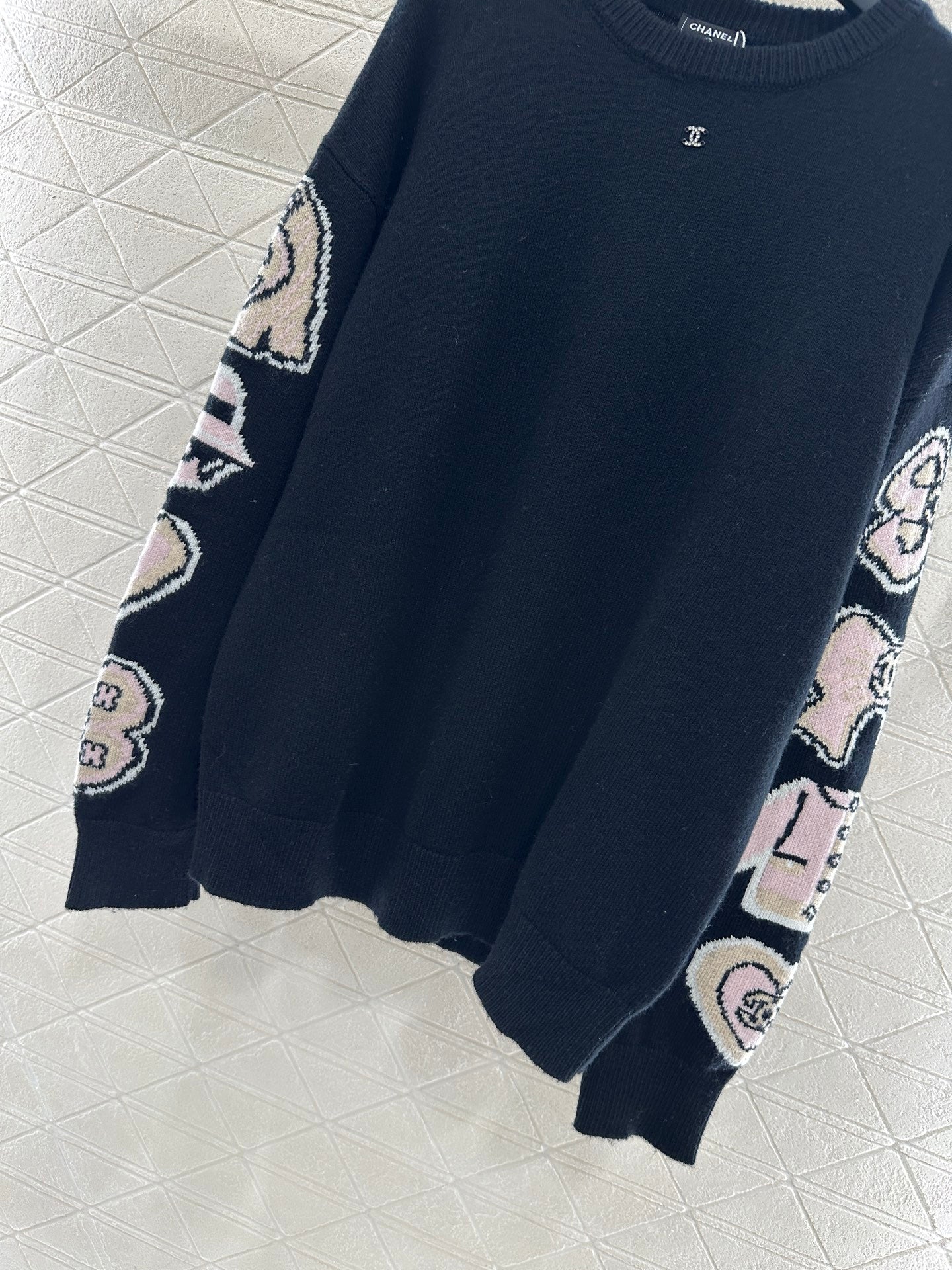 Custom-made YB cashmere yarn construction, soft and comfortable, stylish and slimming. Round neckline pullover sweater cut, fully edged with elastic ribbing for a snug fit, exuding a sleek, elegant, and refined aesthetic. Crocheted cartoon character logo on the outer side of the sleeves ➕Heart-shaped decorations and interwoven double C-letter logos showcase the brand's signature stylish styling. Adds a touch of Korean-style gentle literary charm when worn. Perfect for layering in autumn and winter. Custom-made fabric and lining. Authentic version. High-quality version.