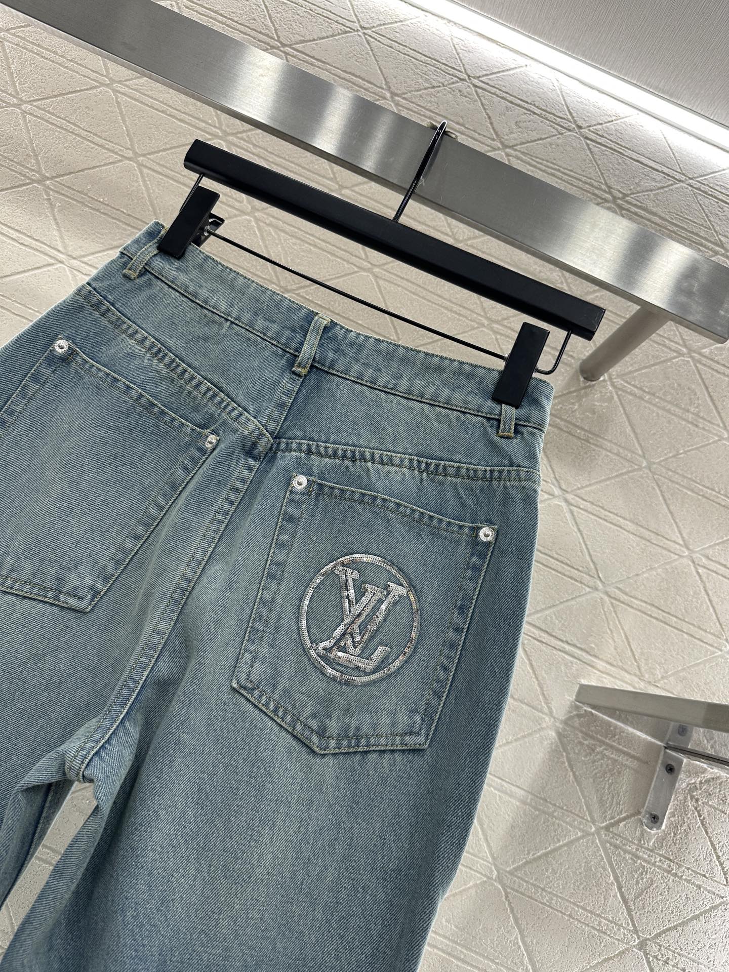 Cotton denim material, multiple washings, presenting a crisp texture. The collar and shoulder denim jacket is cut, and the flip pocket is paired with sequins to outline the LV logo pattern. The style is durable and high-end, echoing the pocket logo and front button, creating a retro and natural neutral and cool fashionable style. Paired with wide leg slightly flared pants of the same series, the bead details on the upper thigh echo the unified style, making it fashionable and eye-catching whether worn as a set or alone, suitable for all seasons.