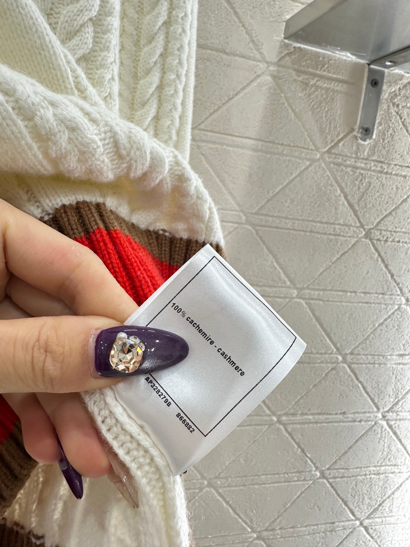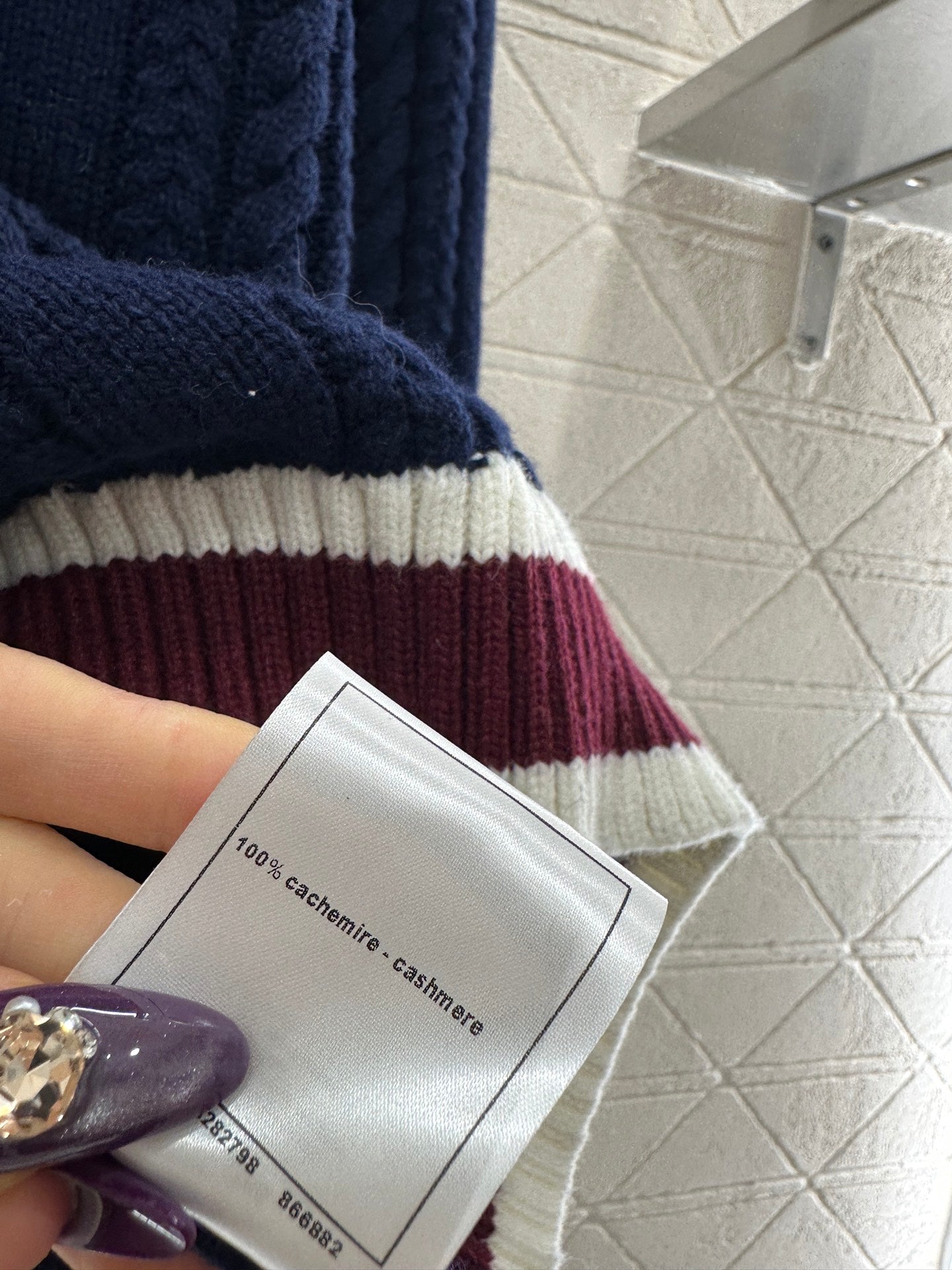 Cashmere yarn knitting material, soft and waxy, dense and delicate, straight shoulder V-neck pullover sweater shape, ready-made garment super heavy industry Fried Dough Twists knitting, alternating needle arrangement highlights the texture of details, two-color stripe edging outline, the overall college elite atmosphere is full, details echo the brand's luxury tone, conventional shape design, inclusive figure, improve lines