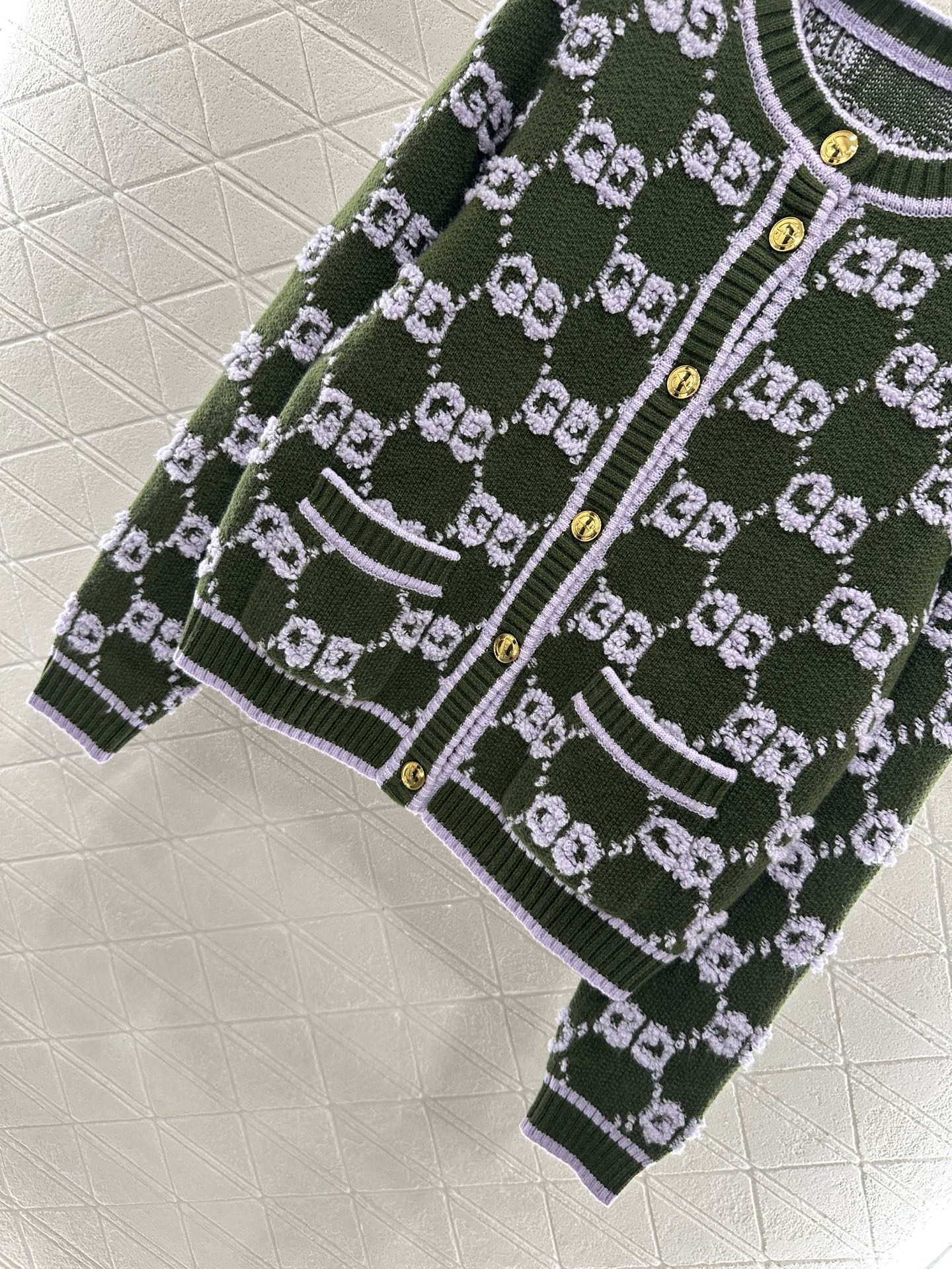 Woolen yarn weaving, superior texture, comfortable to wear, round neck knitted cardigan version, finished garment with threaded edging to narrow, design to maintain a unified tone, overall high-end and crisp shape, large body double G jacquard embellishment, collision of fashionable sparks, creating the brand's unique western-style style, conventional cutting, accommodating body shape, loose and slim wearing.
