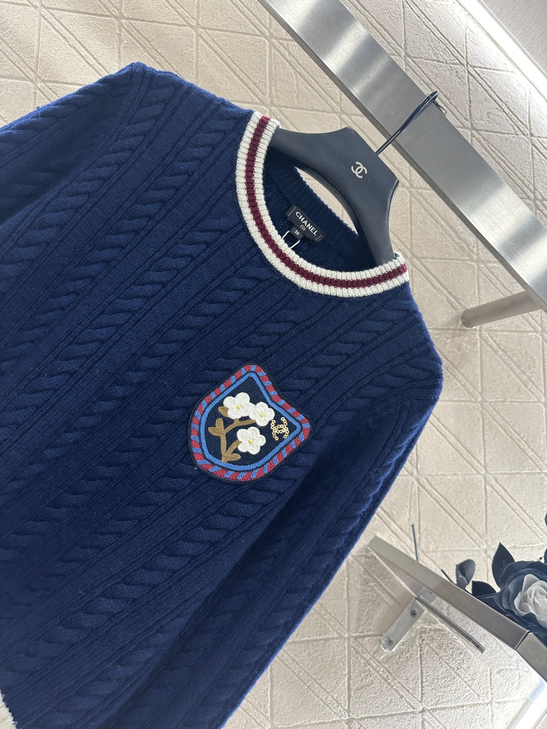 It is made of cashmere yarn, which has a lustrous texture and is soft and skin friendly. The round neck pullover sweater is cut, and the texture is vertically arranged with Fried Dough Twists, showing a sense of slimness without losing fashion. The collar is surrounded by contrasting color accents, the cuffs and hem complement the details, and the elastic thread stripe edging fits the body better. The chest is decorated with camellia embroidery logos, showing a playful and youthful brand tone. The large body is in dark color, relaxed and lazy, making it the first choice for autumn and winter layering.