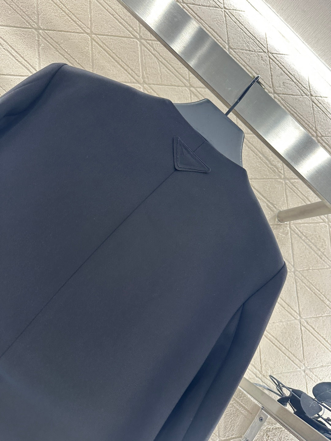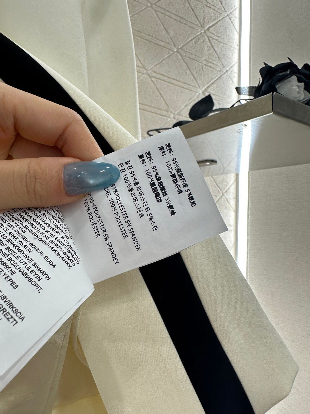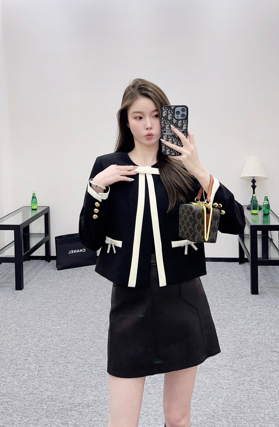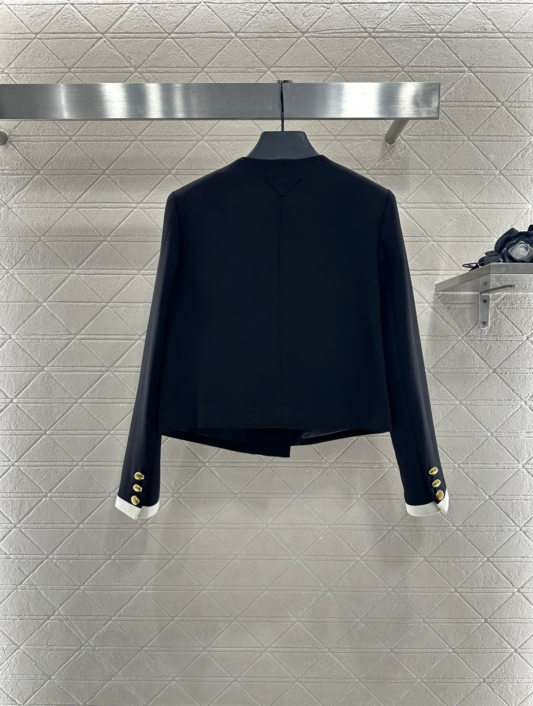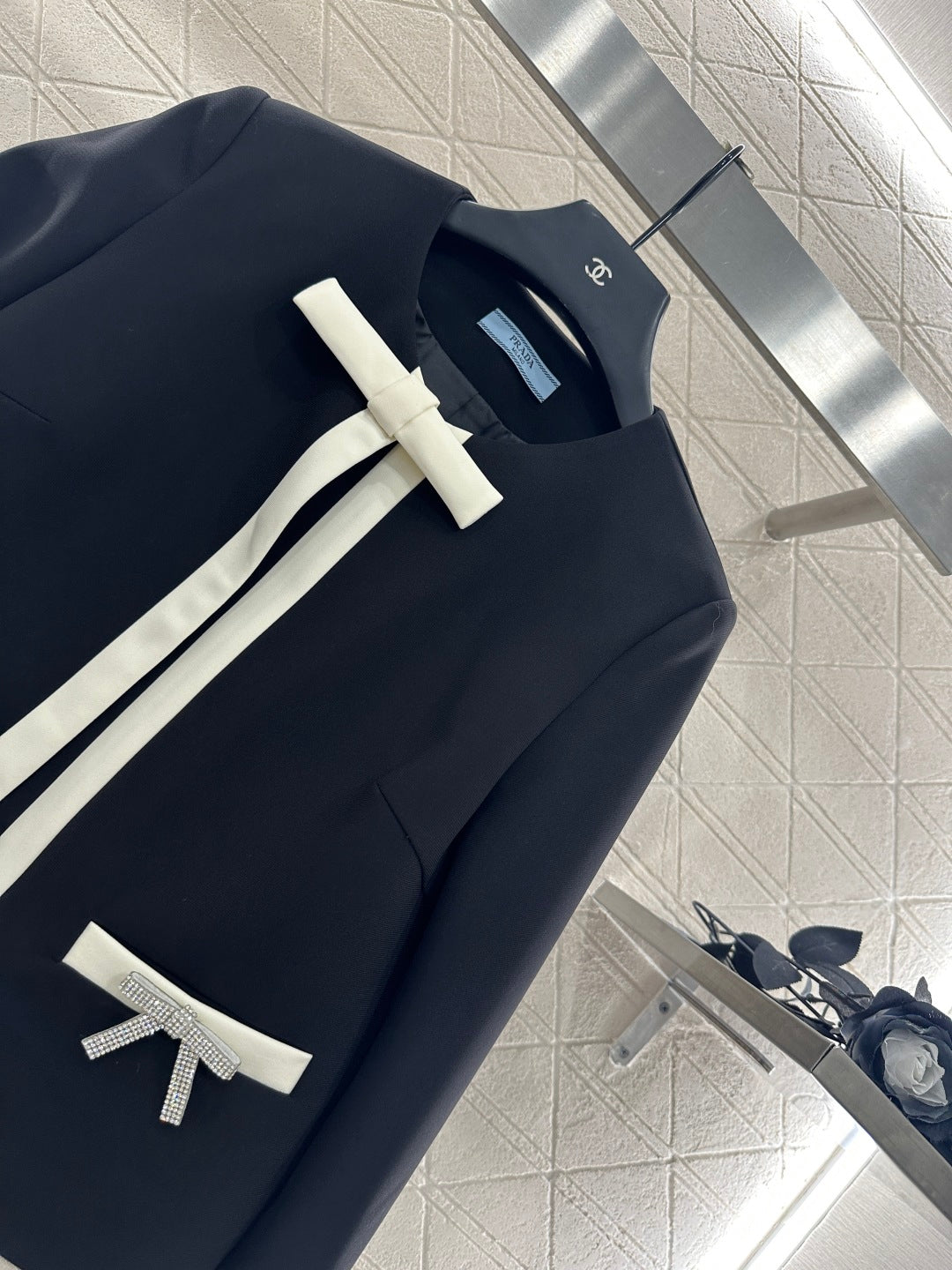 Custom YB imported acetate material with distinct texture and smooth sheen. Round neck dress jacket style. Padded shoulders fit the body to enhance the figure's slenderness and uprightness. Bow-shaped design on the front complements the matte metal bow on the top edge of the pocket. Logo-engraved cufflinks add detail. Outlined and interspersed with the solid color of the main body, the ladylike style is immediately apparent. Perfect interpretation of elegance, suitable for different occasions. Customized fabrics and accessories