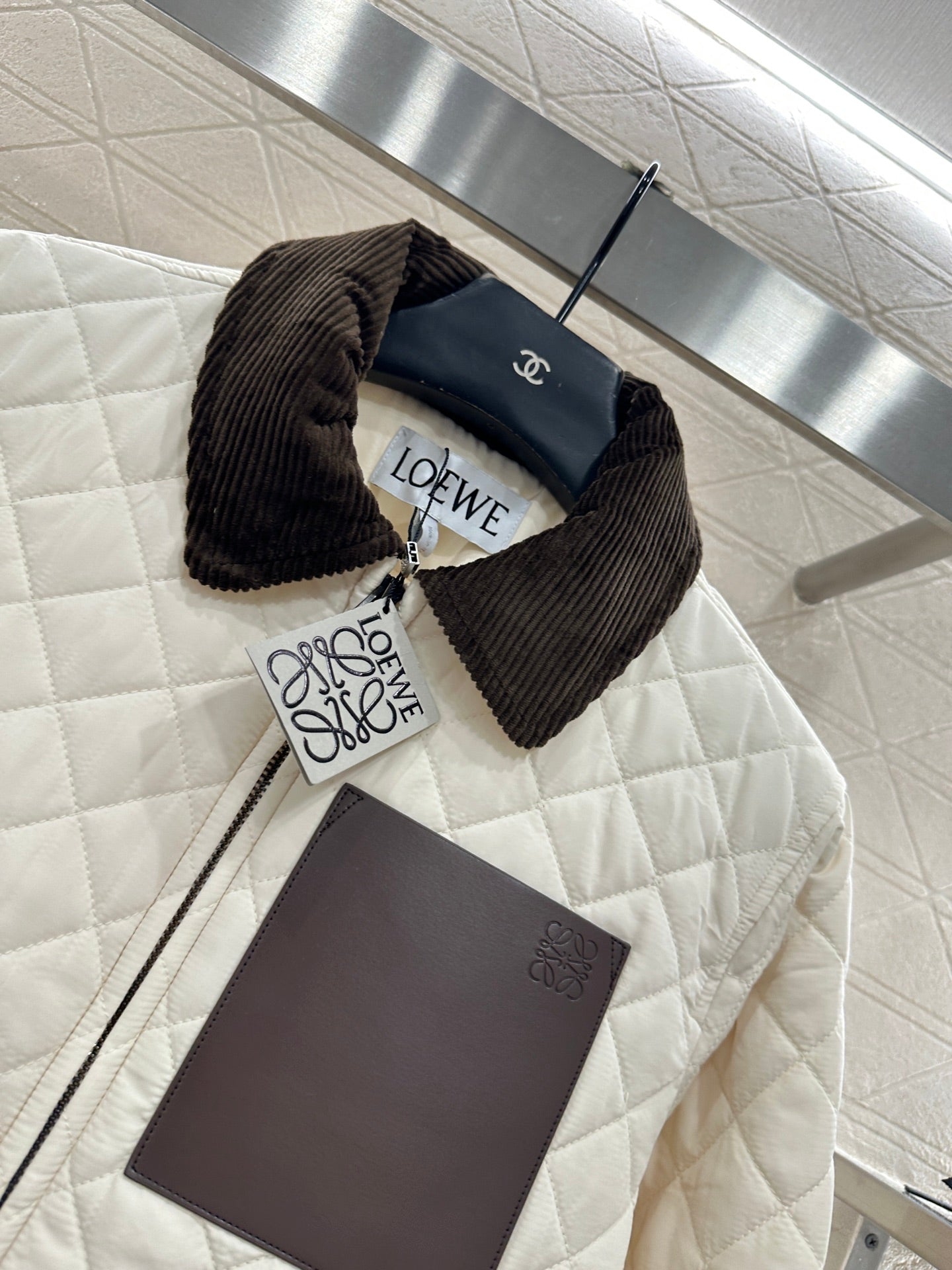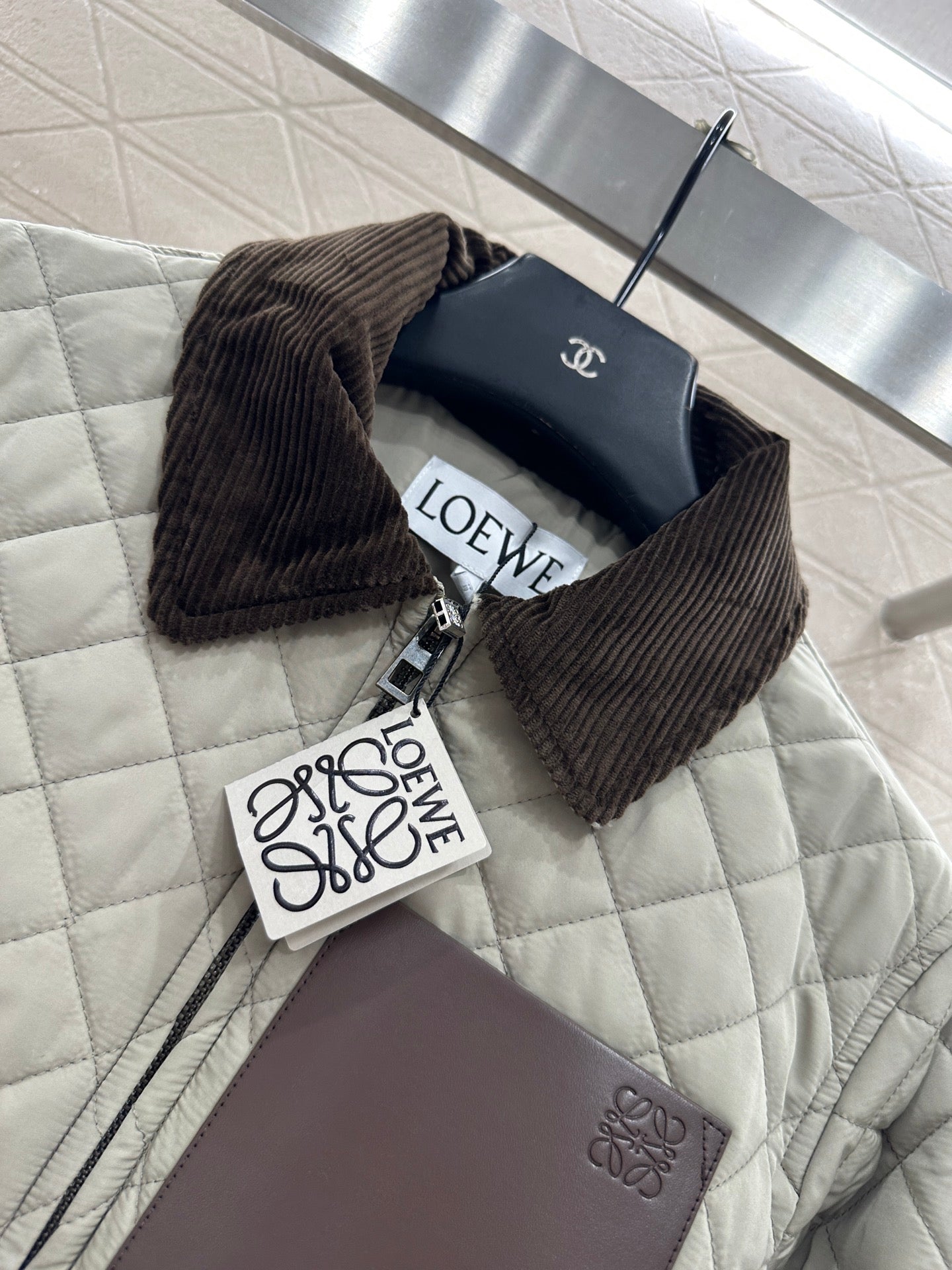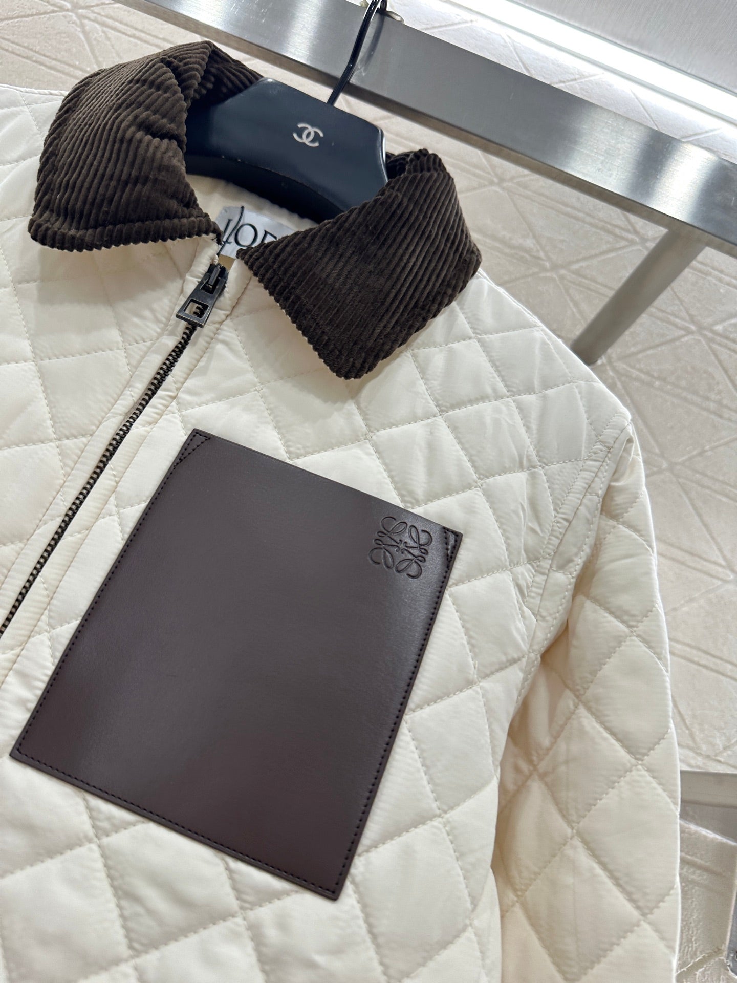 Windproof and waterproof nylon material, with down cotton filling inside, the whole piece is lightweight and warm. The corduroy collar collides, and the threaded edging at the hem echoes the color. The lapel zipper jacket has a diamond grid embossed pattern throughout, which echoes the leather engraved totem logo on the chest, presenting the brand concept and showcasing luxury charm. Loose styles are inclusive and fashionable, exuding a trendy and Western style.