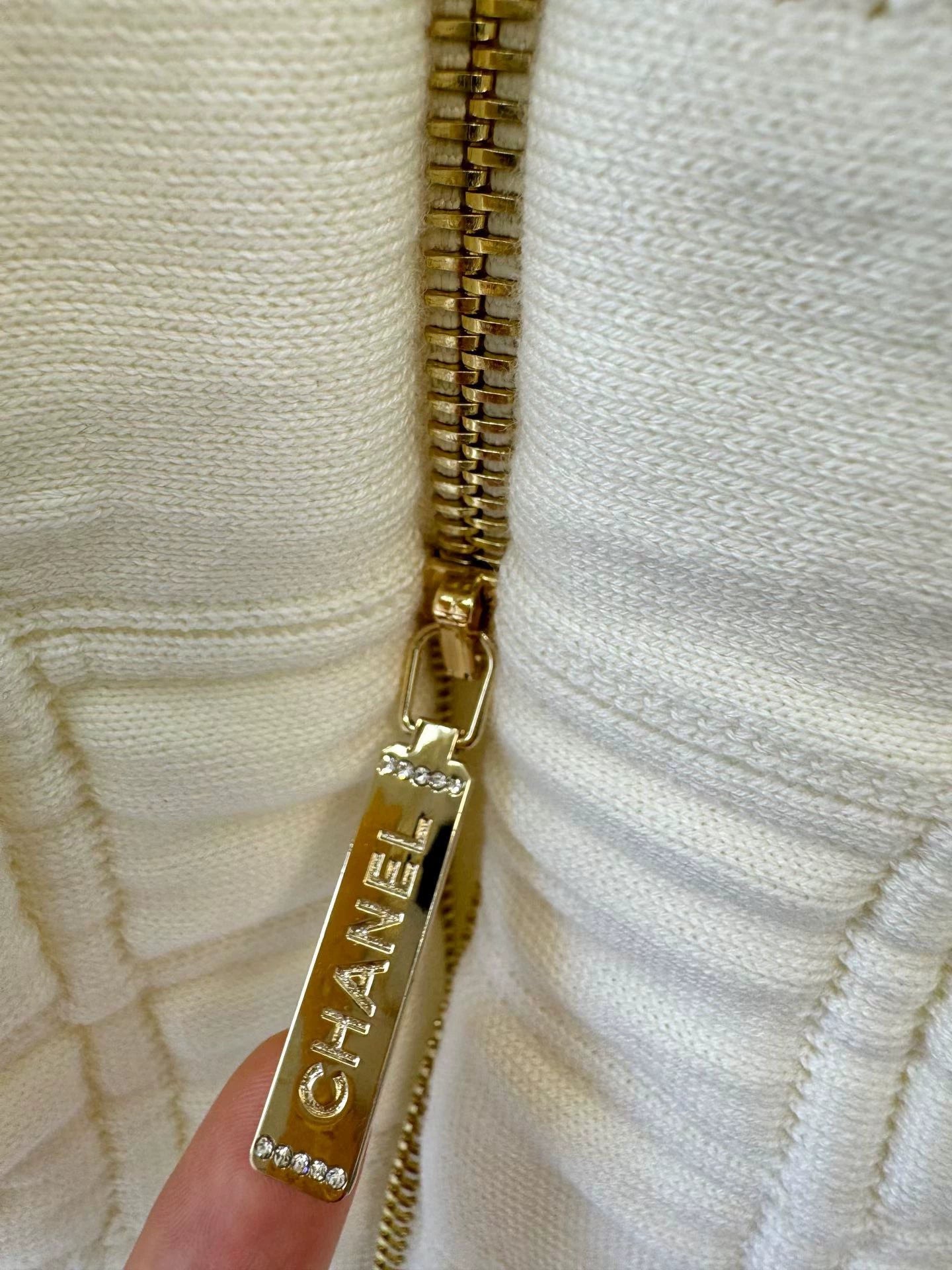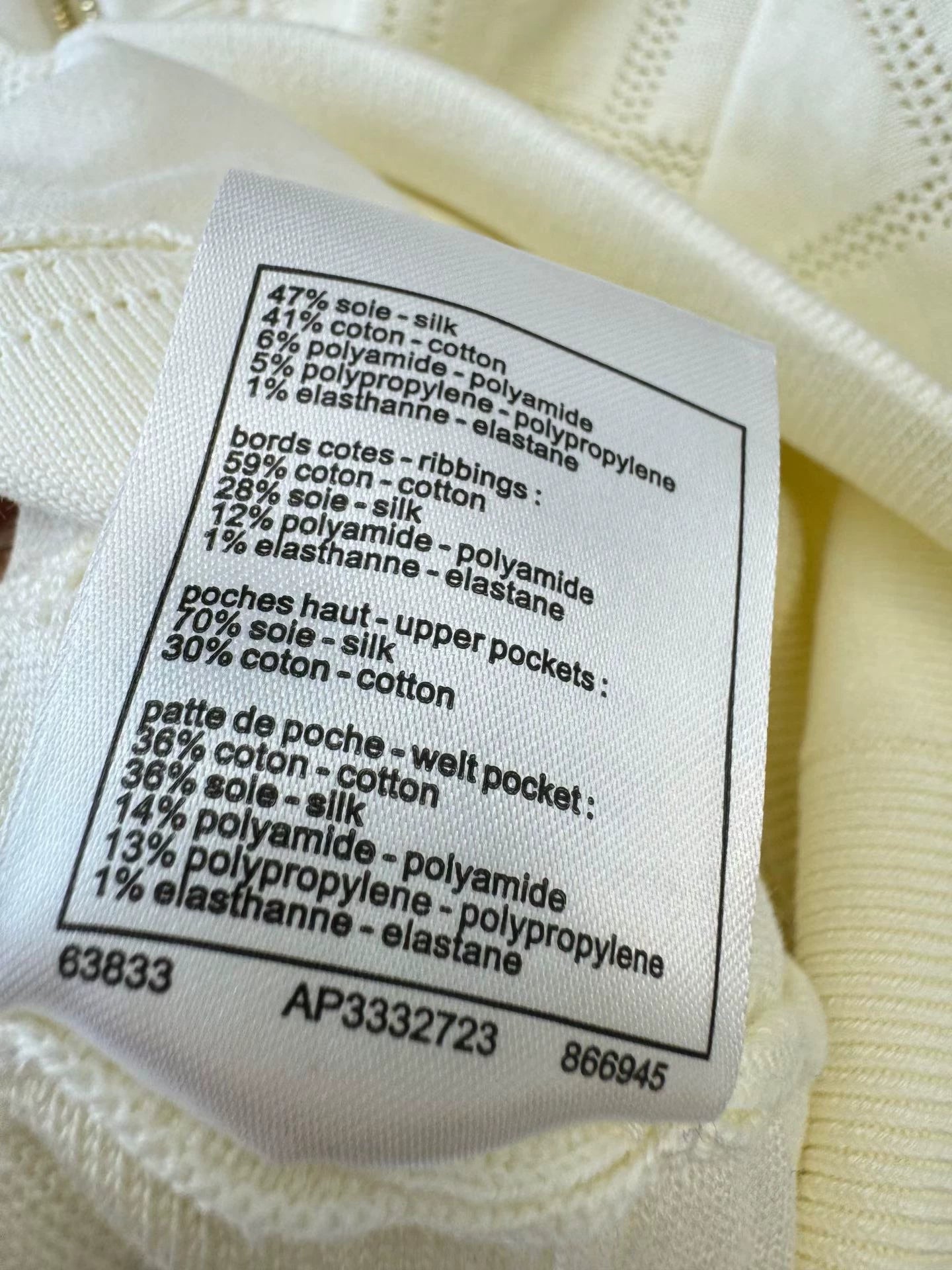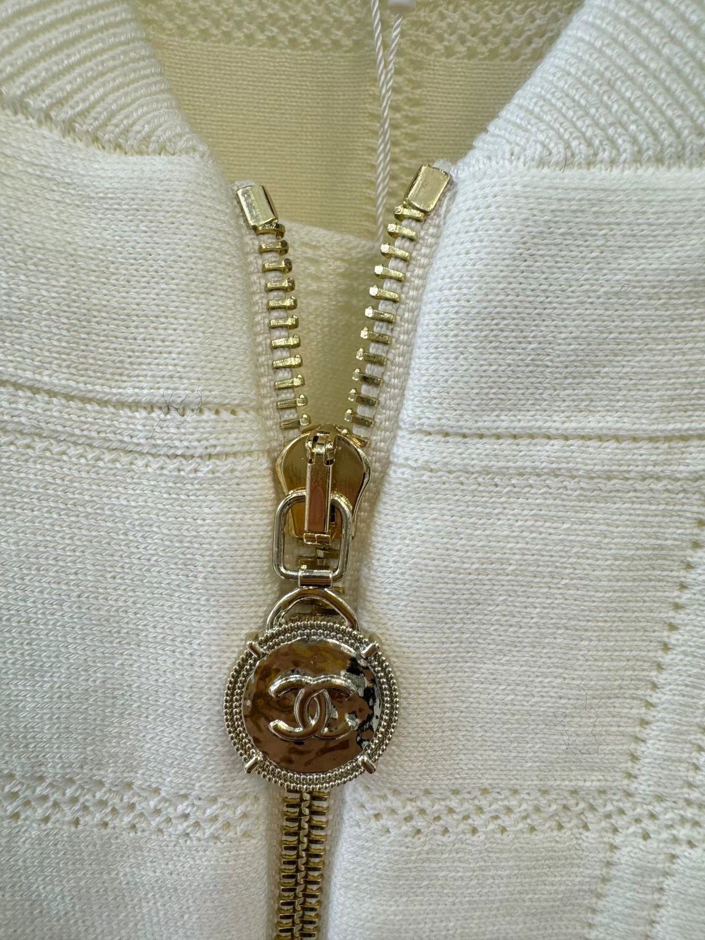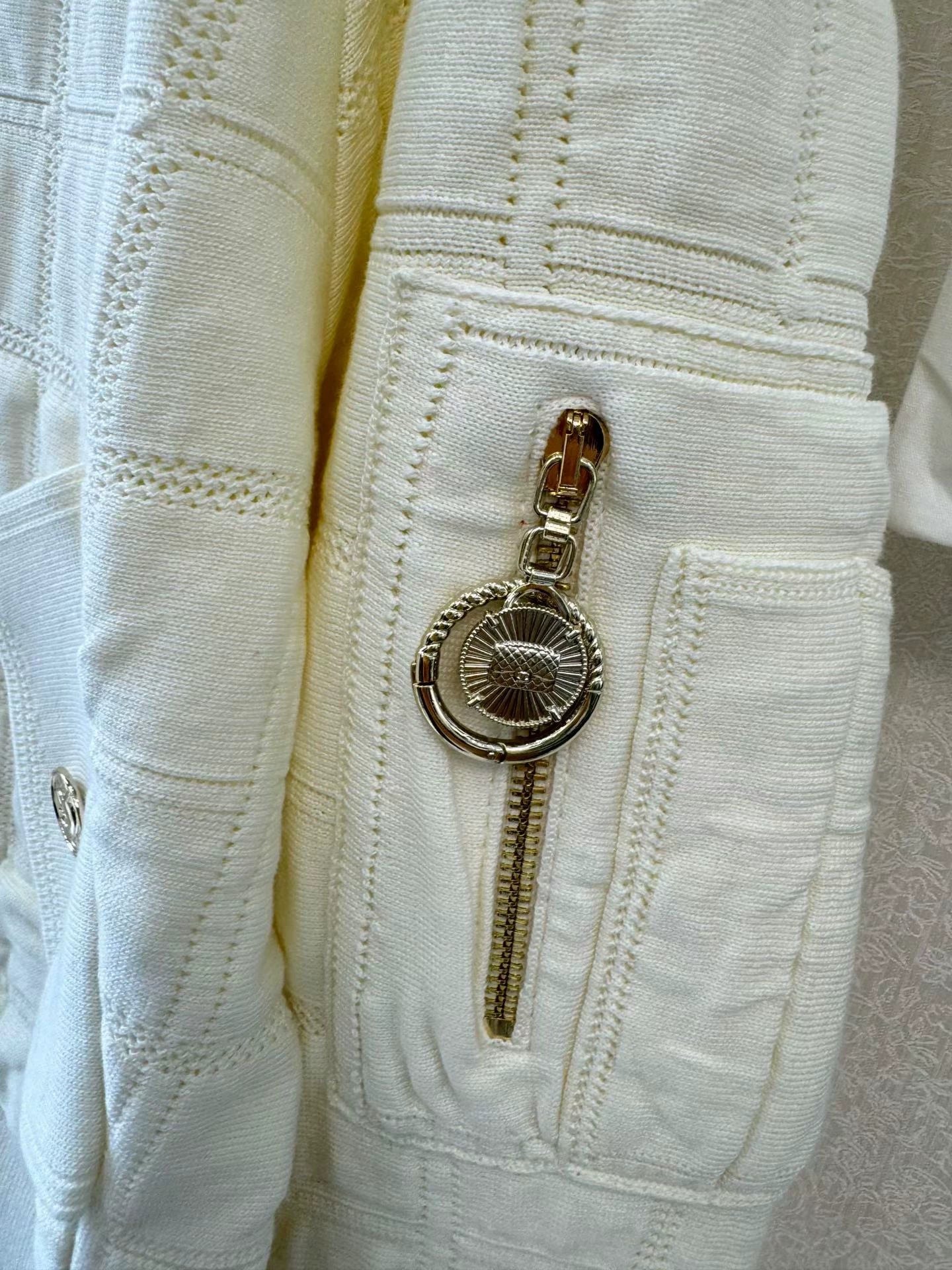 Classic diamond grid pattern, gold zipper and double C logo, metal buckle cuffs, double chest pockets, exquisite details. The fabric consists of 47% mulberry silk, 41% cotton, 6% polyamide, 5% polypropylene, and 1% spandex, providing a comfortable touch and versatile for autumn and winter.