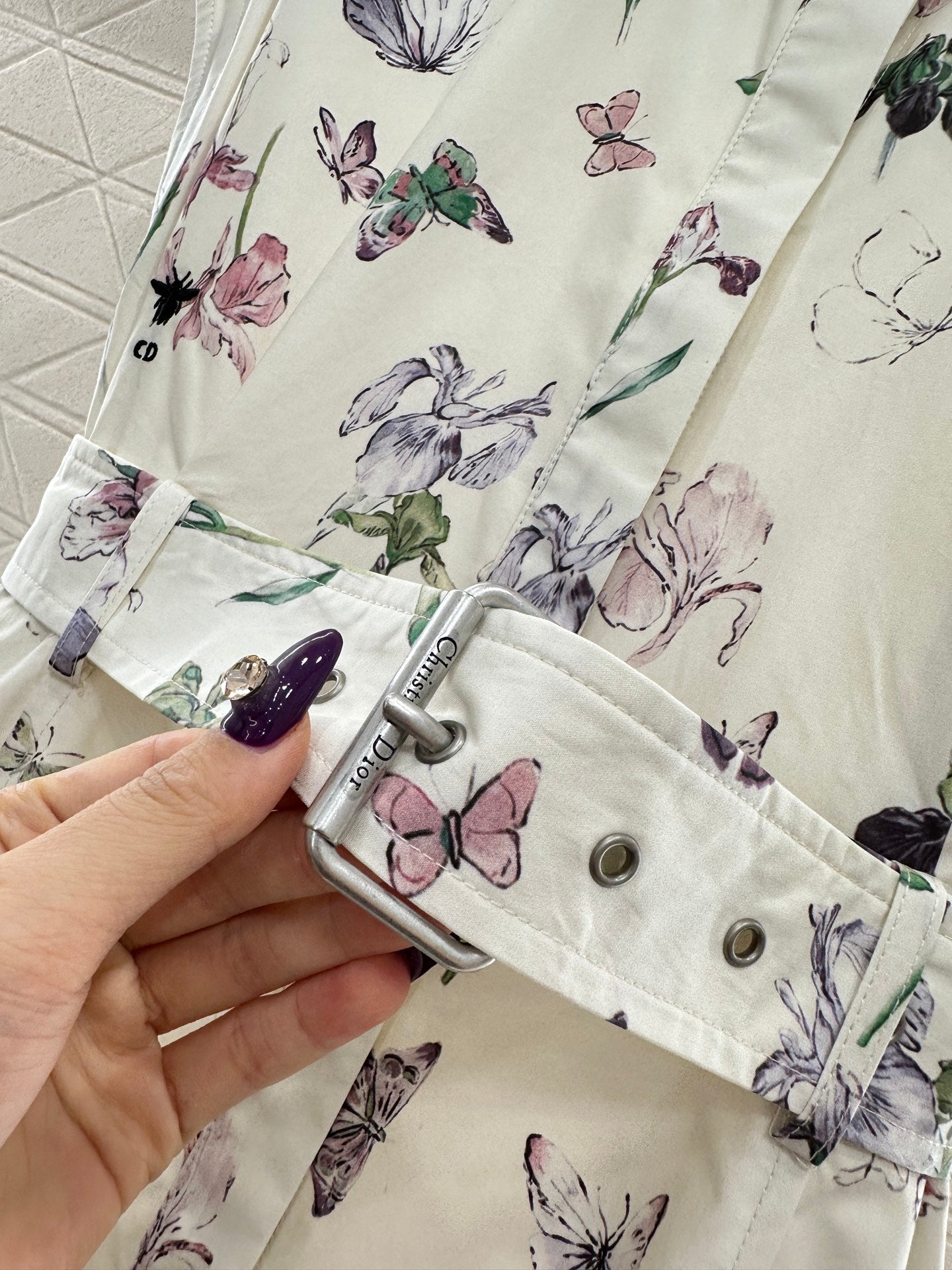 Made of all cotton material, the texture is smooth and comfortable, moisture absorbing and breathable. The short sleeved dress with a collar is cut, with a beige base throughout and colorful flowers added ➕ Butterfly decoration, sweet and youthful, loose cut, CD bee embroidery around the waist, matched with this cloth waistband for tight adjustment, highlighting proportion, modifying the figure, elegant temperament, enhanced by the bee CD logo around the waist, obvious brand style, suitable for daily commuting