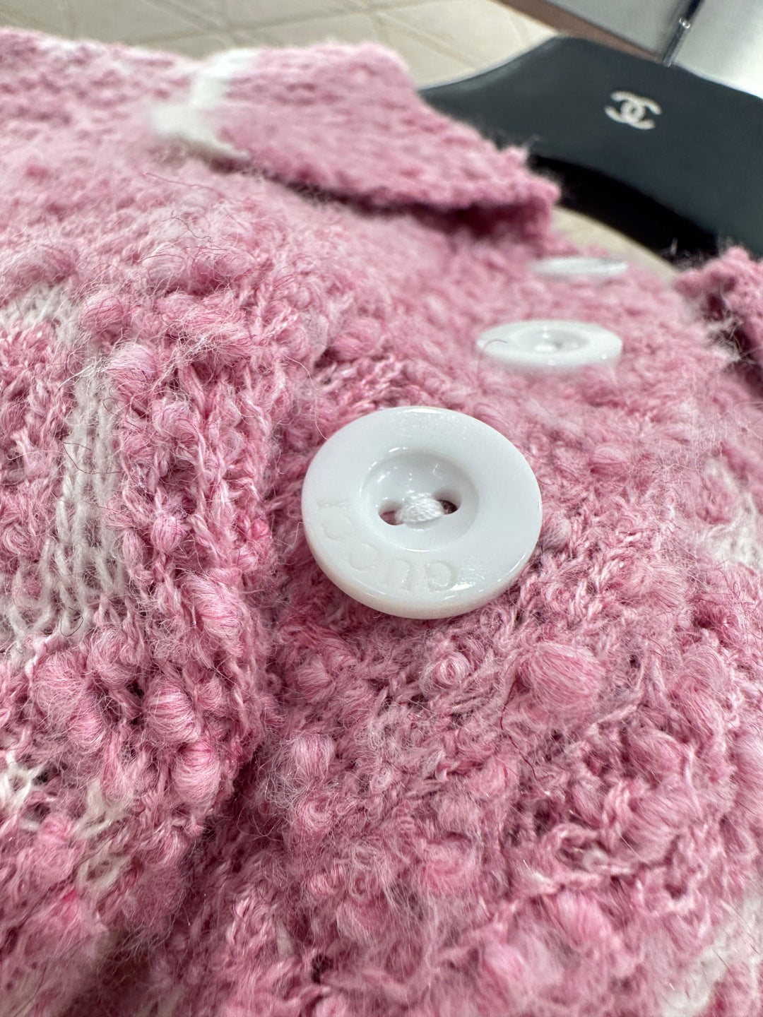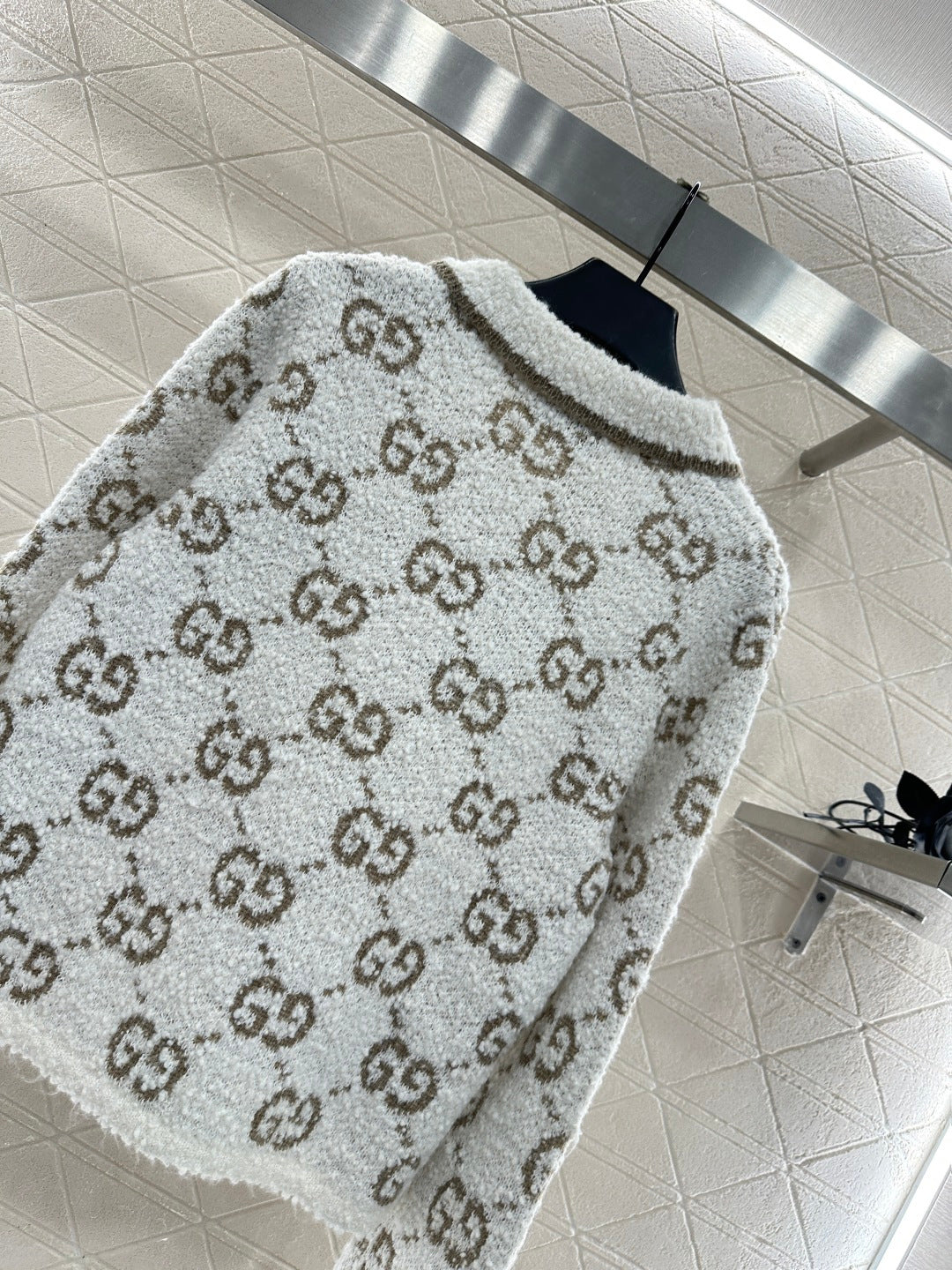Woolen yarn weaving, process treatment, obvious graininess, superior texture, lapel knitted long sleeved sweater, threaded edge narrowing, white collar edge outlining, full attention to detail, western-style charm, large body double G jacquard embellishment, creating brand style, loose body cut, inclusive wearing, reducing age and showing whiteness