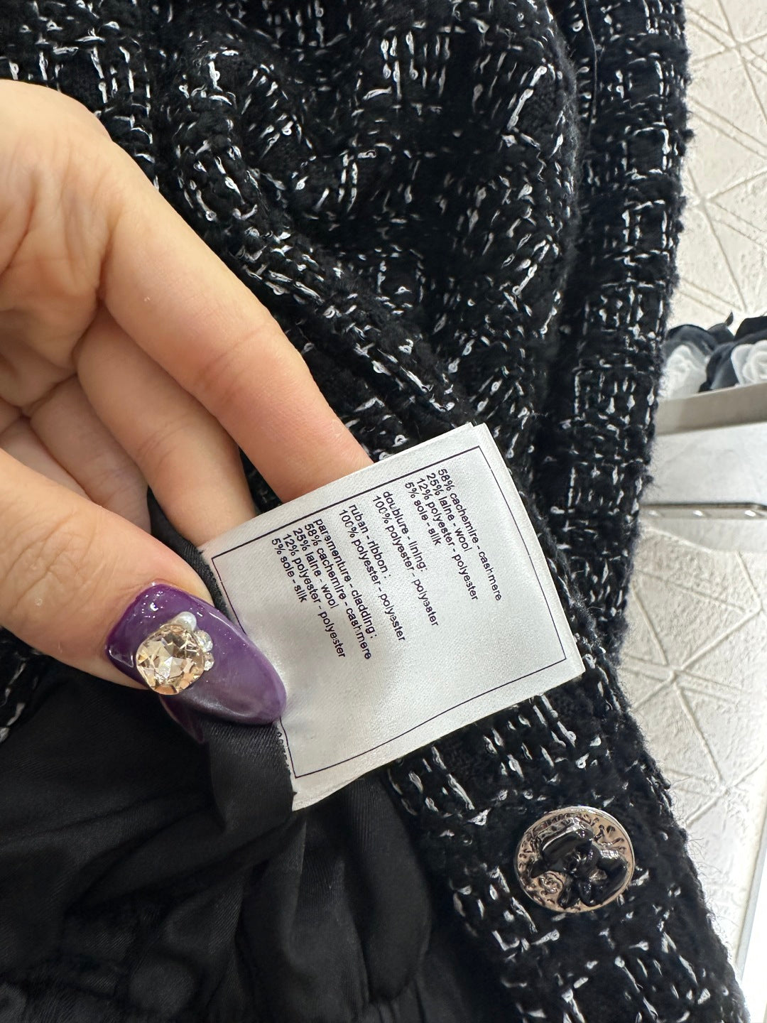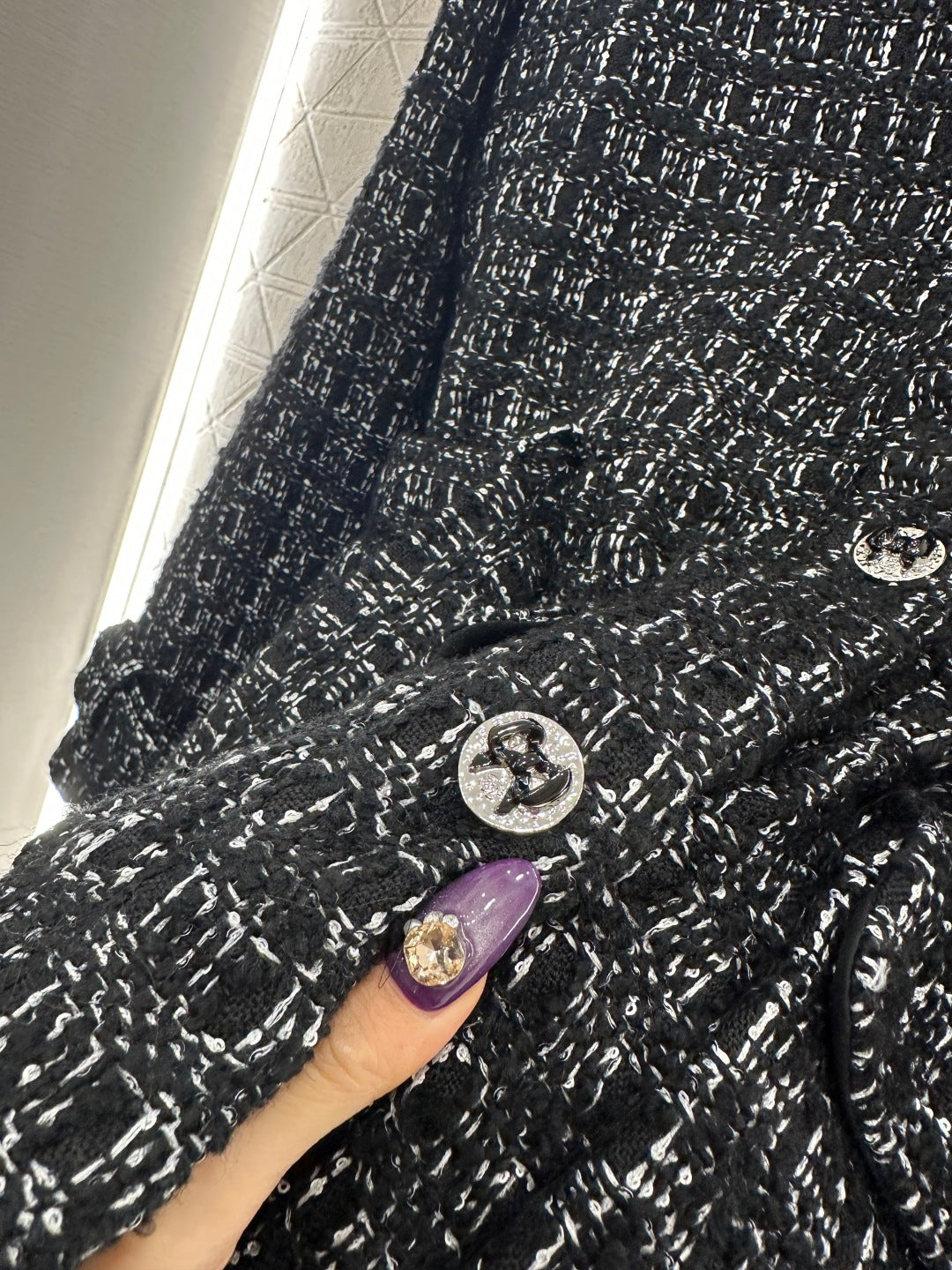 Made of coarse woolen fabric with obvious texture and visible to the naked eye, the texture is superior. The coarse striped woolen fabric creates a model of socialite style, with a stand up collar and shoulder jacket, a fake pocket design on the front chest, and a single row printed bow round buckle ➕ Exquisite black and white woven texture, echoing the hidden jacquard lining inside, luxurious yet elegant. The cuffs and cuffs are turned over to create a black plain surface that echoes the chest. The waistband is cut to outline the curve, making it look slim and stylish. It is the first choice for fashionable autumn and winter outfits, with a gorgeous temperament