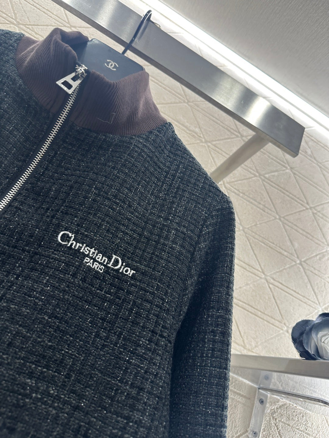 Coarse tweed material, with obvious texture and comfortable texture. The jacket is cut with a solid carbon black base, and the coarse floral weaving texture is highlighted. The chest letter logo is lit up, giving it a low-key and fashionable feeling. Combined with the deep brown elastic thread on the collar and cuffs, it fits snugly against the body and looks neat. The overall tone is full, easy to match, and it is a high-end and fashionable style