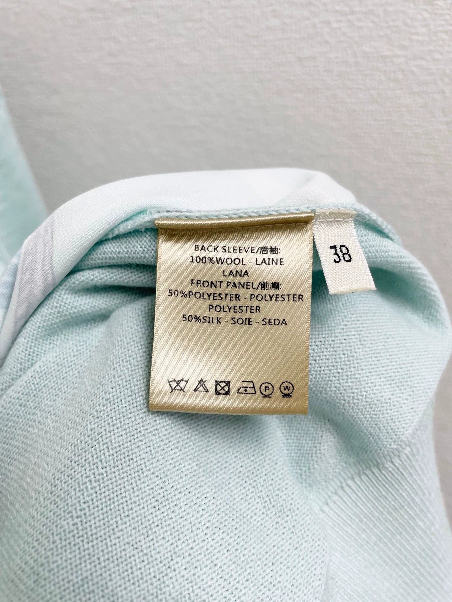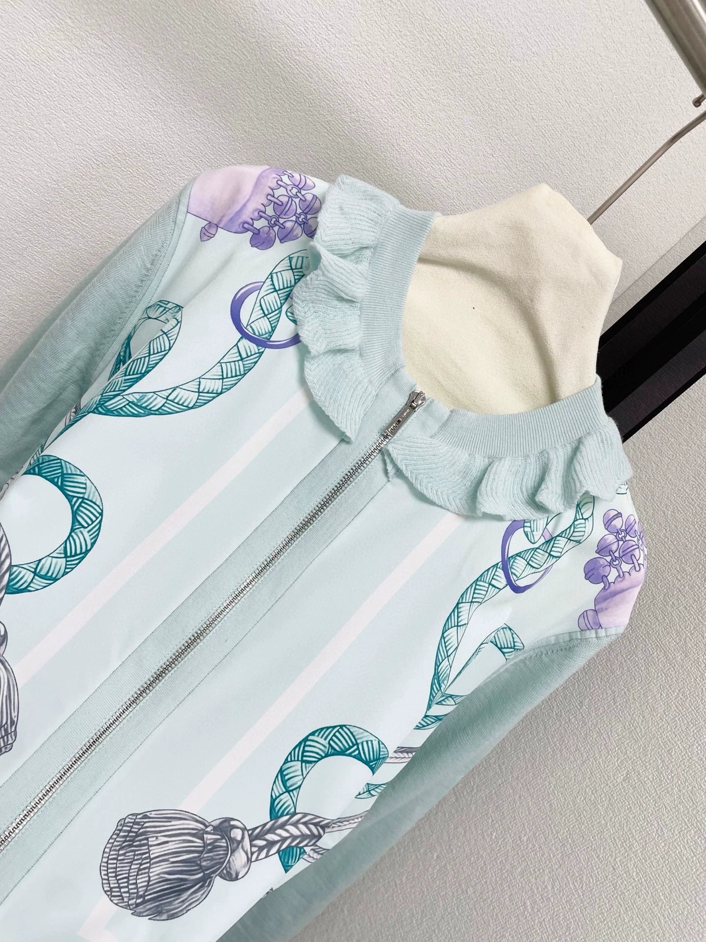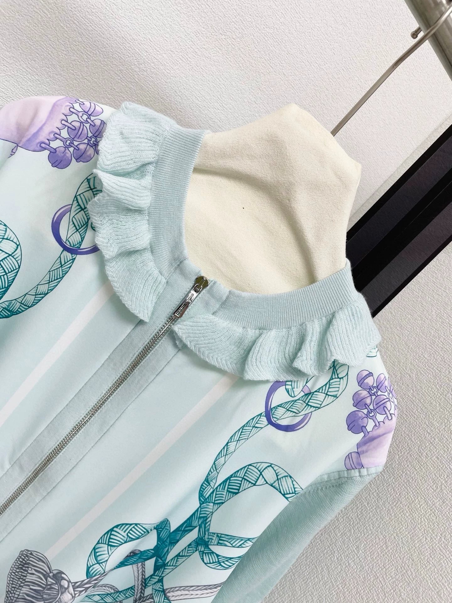 The front is made of silk spliced wool fabric, the back is made of pure wool, with exquisite rope printed patterns, a ruffled round neck design, and an H-shaped zipper.