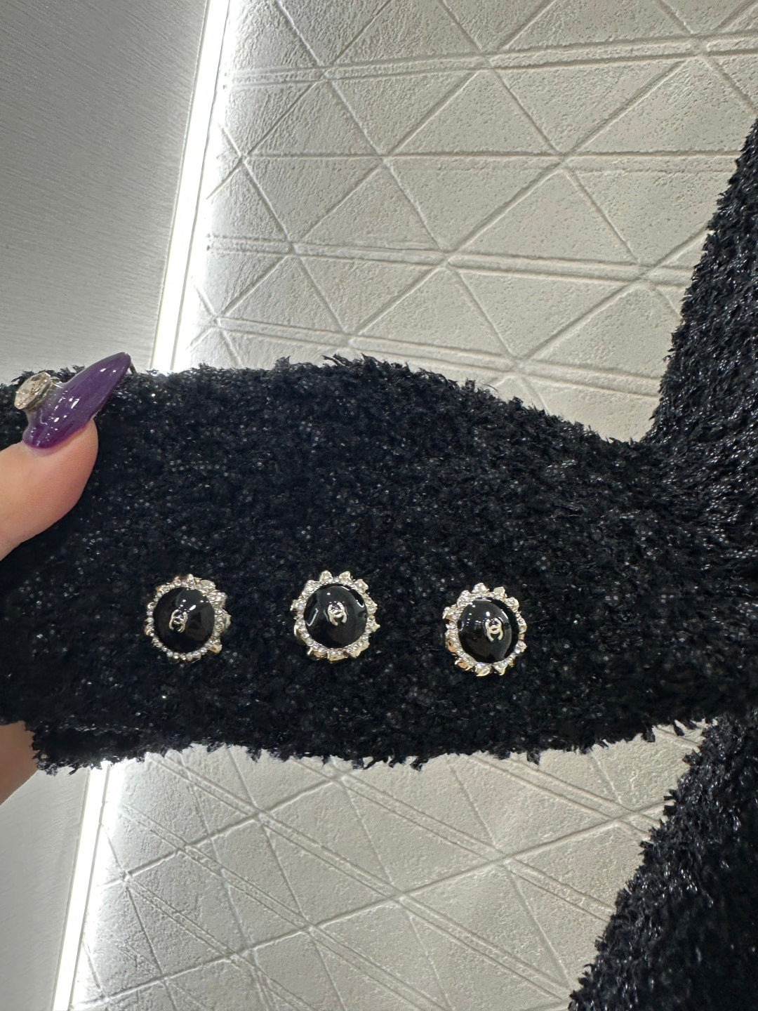 Made of high-quality woolen fabric, with a full appearance, this jacket features a stand up collar and a mid length design. It is cut with a three-dimensional waist closure, making it appear slender and upright. The front and cuffs are decorated with double C-buttons, and the entire body is black with silver yarn weaving texture, highlighting the socialite's style. The black silver series is distinguished by its luxurious texture, and the lining is covered with dark jacquard patterns, making it a smart and gentle outfit