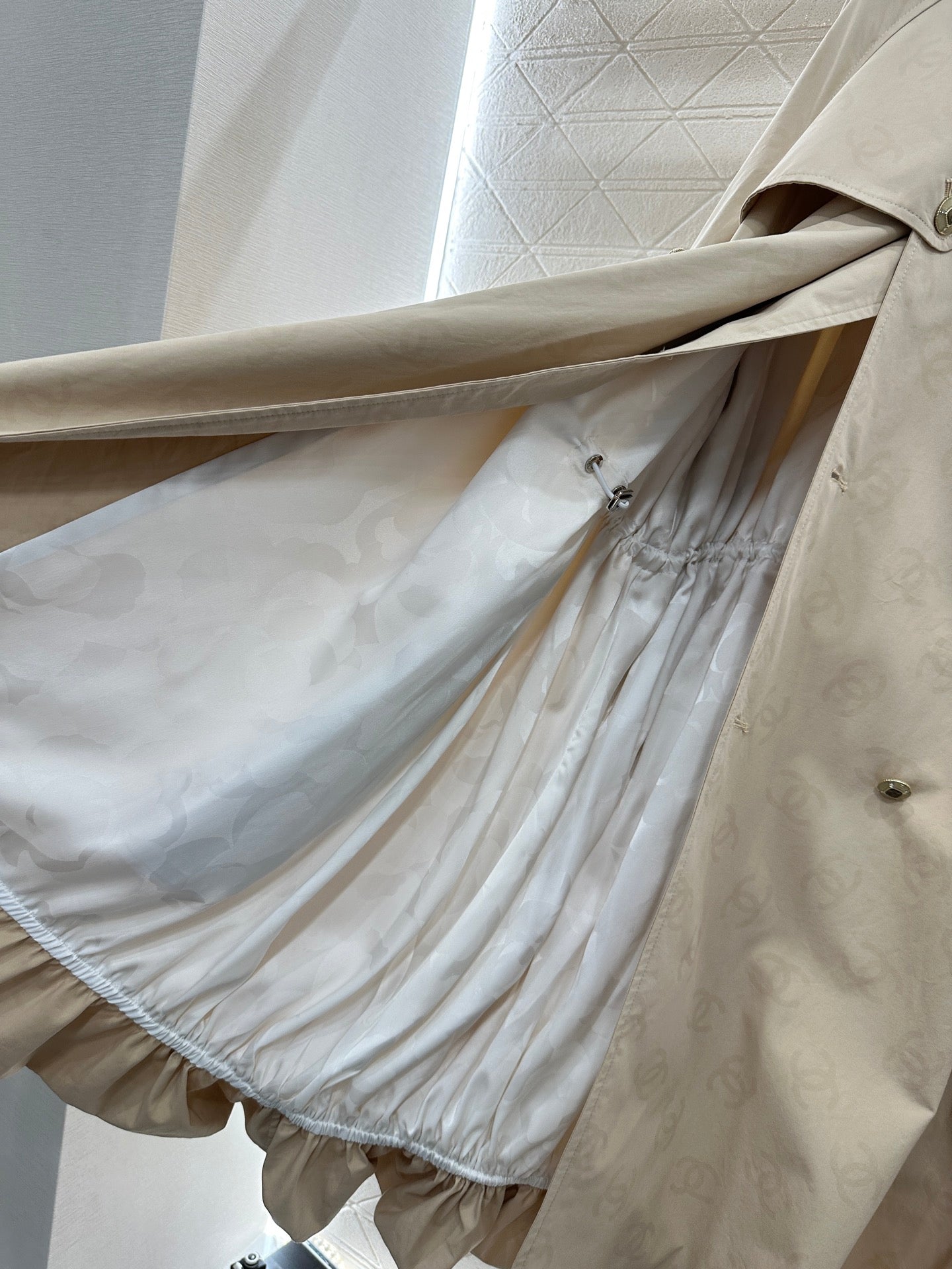Imported jacquard silk fabric material with its characteristics of micro elasticity, comfort, windproof luster, long windbreaker jacket. The design adopts loose shoulder and micro flying sleeve design, with a single-sided shawl integrated into various wearing methods to create a deconstructive style. The style is special and stylish, with double breasted buttons on the front and tied cuffs that echo the buckle decoration, and a drawstring at the waist to divide the proportion. The design is full of silhouette. The cut is slim and inclusive of daily wear, fashionable and relaxed, suitable for different occasions ⚠️ YB development encounters water jacquard double C, which is more obvious