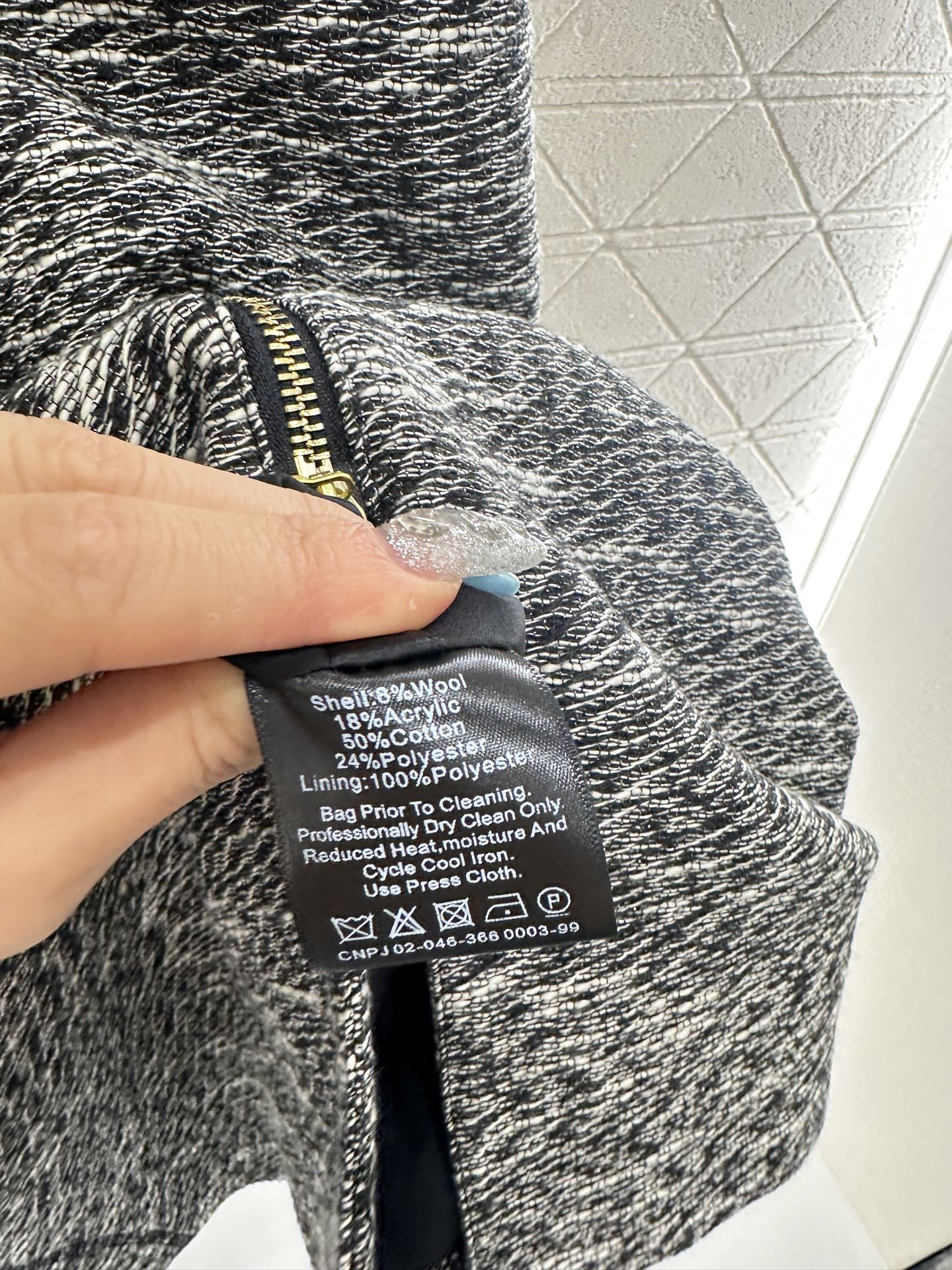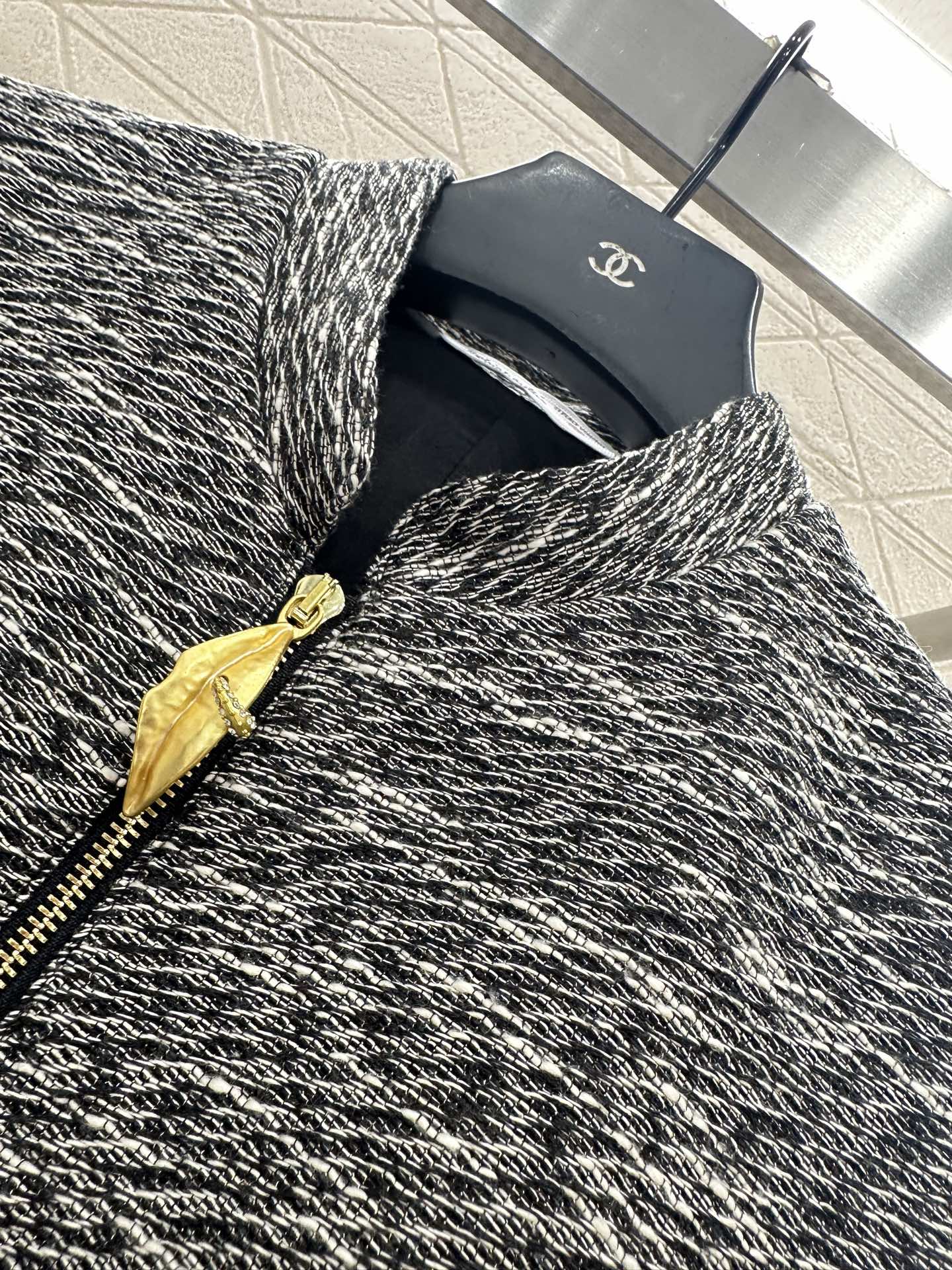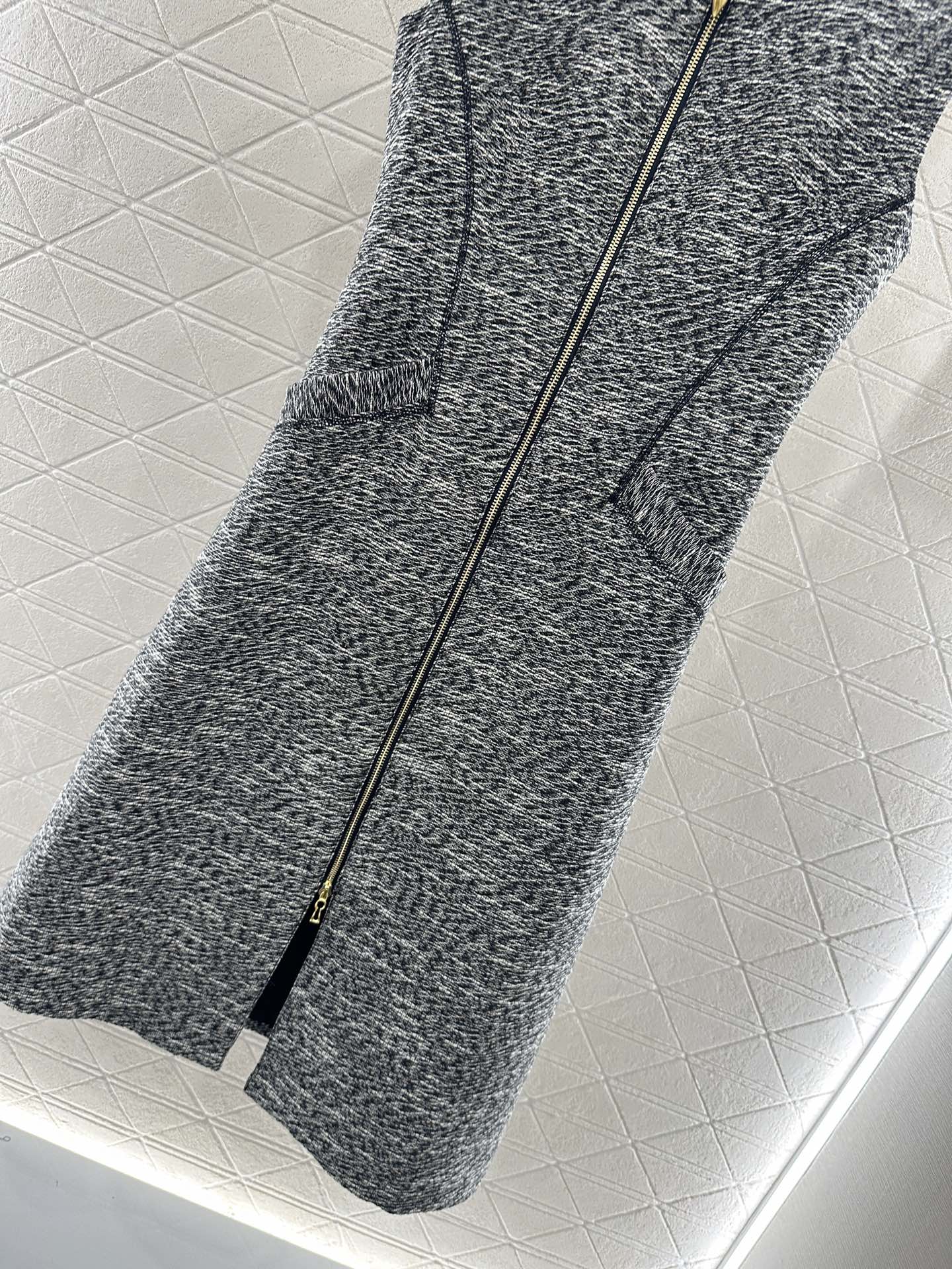 Made of imitation wool material, with excellent texture and appearance, this long sleeveless zipper dress features a timeless minimalist style, adorned with gold feather chain buckles and black contour lines, creating a fashionable and high-end atmosphere. Symmetrical pocket pockets with rich layers, floral grey color scheme highlights the brand style, stable and versatile, adaptable style is not limited, waist cinching design highlights the figure, high-end and relaxed, full of autumn and winter aura