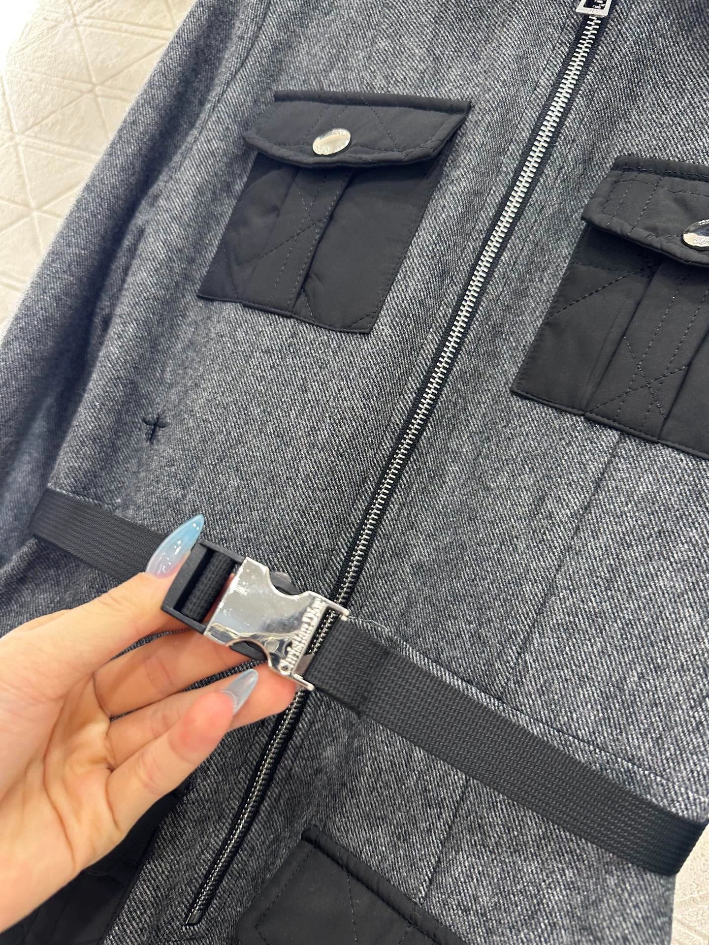 Tencel cotton material, premium texture, comfortable drape, semi open zipper dress design, neat and slim cutting, waist standing cut for a slimming effect, matched with a waistband outline, highlighting the proportion advantage of short top and long bottom, bee logo at the waist highlights the brand's delicacy, multiple symmetrical pockets are decorated with contrasting colors, the skirt is neat and pleated, and the upper body is full of fashionable workwear atmosphere. The dress can be easily worn for daily commuting and vacation, creating a stylish look