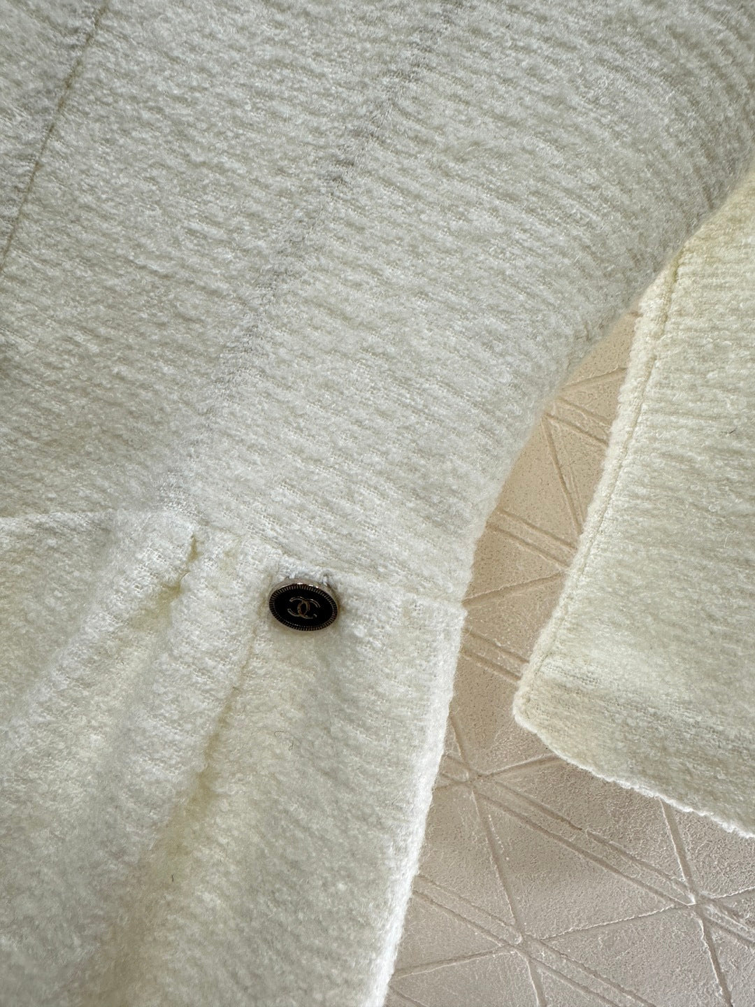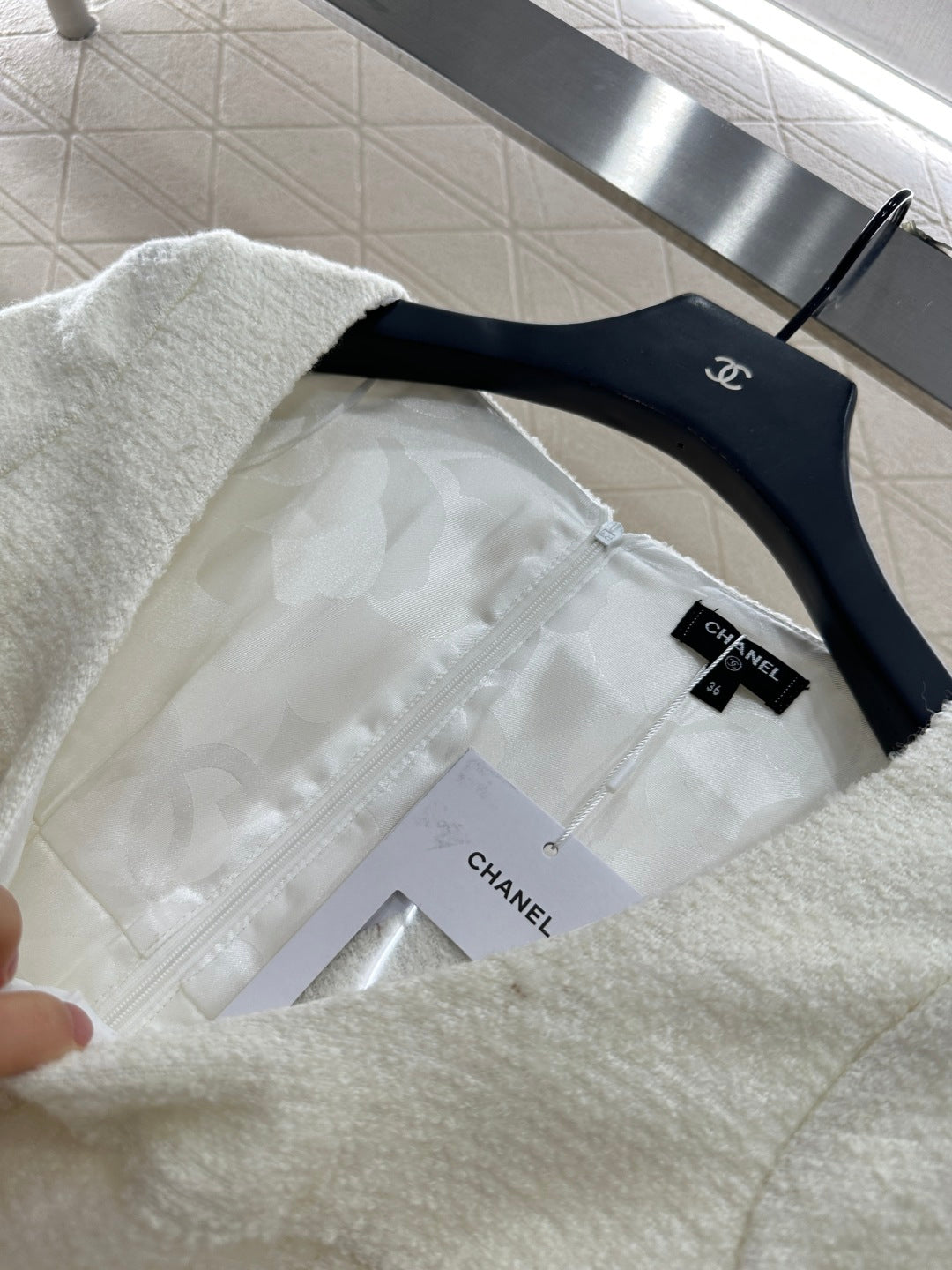 Wool wool material texture, high-end dressing, stylish dress, socialite dress, tailored ready to wear, woven texture, wide round neckline to increase skin exposure, visually slimming the chest and waist contour, slimming and narrowing treatment, full of eye-catching highlights, double C logo on the waist side to add charm and temperament. It highlights the details of the slim waist and the split proportion of the long sleeves to show the temperament