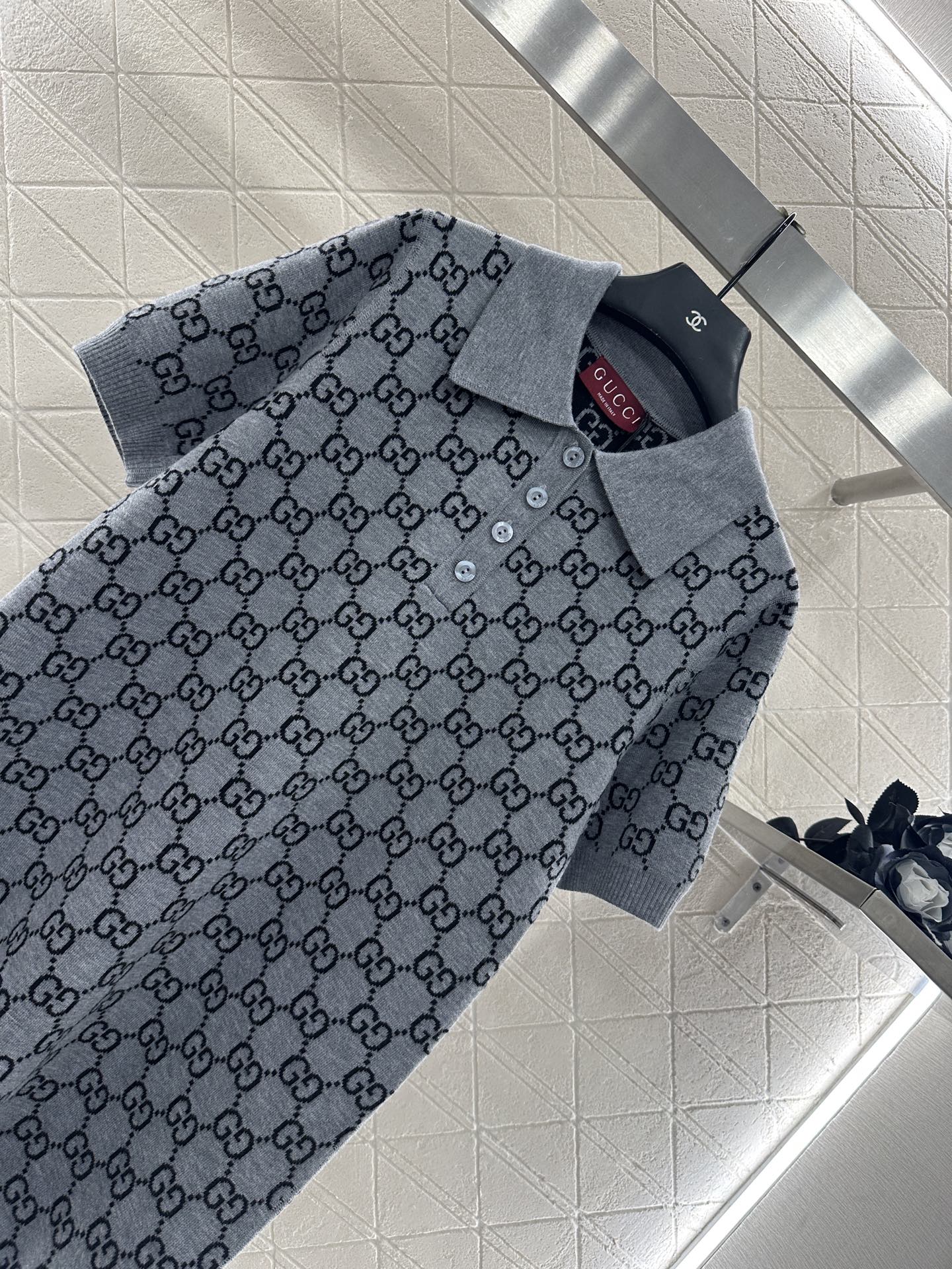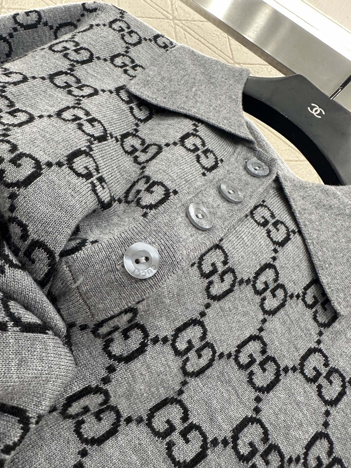 Custom YB wool yarn weaving, superior texture, comfortable to wear, lapel knitted short-sleeved dress version, half-open button design, the garment is narrowed with threaded hems, the hem is straight and inclusive, the design maintains a unified tone, the overall shape, high-end and fashionable, the large body is embellished with double G jacquard, creating the brand's unique fashionable style, wearing loose and slim. Customized fabrics and accessories